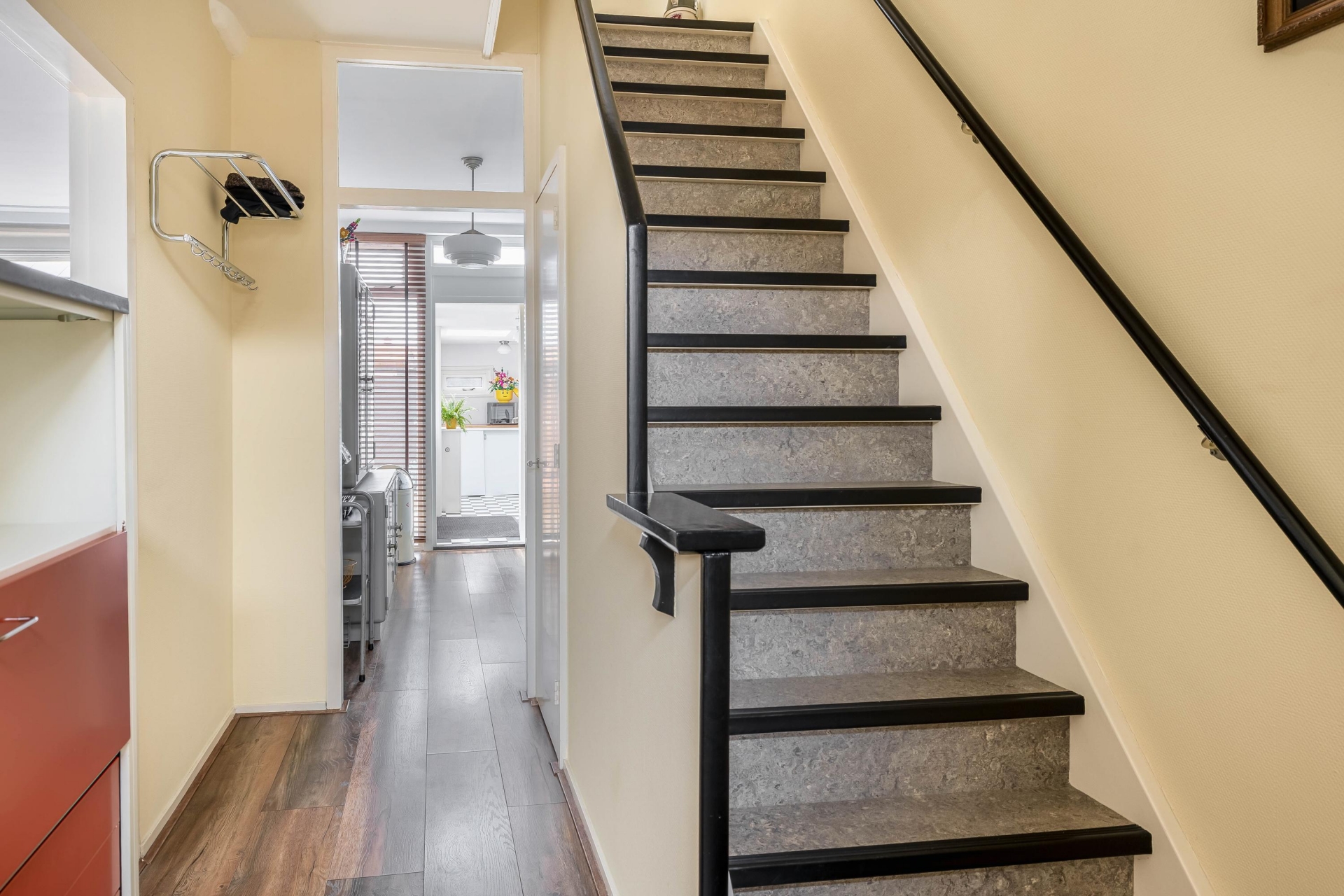 Wat direct opvalt is de prettige lichtinval in de doorzonwoonkamer, er zijn aan zowel de voor- als achterzijde grote raampartijen aanwezig. Het daglicht stroomt mooi naar binnen en geeft het geheel een open en ruim gevoel. De afwerking is netjes met een mooie laminaat vloerafwerking en strakke glasvlies wandafwerking.