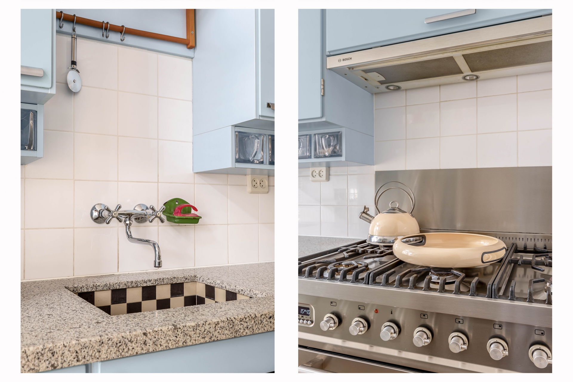 De keuken ligt aan de achterzijde en is uitgevoerd in een zachte blauwgrijze tint met een licht werkblad. De dichte keuken heeft een verzorgde en nette uitstraling. Je beschikt hier over voldoende kastruimte en diverse (deels vernieuwde) inbouwapparatuur. Vanuit de keuken kijk je door naar de bijkeuken met extra lichtinval via een lichtkoepel. Dit is een ideale extra ruimte met de opstelplaats van de was-apparatuur!