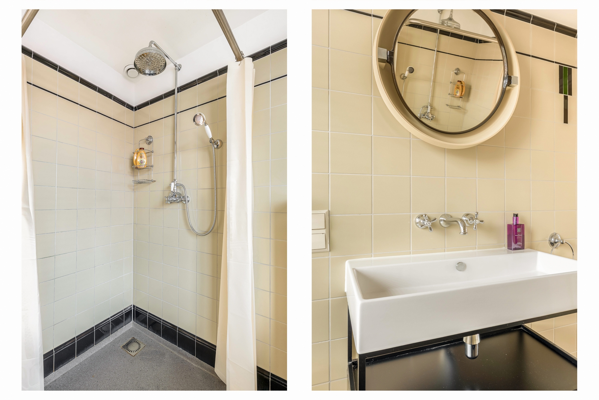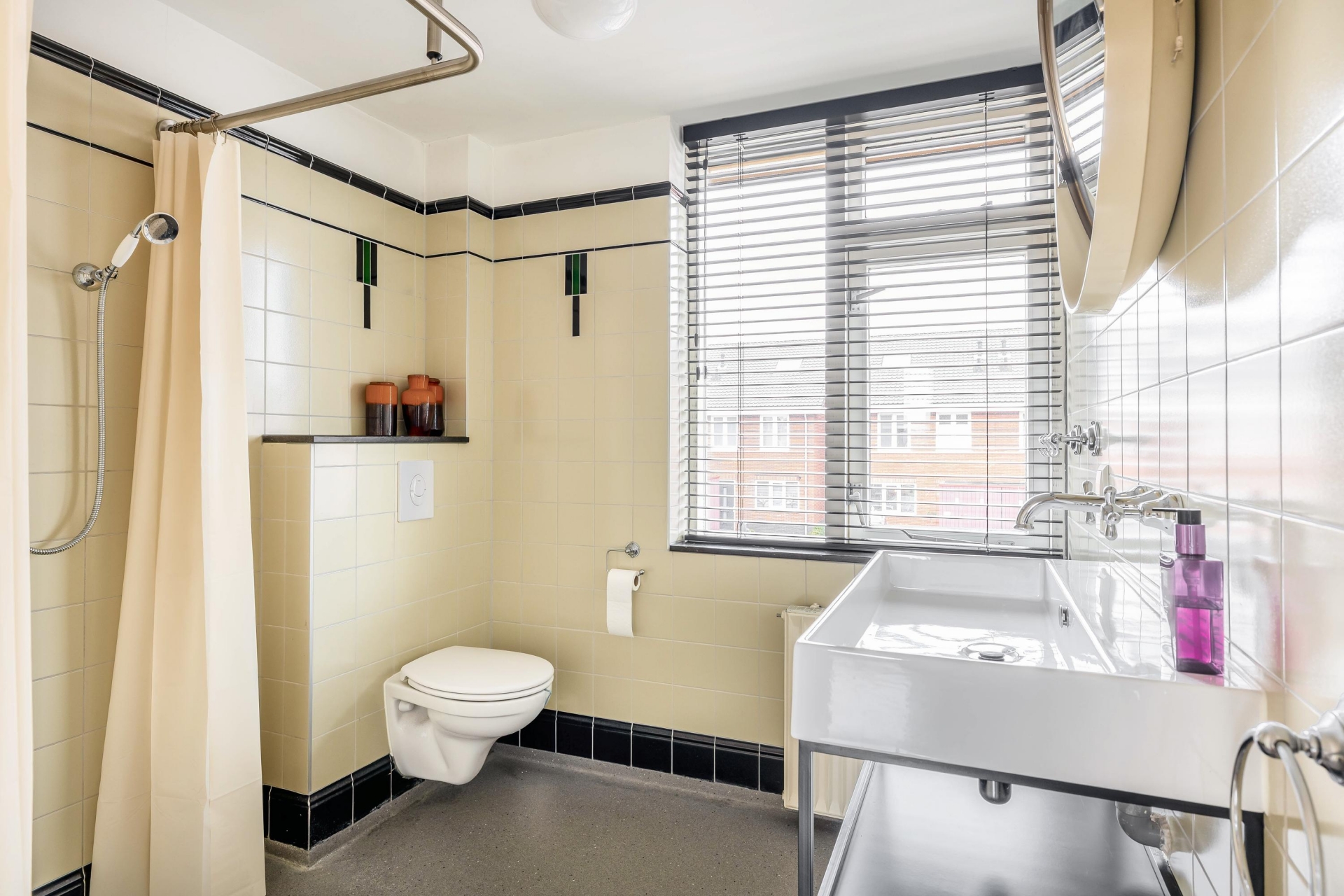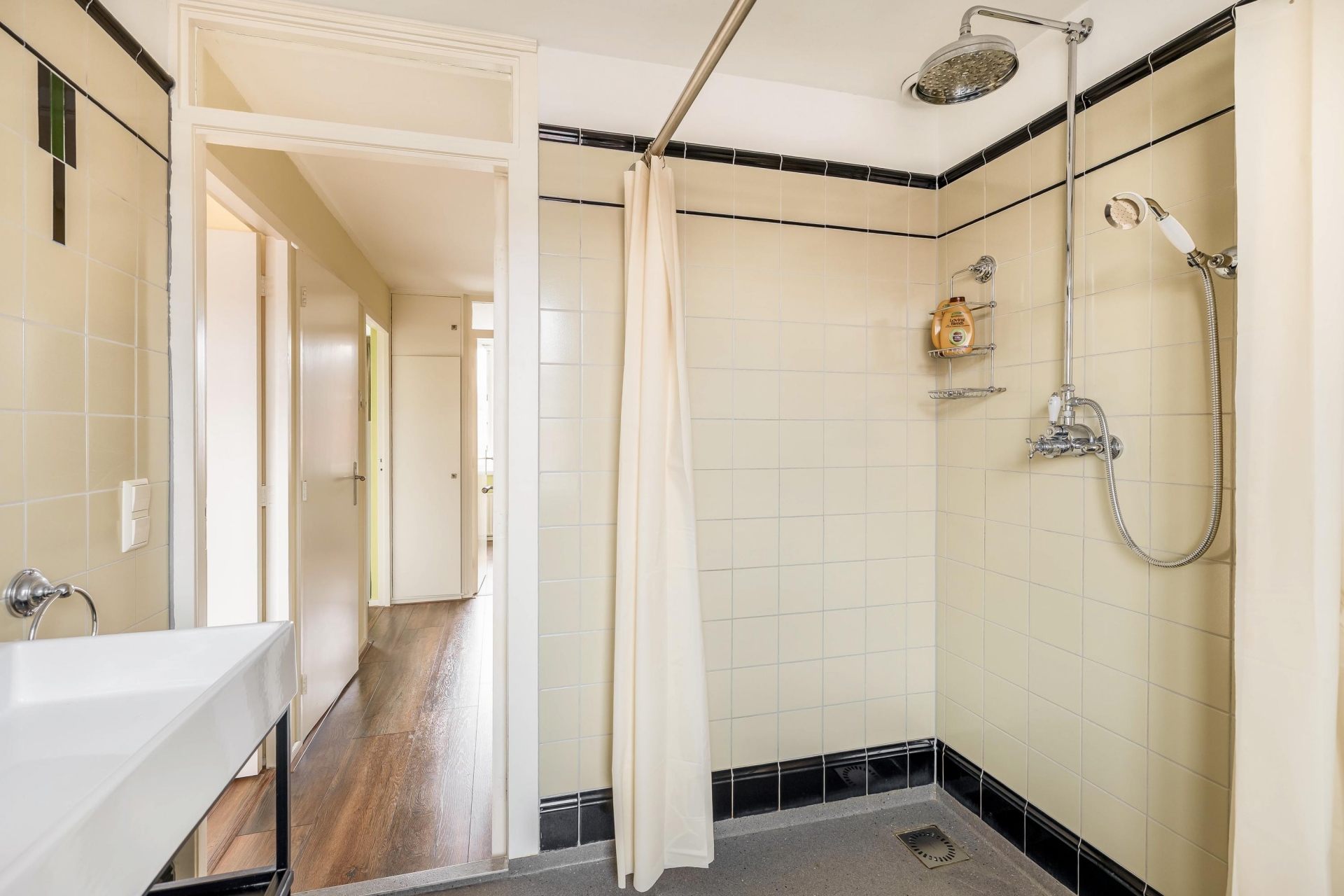 De badkamer is vernieuwd in 2019 en vintage uitgevoerd met een troffel betonvloer. Een ruime badkamer met inloopdouche, extra toilet en een wastafel, waar je voorlopig niets aan hoeft te doen!