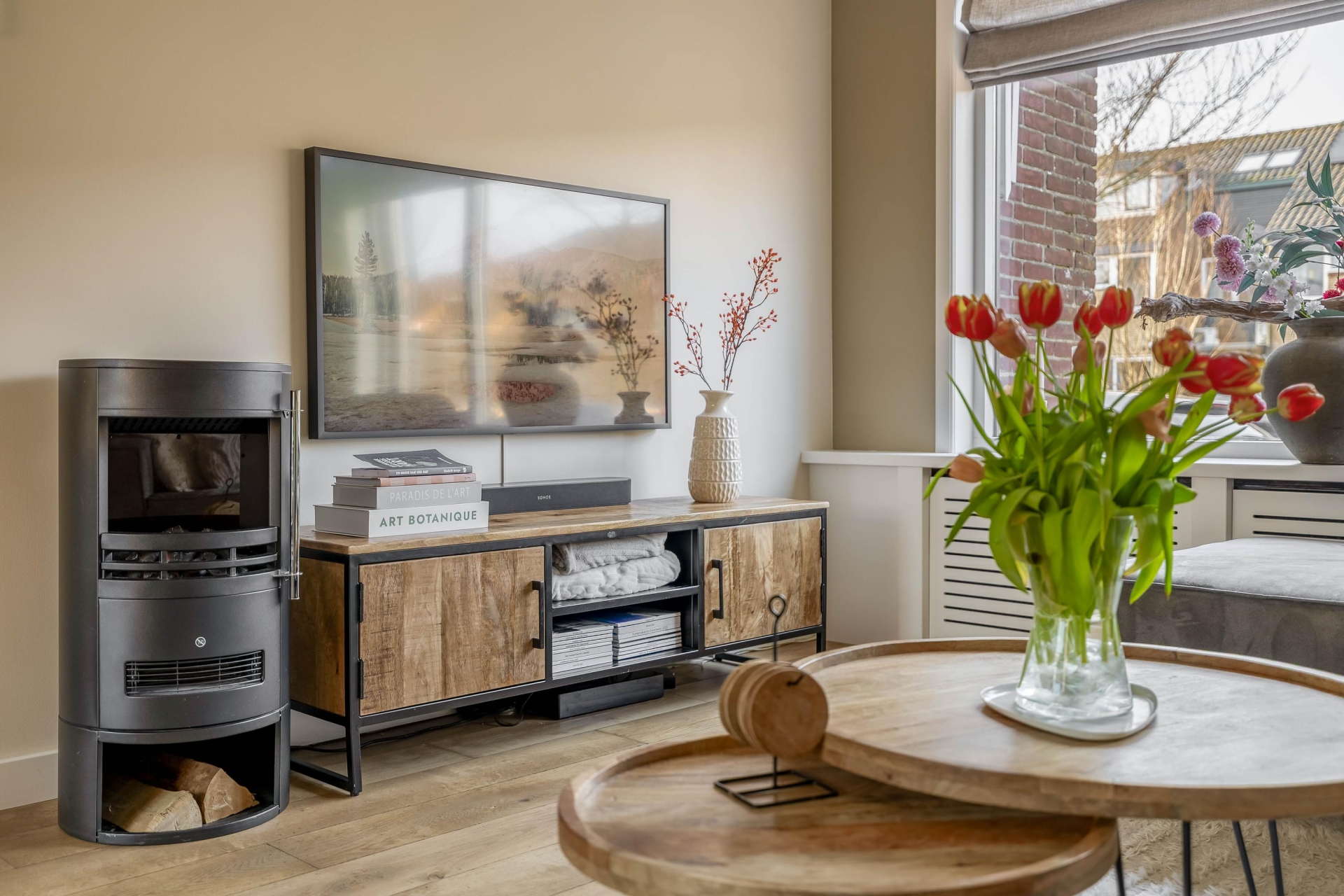 Zodra je binnenkomt merk je dat dit huis goed is onderhouden. De begane grond is in 2020 grondig aangepakt en dat zie je terug in de afwerking. De woonkamer is licht en sfeervol dankzij de grote raampartij aan de voorzijde. Vanuit de zithoek kijk je prettig uit over de rustige straat en het water aan de voorzijde, wat zorgt voor meer privacy. De wanden en het plafond op de begane grond zijn strak gestuukt en voorzien van inbouwspots, wat het geheel een moderne uitstraling geeft. De ruimte is praktisch in te delen met een comfortabele zithoek aan de voorzijde en een eethoek richting de keuken. De elektrische sierhaard zorgt daarbij voor extra sfeer tijdens de koudere maanden.