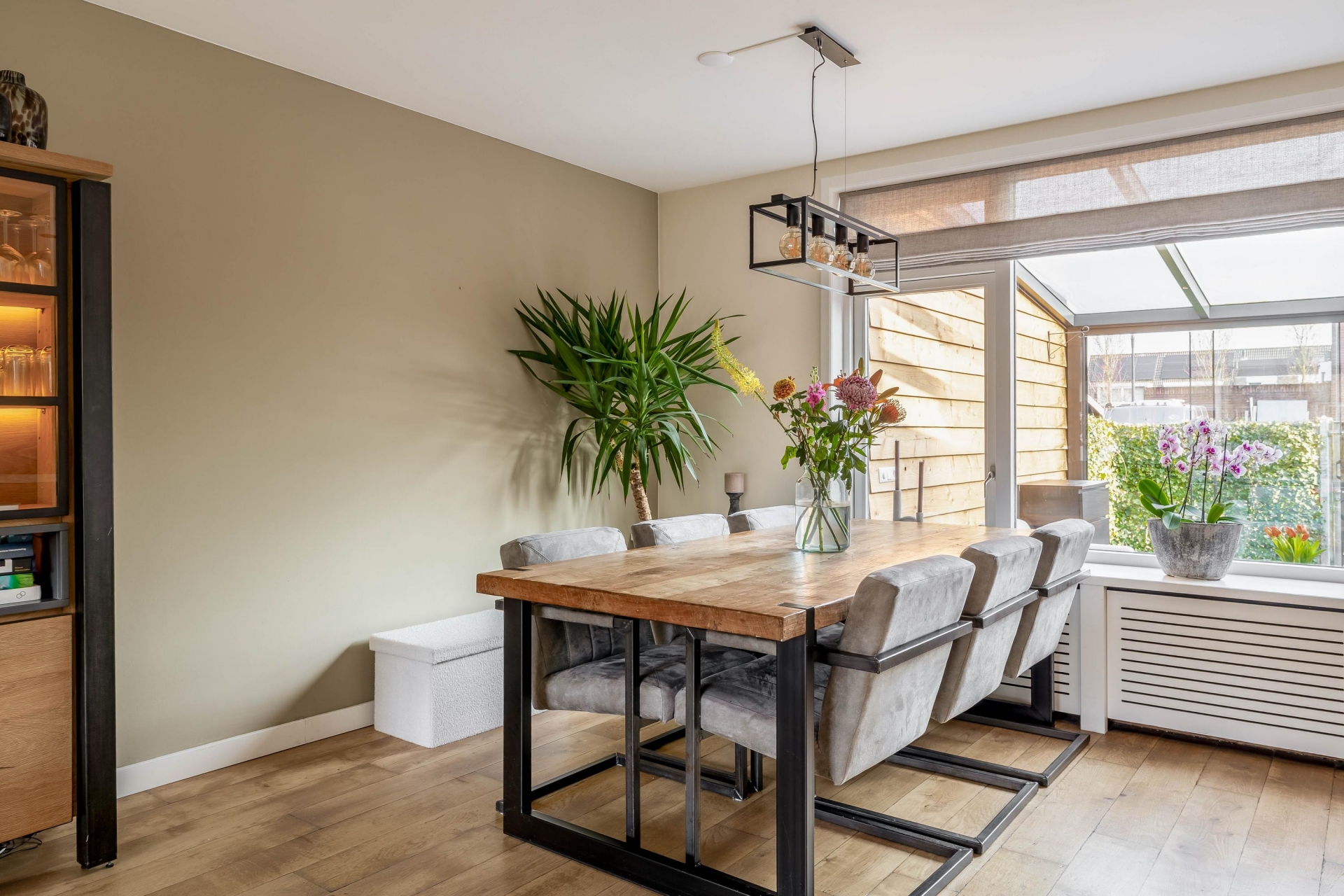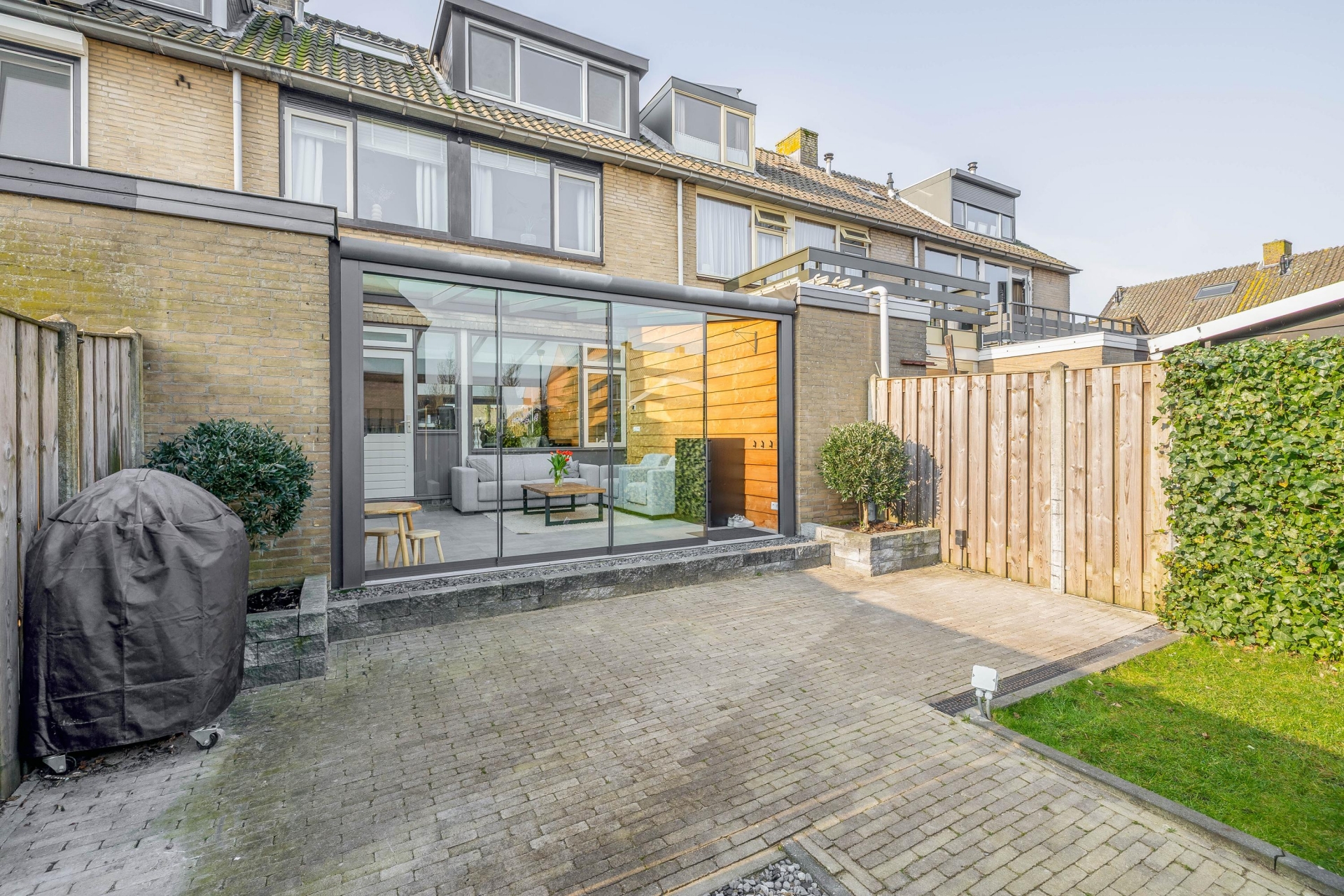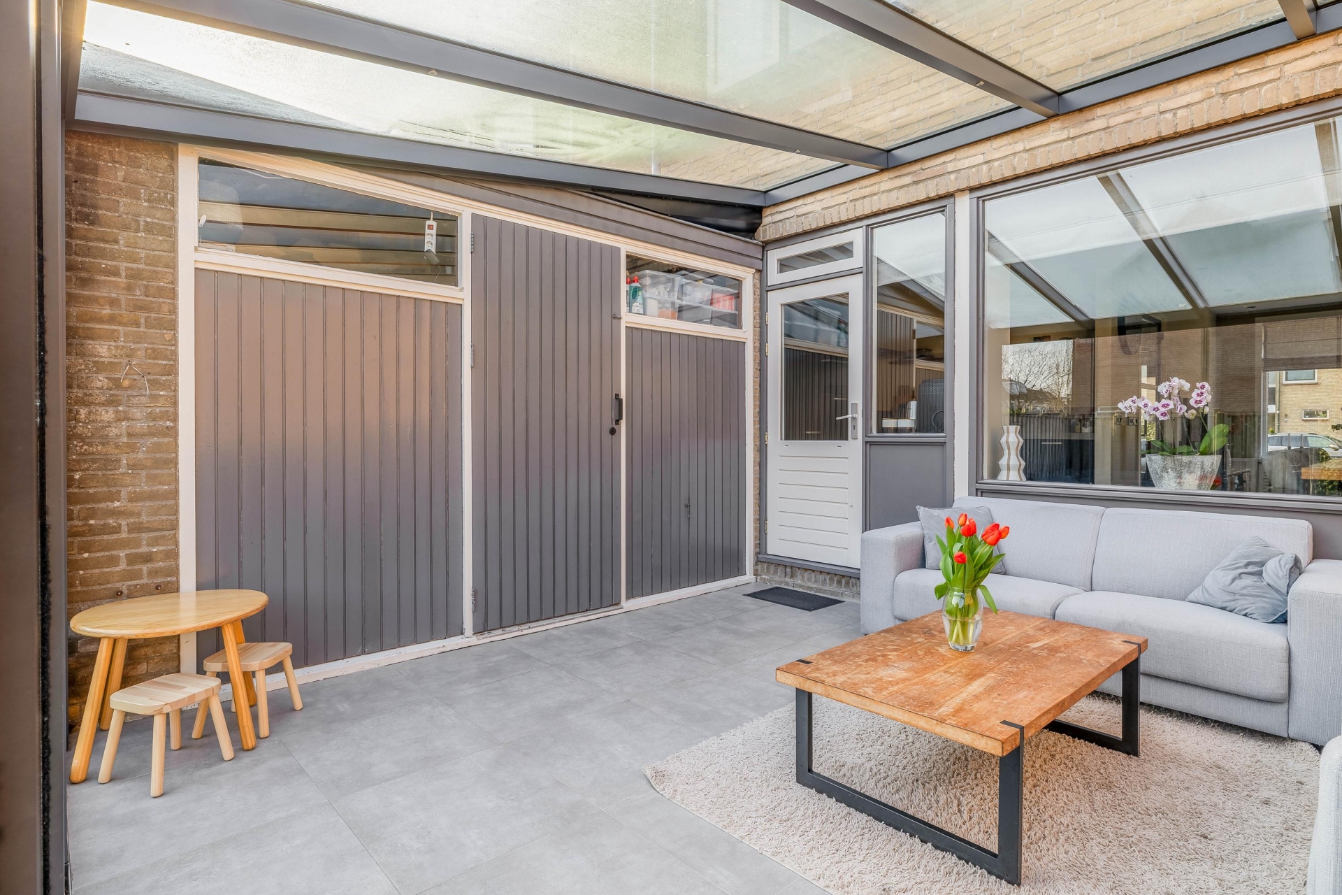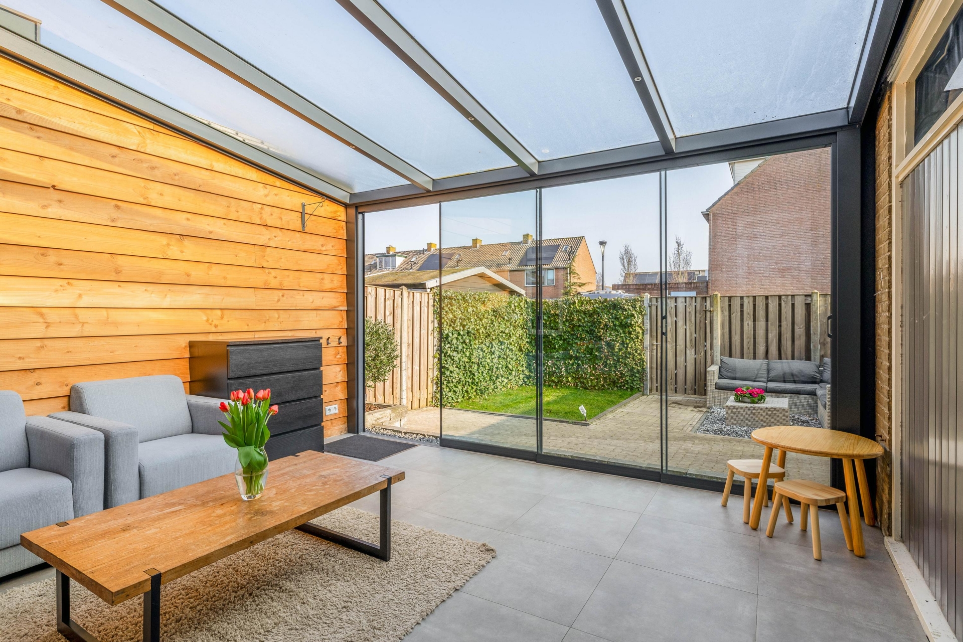 Een van de grootste pluspunten van dit huis is de serre aan de achterzijde. Deze is in 2022 geplaatst en volledig onderheid, waardoor het een solide en volwaardig onderdeel van het huis vormt. De serre voelt als een extra leefruimte waar je het hele jaar door kunt zitten. De grote glazen schuifpanelen zorgen voor veel lichtinval en een directe verbinding met de tuin. Op zonnige dagen zet je de panelen eenvoudig open en loopt binnen moeiteloos over in buiten. Hierdoor ontstaat een fijne plek voor een tweede zithoek, speelruimte voor kinderen of een rustige werkplek.