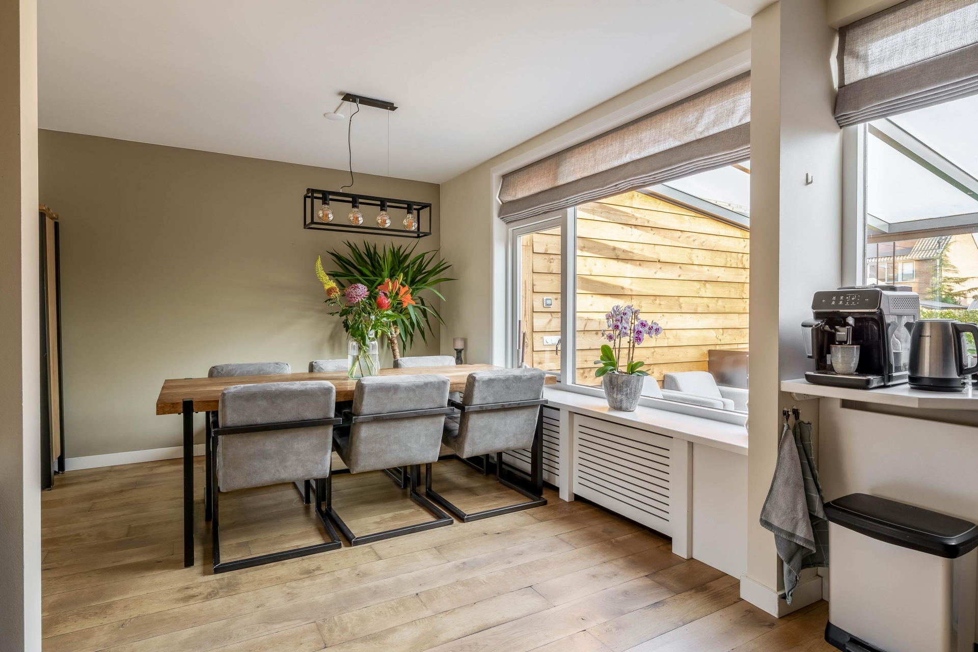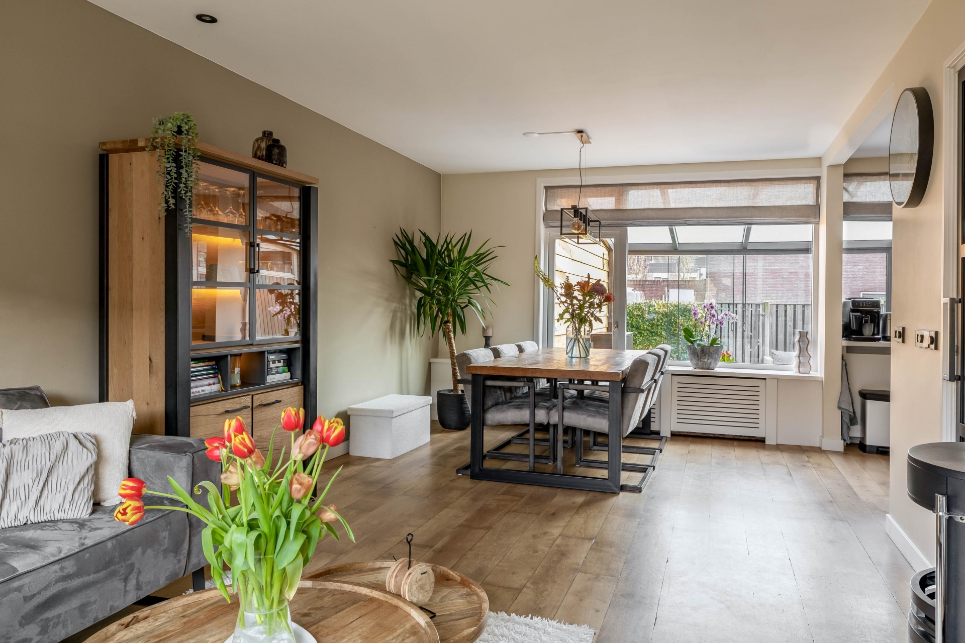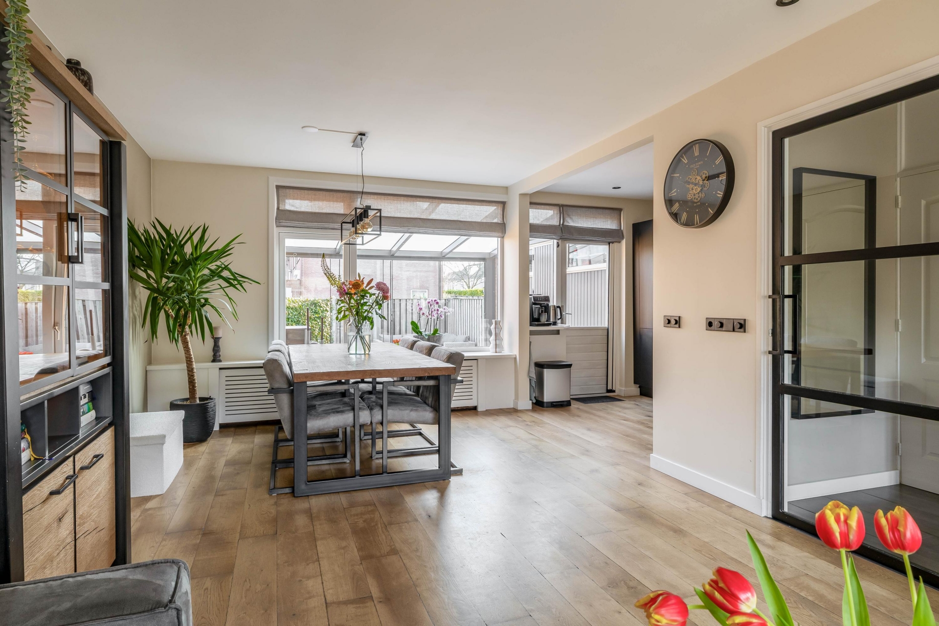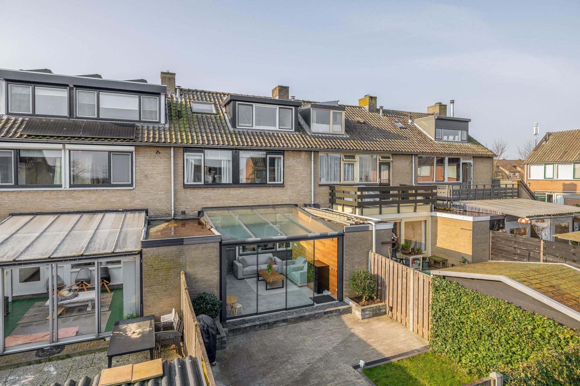 Een van de grootste pluspunten van dit huis is de serre aan de achterzijde. Deze is in 2022 geplaatst en volledig onderheid, waardoor het een solide en volwaardig onderdeel van het huis vormt. De serre voelt als een extra leefruimte waar je het hele jaar door kunt zitten. De grote glazen schuifpanelen zorgen voor veel lichtinval en een directe verbinding met de tuin. Op zonnige dagen zet je de panelen eenvoudig open en loopt binnen moeiteloos over in buiten. Hierdoor ontstaat een fijne plek voor een tweede zithoek, speelruimte voor kinderen of een rustige werkplek.