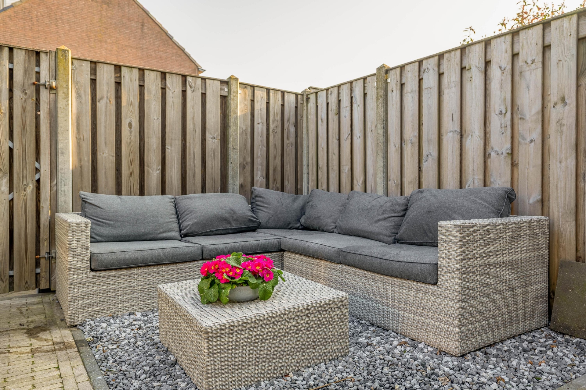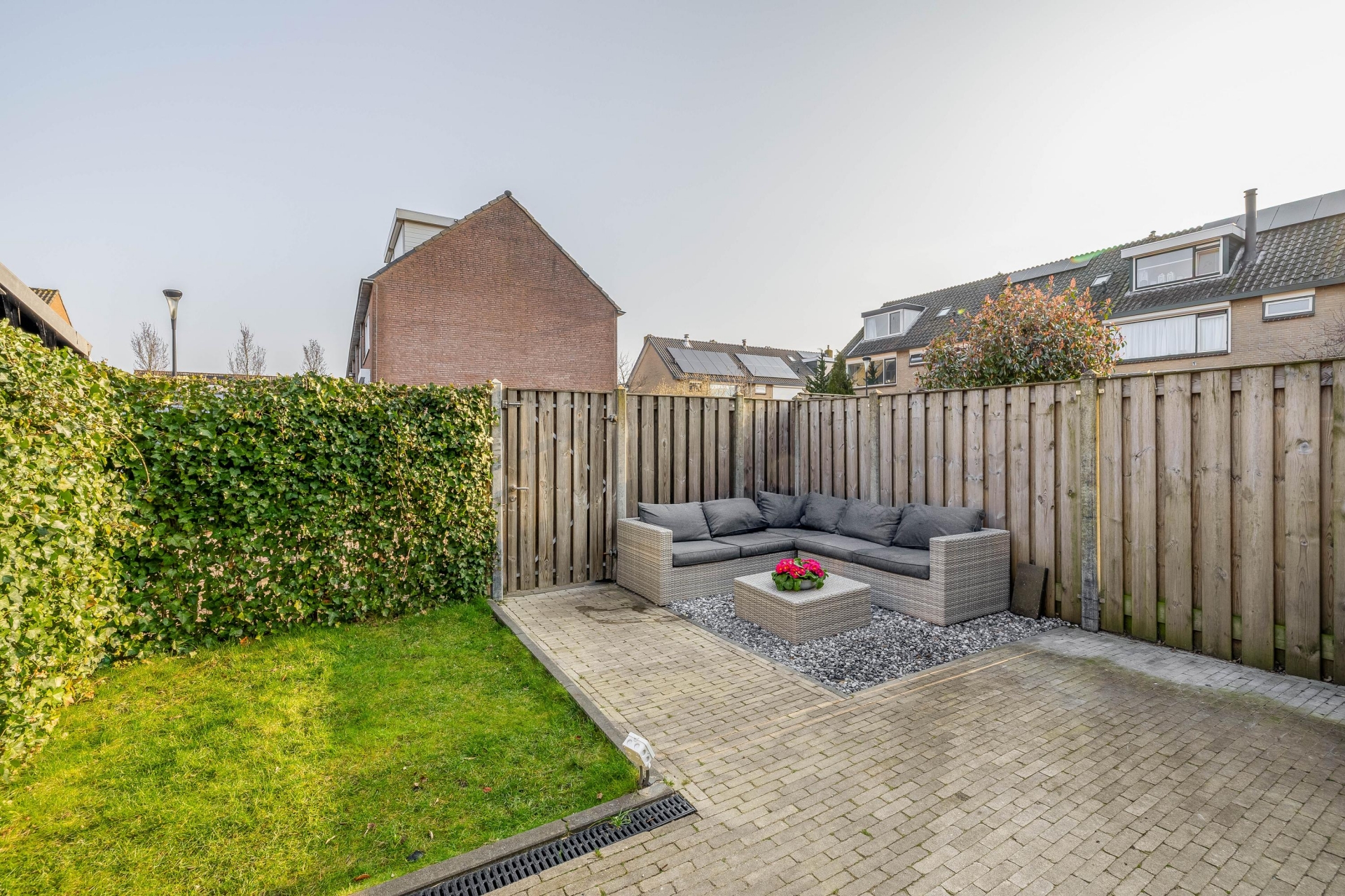 De achtertuin ligt op het noordoosten en is netjes aangelegd met bestrating en groen. Achterin is ruimte voor een loungehoek waar je in alle rust van de tuin kunt genieten.