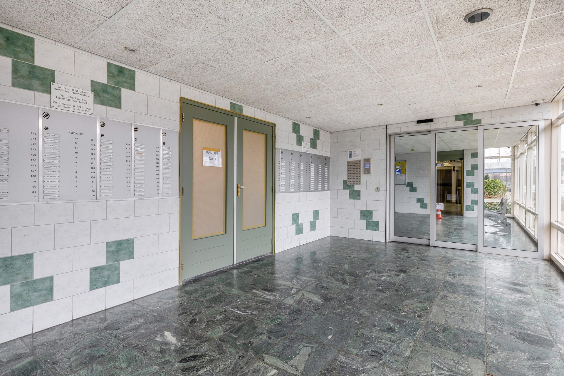 Gezamenlijke entree met bellentableau, trappenhuis en lift naar de 4e verdieping.