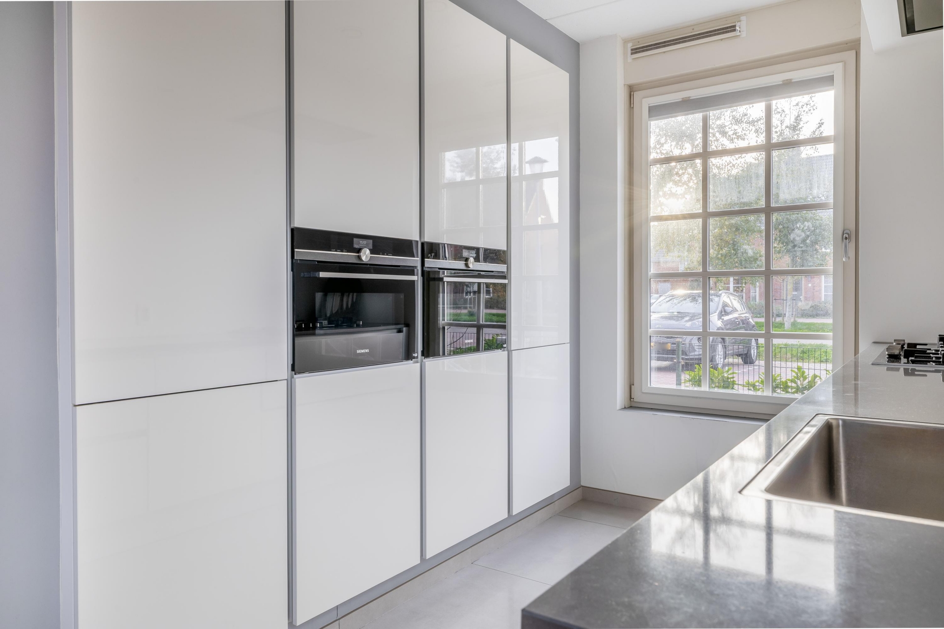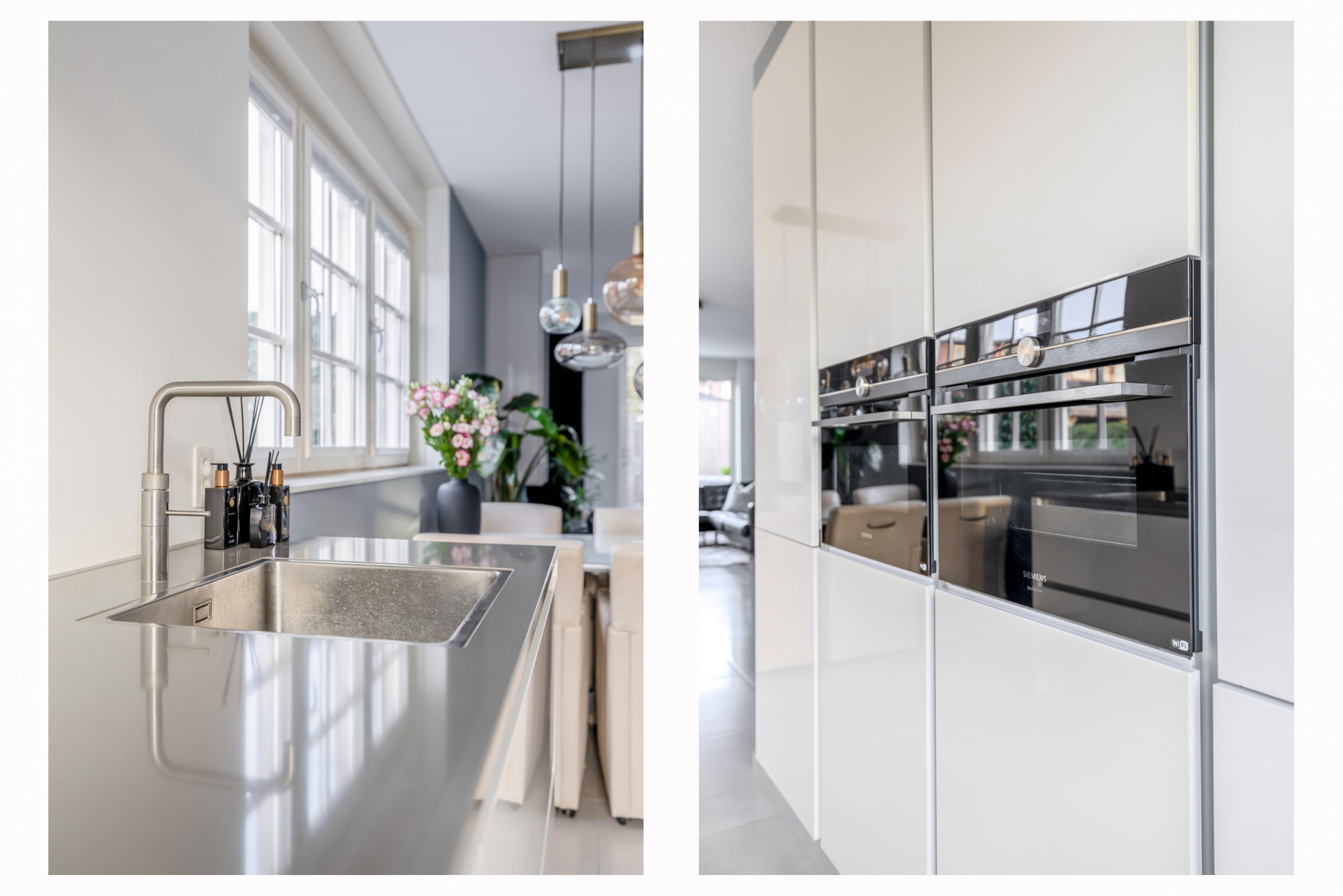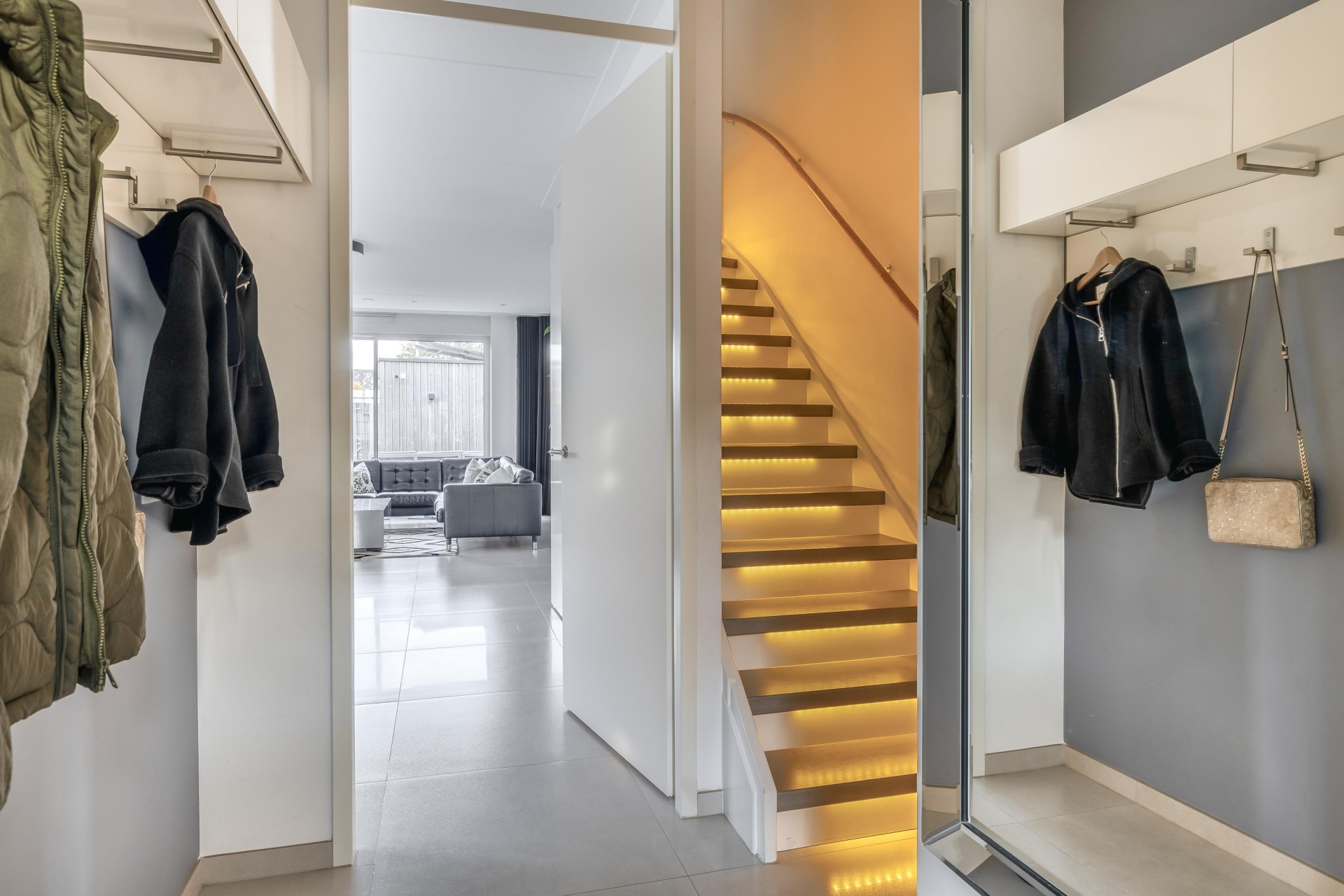 De open keuken aan de voorzijde is modern uitgevoerd met greeploze kasten, een vijfpits gaskookplaat, afzuiging verwerkt in het plafond en een strak werkblad. Vanuit hier kijk je fijn uit over de rustige straat. Ook de hal is tot in de puntjes verzorgd, met inbouwverlichting in de trap die zorgt voor een sfeervolle binnenkomst.