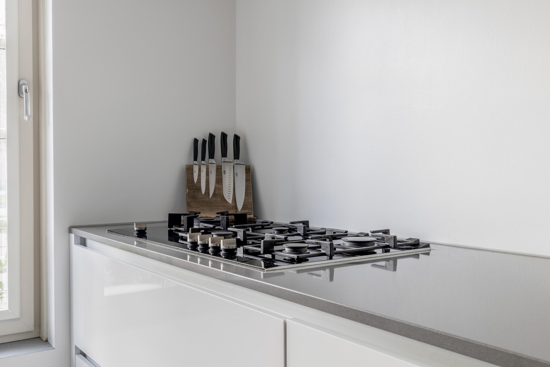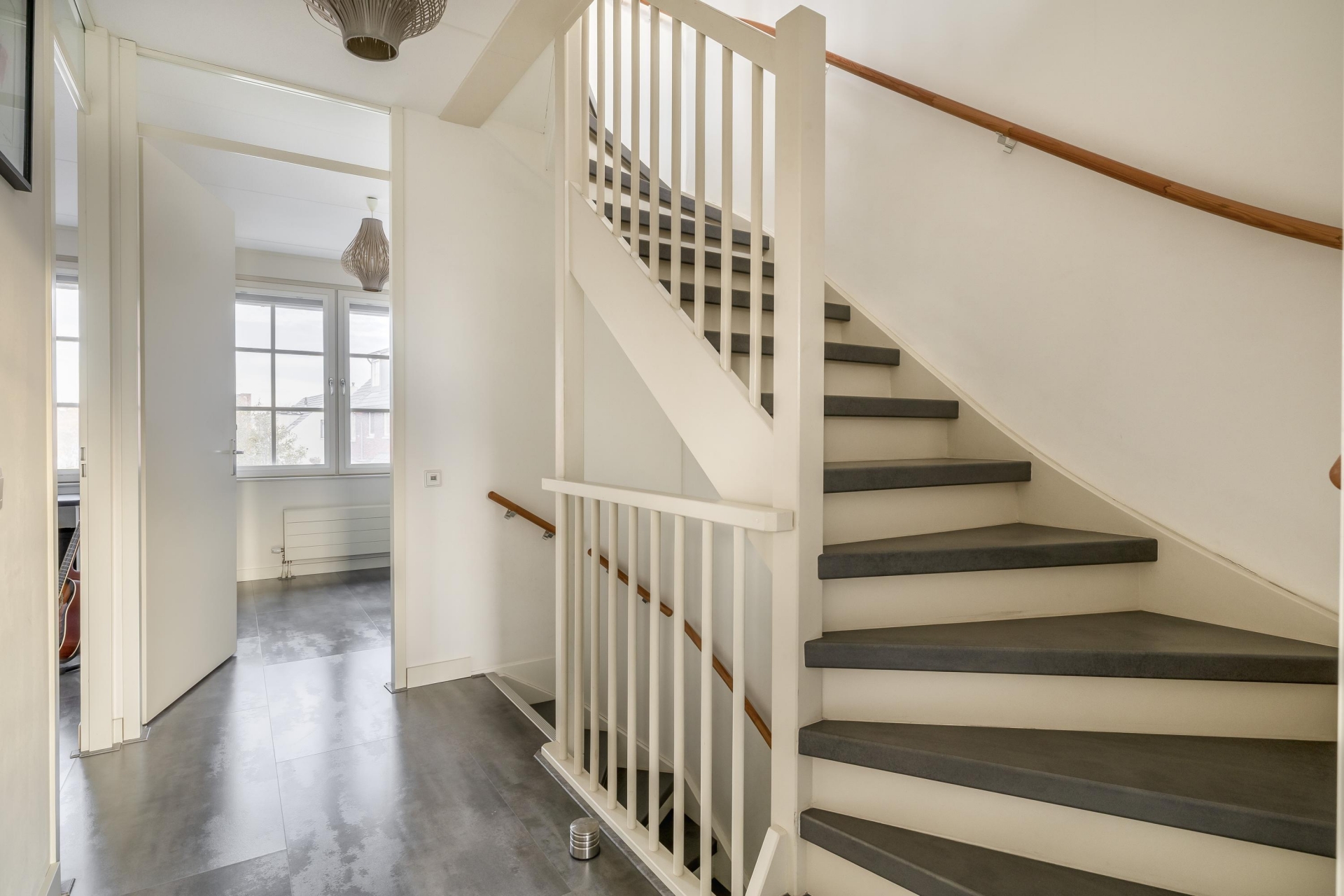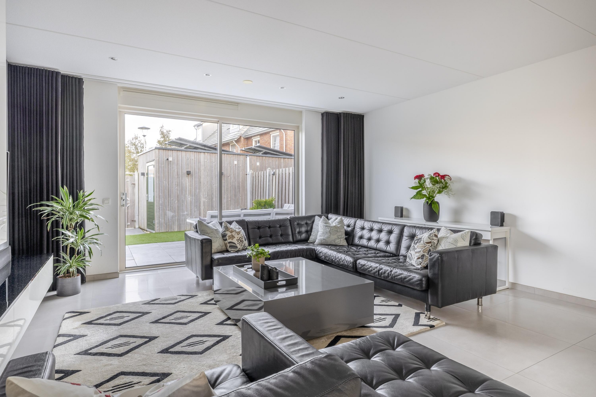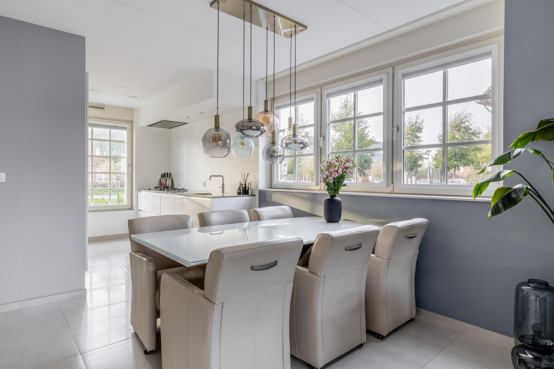 De open keuken aan de voorzijde is modern uitgevoerd met greeploze kasten, een vijfpits gaskookplaat, afzuiging verwerkt in het plafond en een strak werkblad. Vanuit hier kijk je fijn uit over de rustige straat. Ook de hal is tot in de puntjes verzorgd, met inbouwverlichting in de trap die zorgt voor een sfeervolle binnenkomst.
