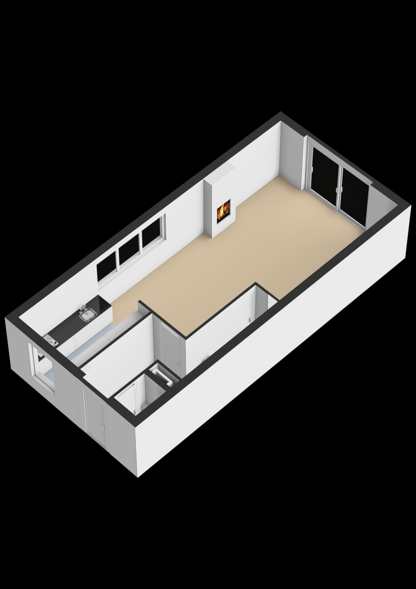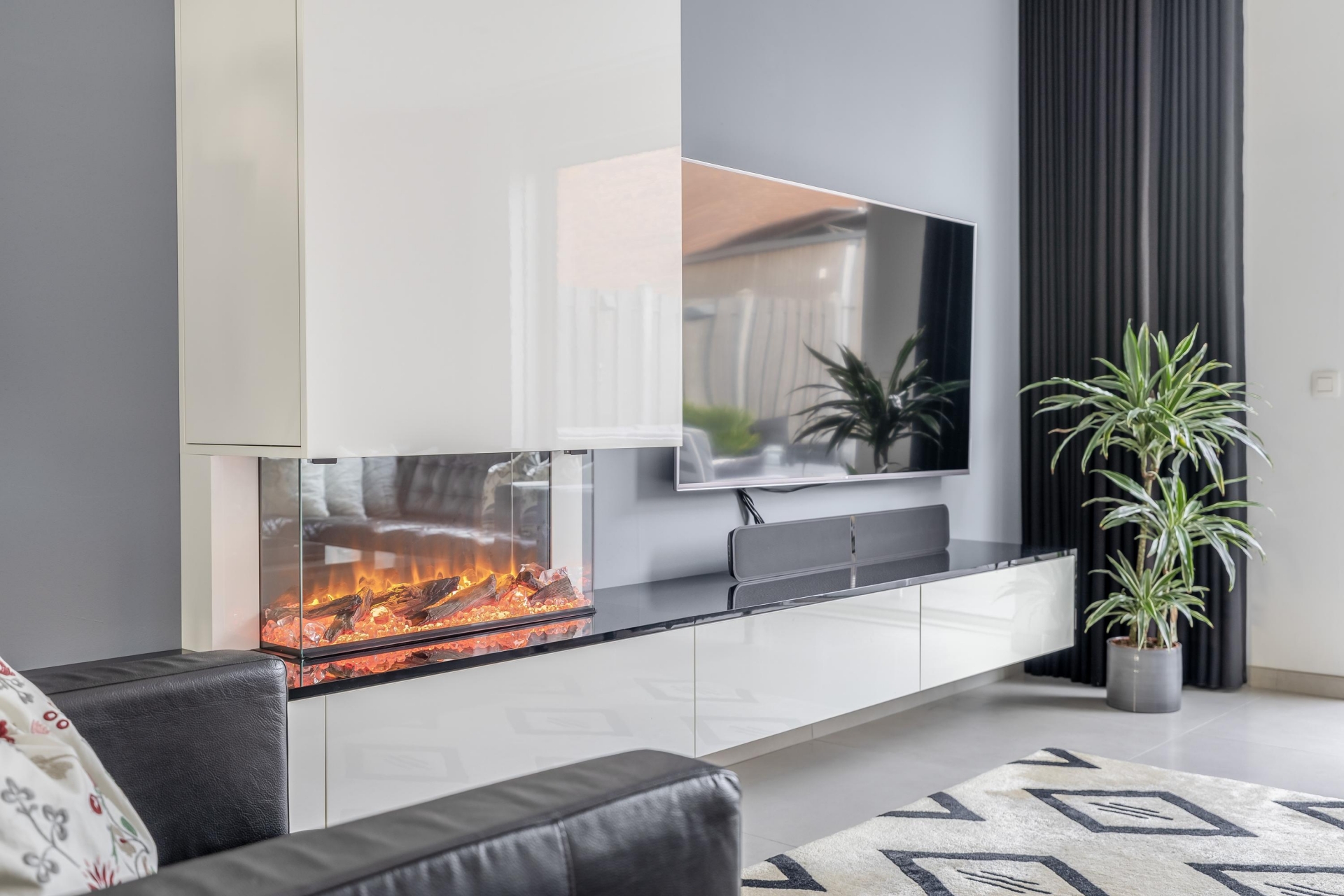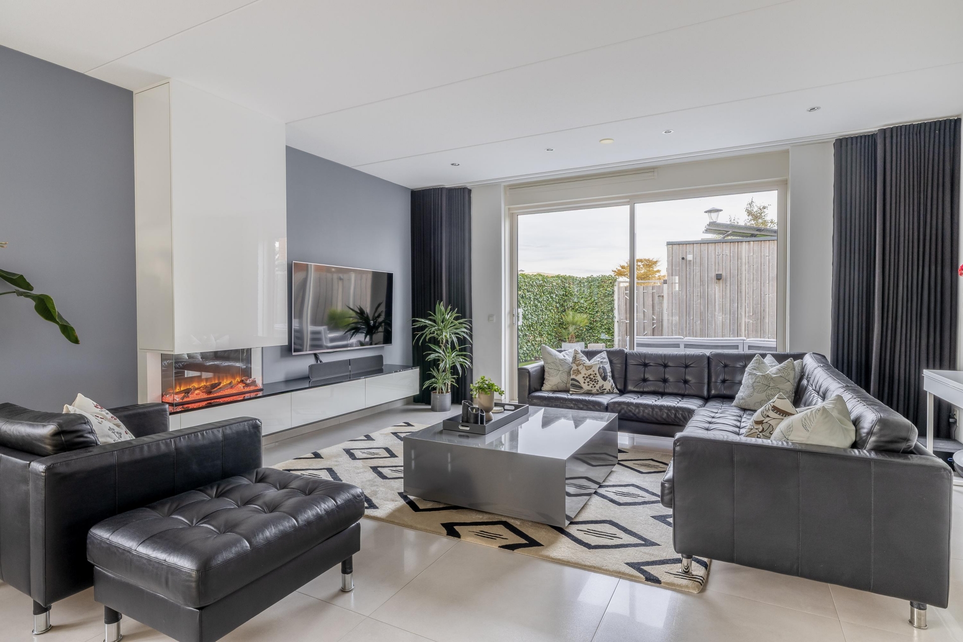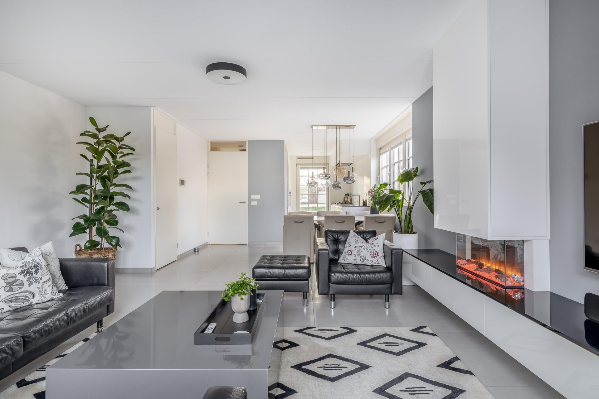 De woonkamer straalt een combinatie van warmte en luxe uit, met een moderne afwerking, grote raampartijen en een fraaie tegelvloer die doorloopt over de gehele begane grond (met vloerverwarming). Dankzij de hoekligging profiteer je van extra veel lichtinval. De leefruimte is open, overzichtelijk en biedt plek voor zowel een comfortabele zithoek als een royale eettafel. De ingebouwde haard en strakke afwerking maken het geheel helemaal af.