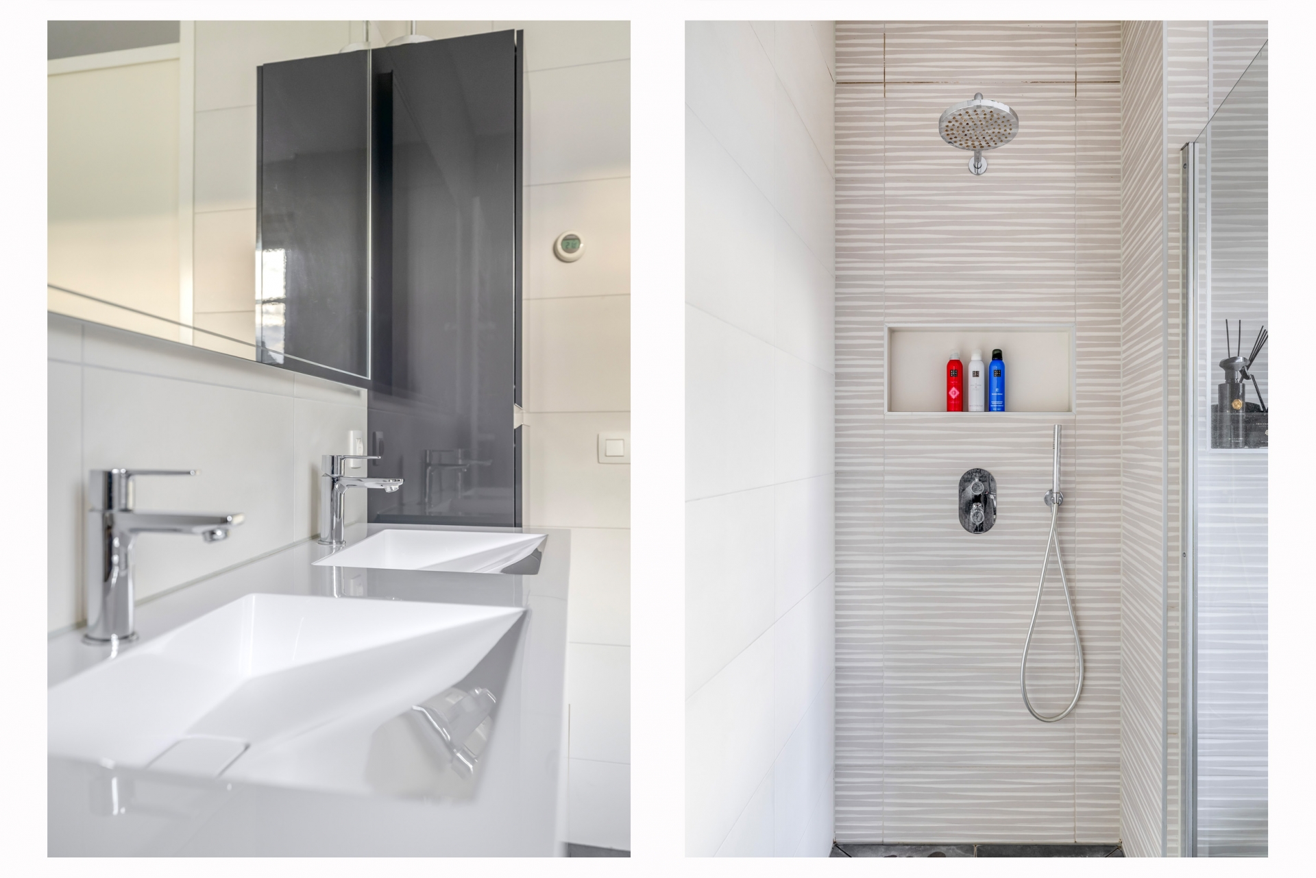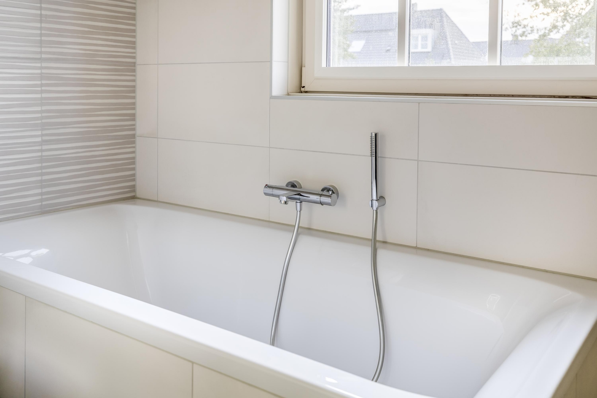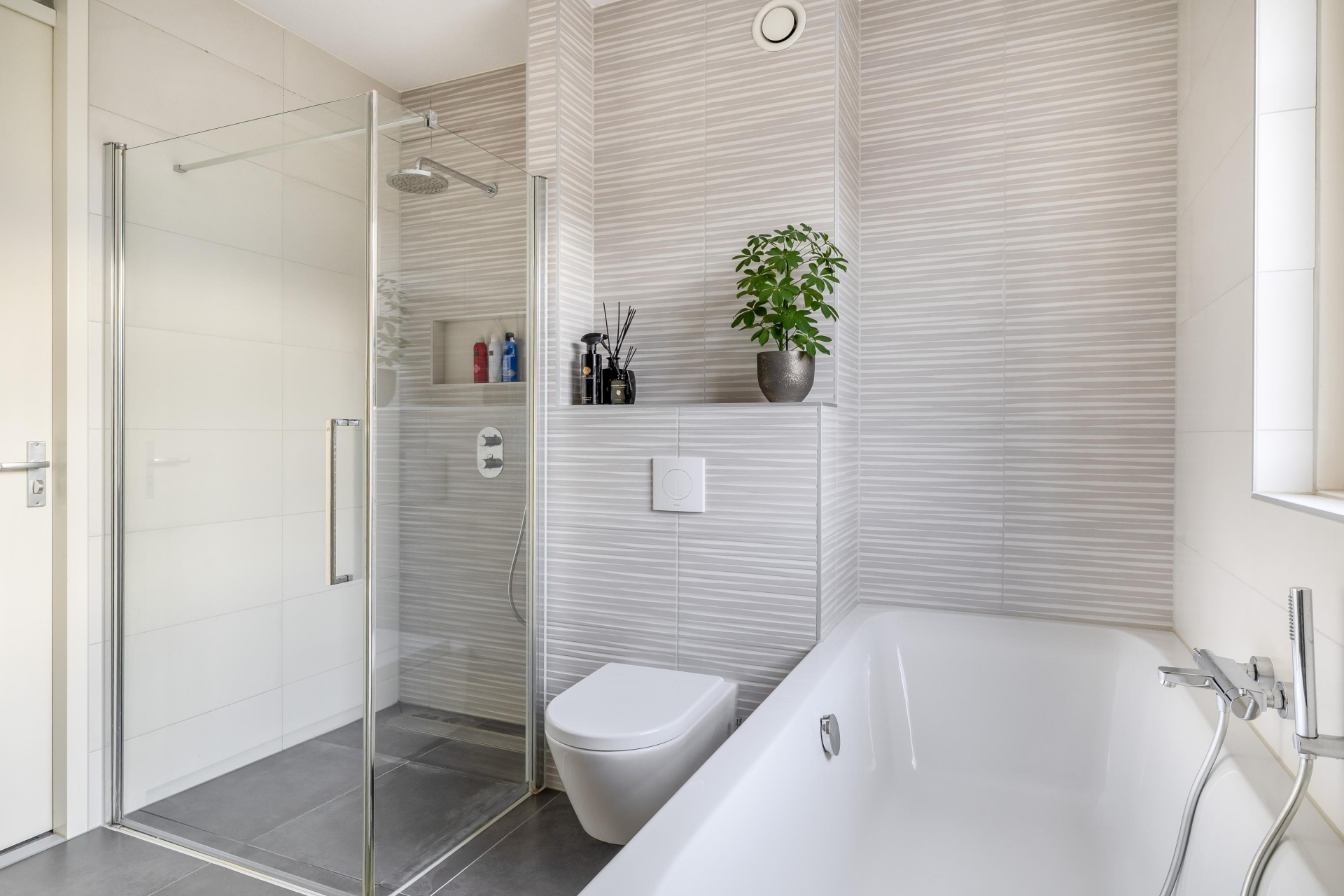 Op de eerste verdieping bevinden zich drie slaapkamers van verschillende afmetingen, stuk voor stuk keurig afgewerkt. De grootste kamer ligt aan de achterzijde en is ruim genoeg voor een groot tweepersoonsbed en kastruimte. De andere kamers zijn ideaal voor kinderen, een thuiskantoor of logeerkamer. De badkamer is modern en stijlvol uitgevoerd met een inloopdouche, ligbad, zwevend toilet en een wastafelmeubel. Alles strak betegeld in neutrale tinten, met oog voor detail.