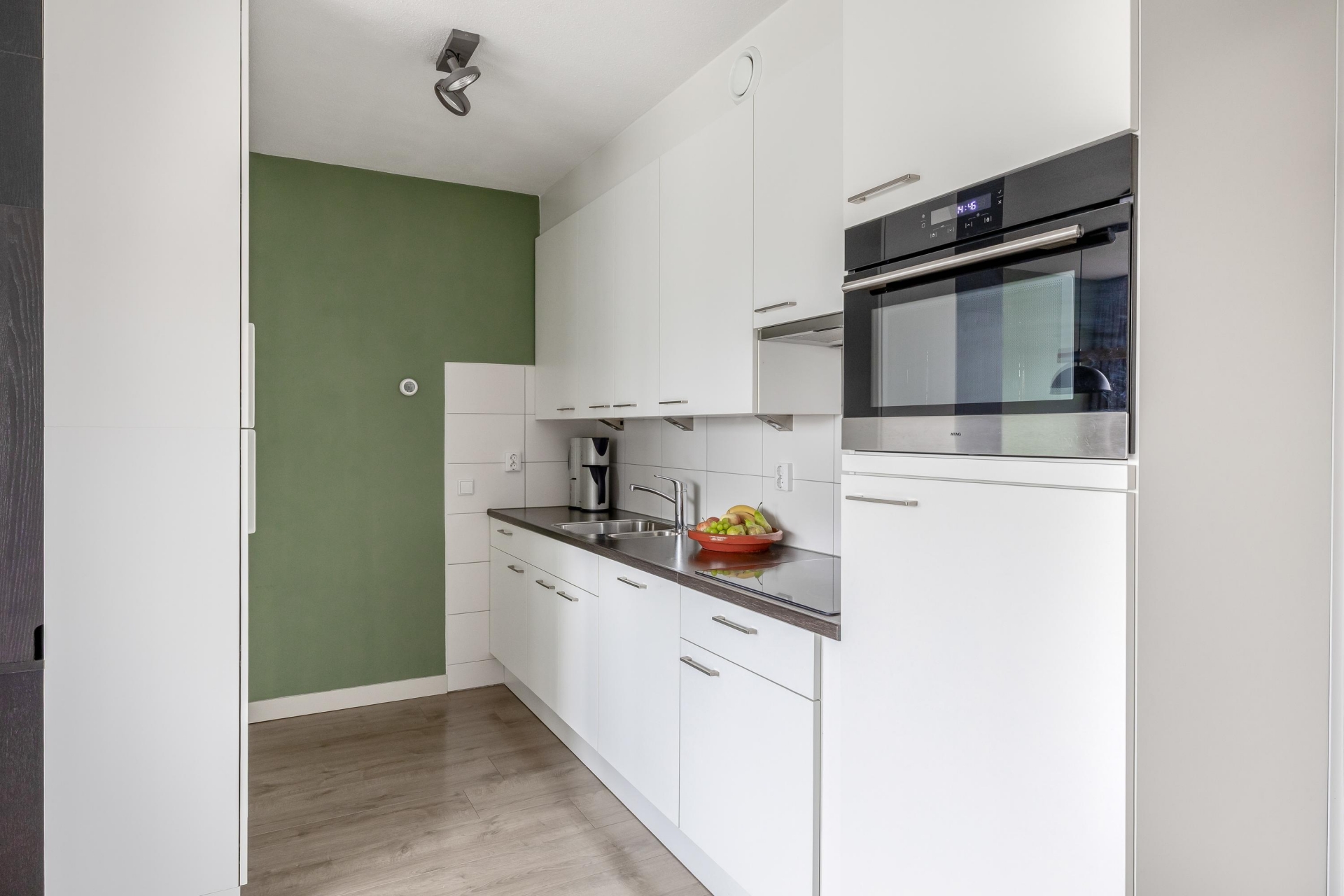 De woonkamer met open keuken beschikt over grote raampartijen met een grote schuifpui naar de buitenruimte voor de nodige daglichttoetreding. De keuken staat in open verbinding met de woonkamer en beschikt over diverse inbouwapparatuur. De badkamer is volledig betegeld en beschikt over een douche, wastafel en aansluiting voor de wasmachine en droger. Beide slaapkamers zijn aan de voorzijde van het complex gesitueerd. De slaapkamers hebben een oppervlakte van 8 en 12 m². Door het hele appartement, m.u.v. de natte ruimtes, ligt een fraaie laminaatvloer.