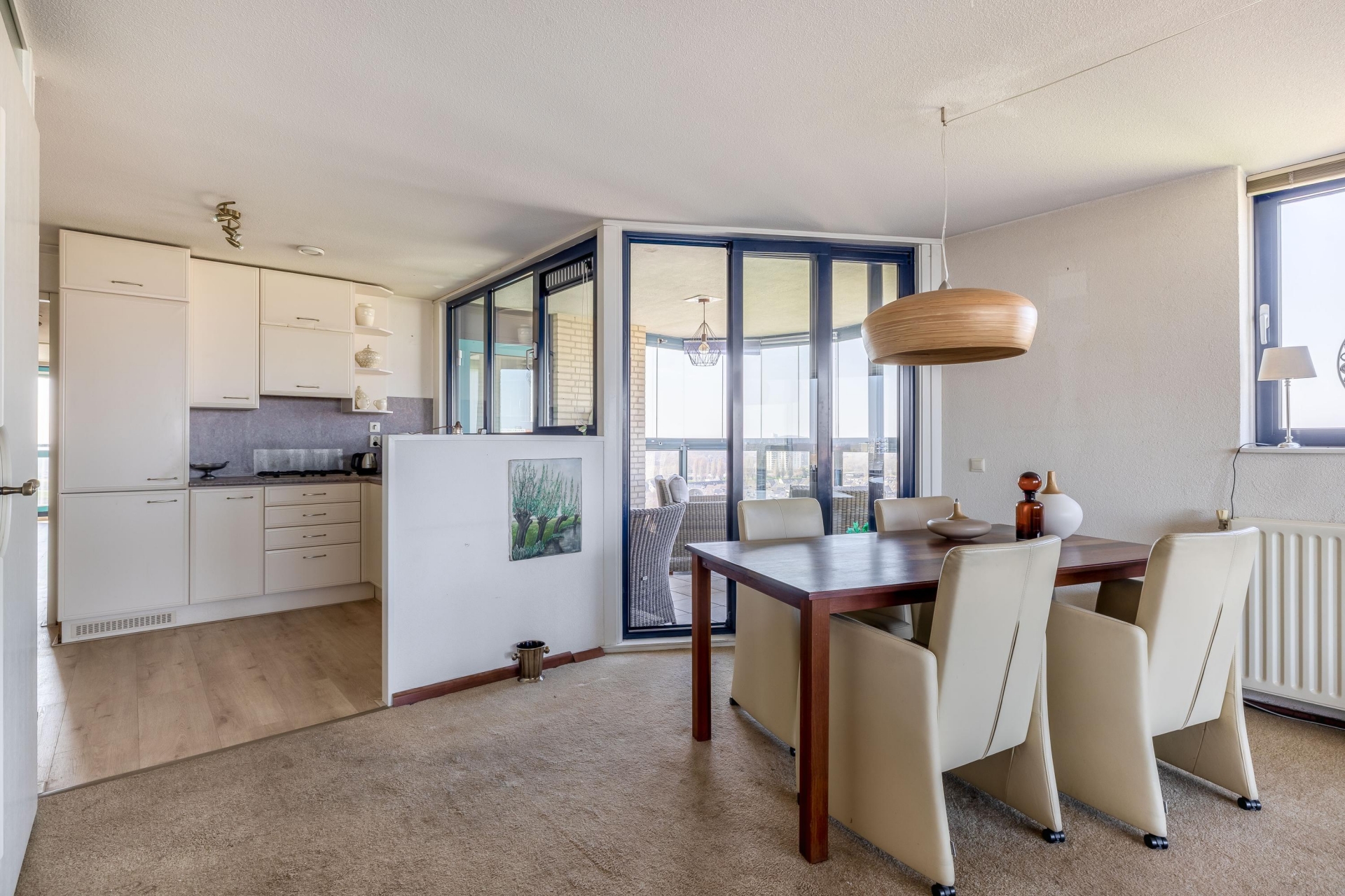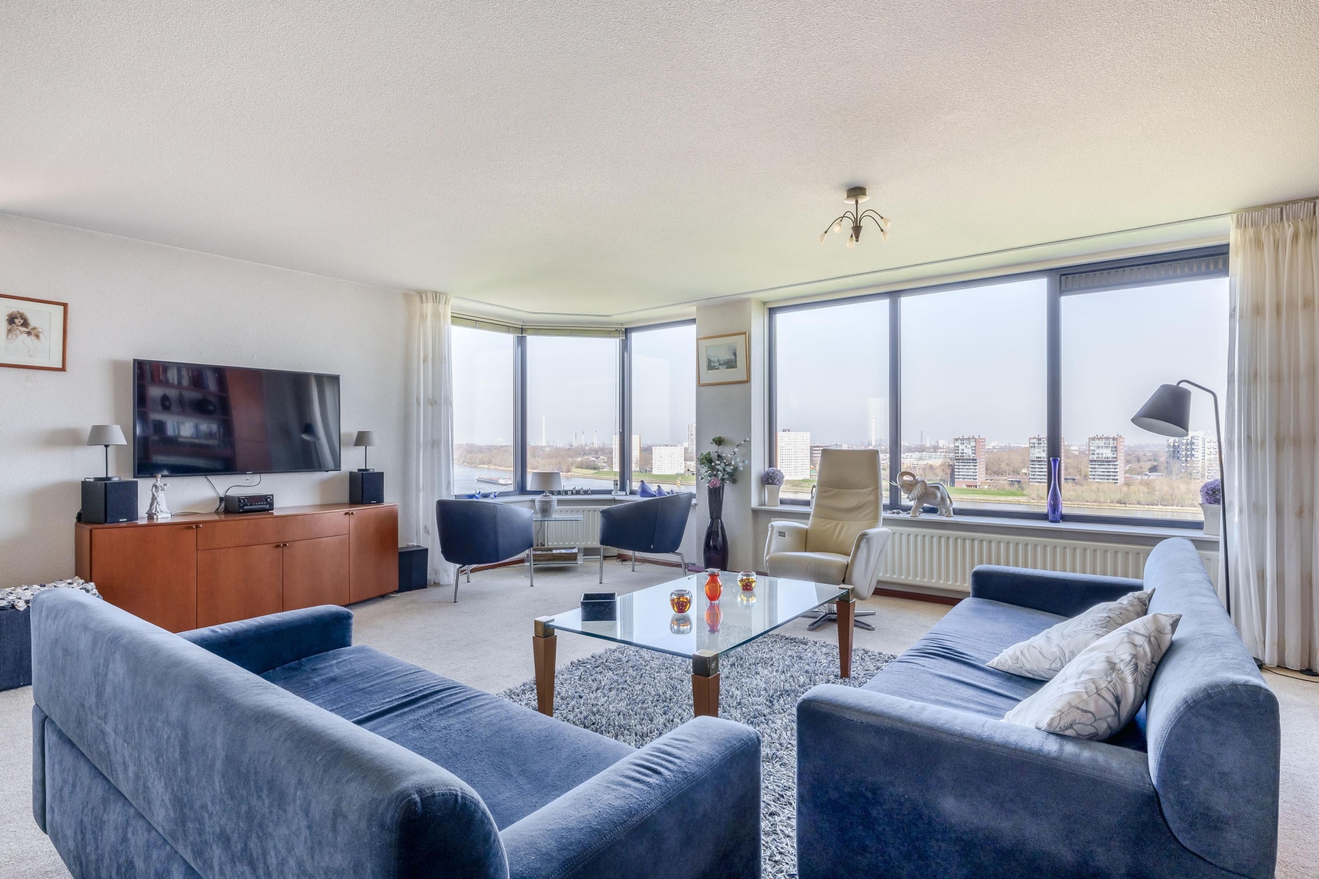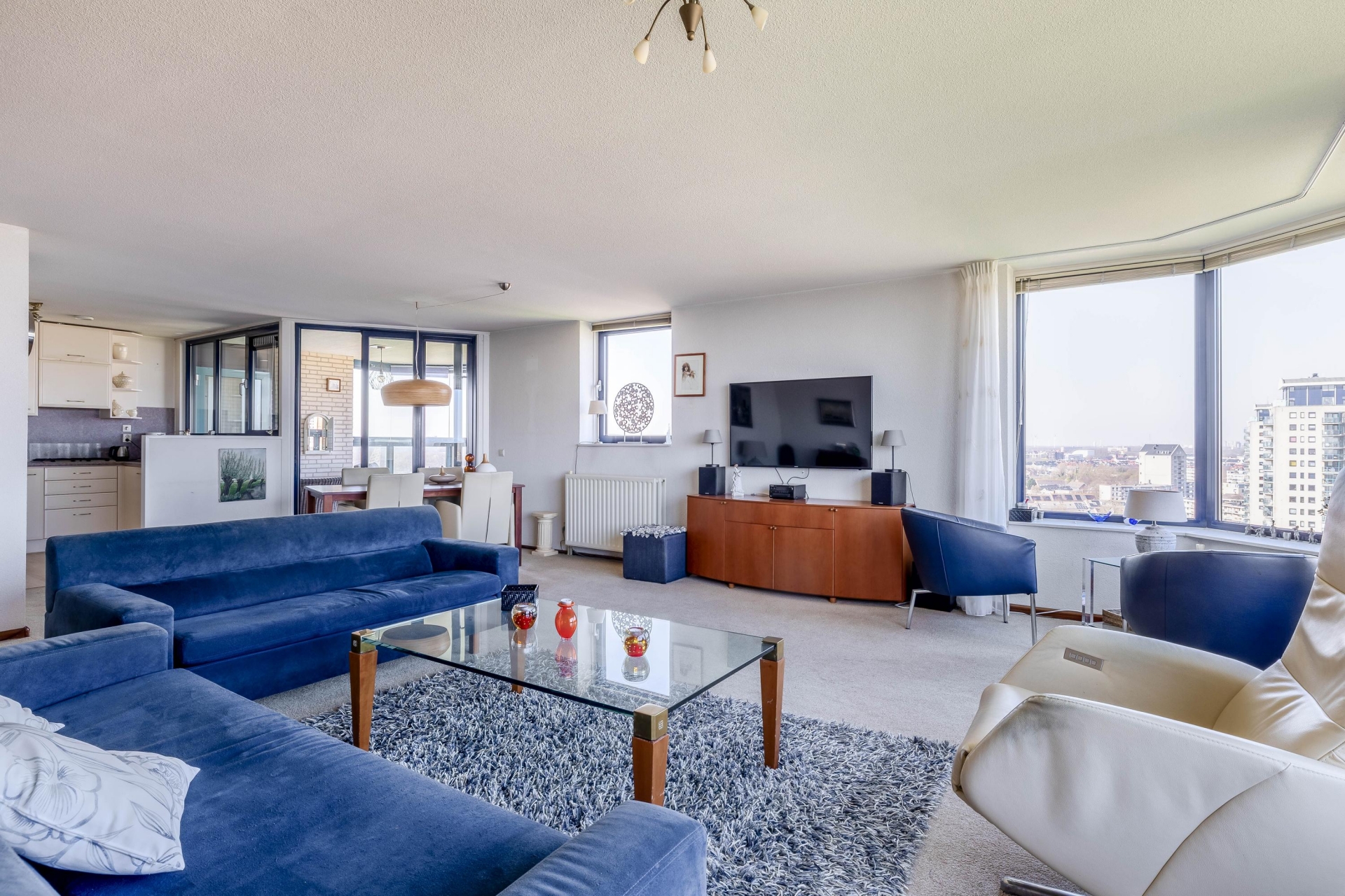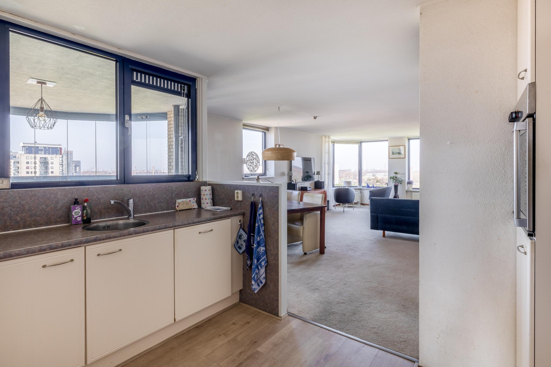 Zodra je binnenkomt, valt het meteen op: de ruimte en het licht. De woonkamer is royaal opgezet en biedt meer dan genoeg plek voor een comfortabele zithoek en een grote eettafel. Dankzij de grote raampartijen en de ligging op de 13e verdieping geniet je hier van een prachtig, vrij uitzicht over de rivier en de omgeving.