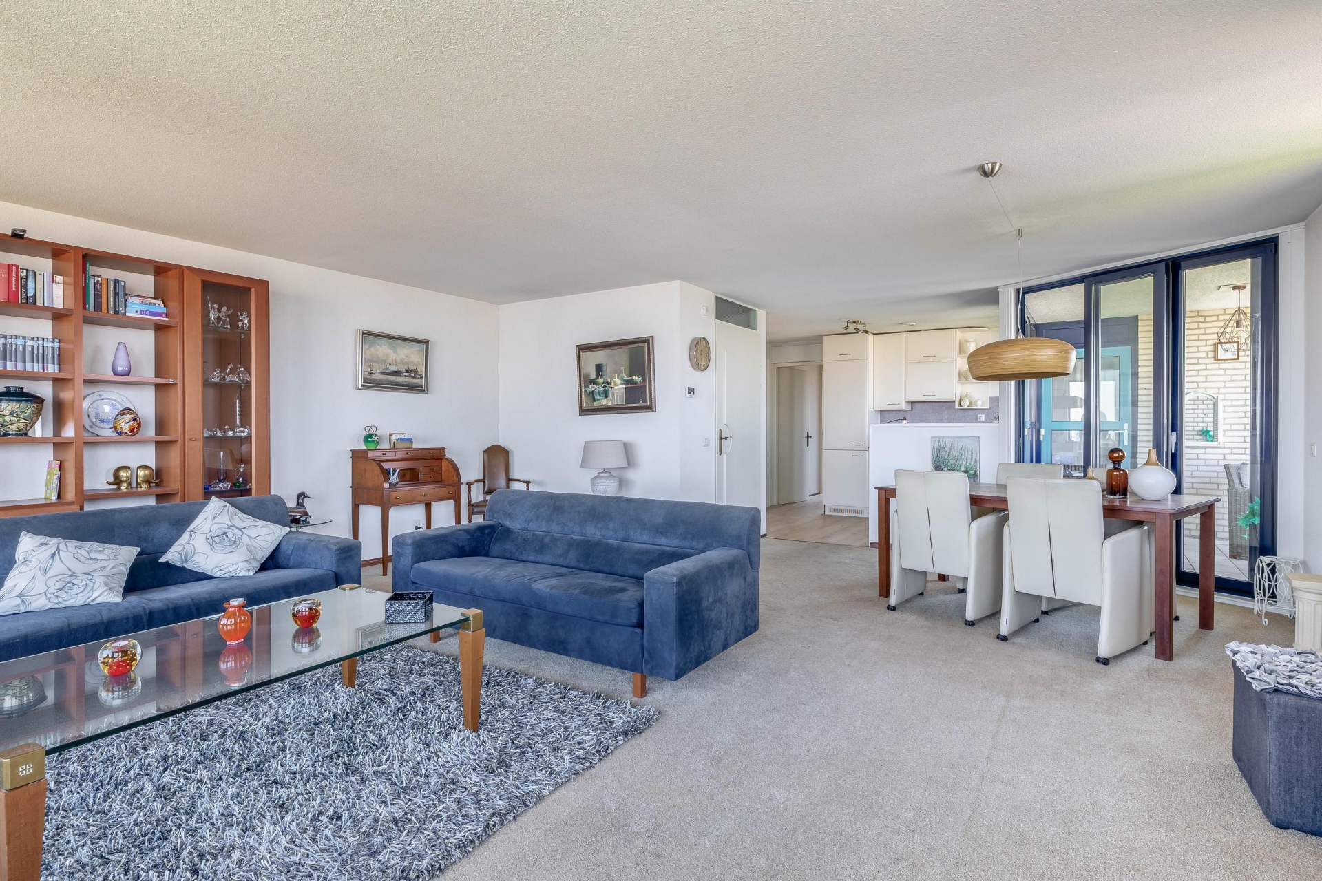 De zithoek aan het raam is een fijne plek om even tot rust te komen, terwijl je uitkijkt over het water en de passerende schepen. De open verbinding met de eetkamer en keuken zorgt voor een prettige, logische indeling.