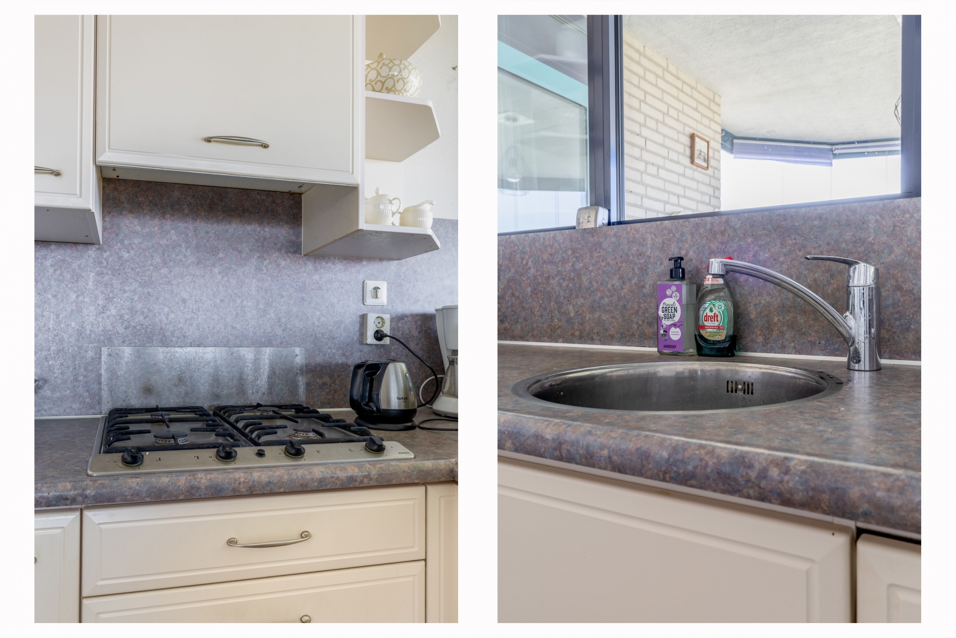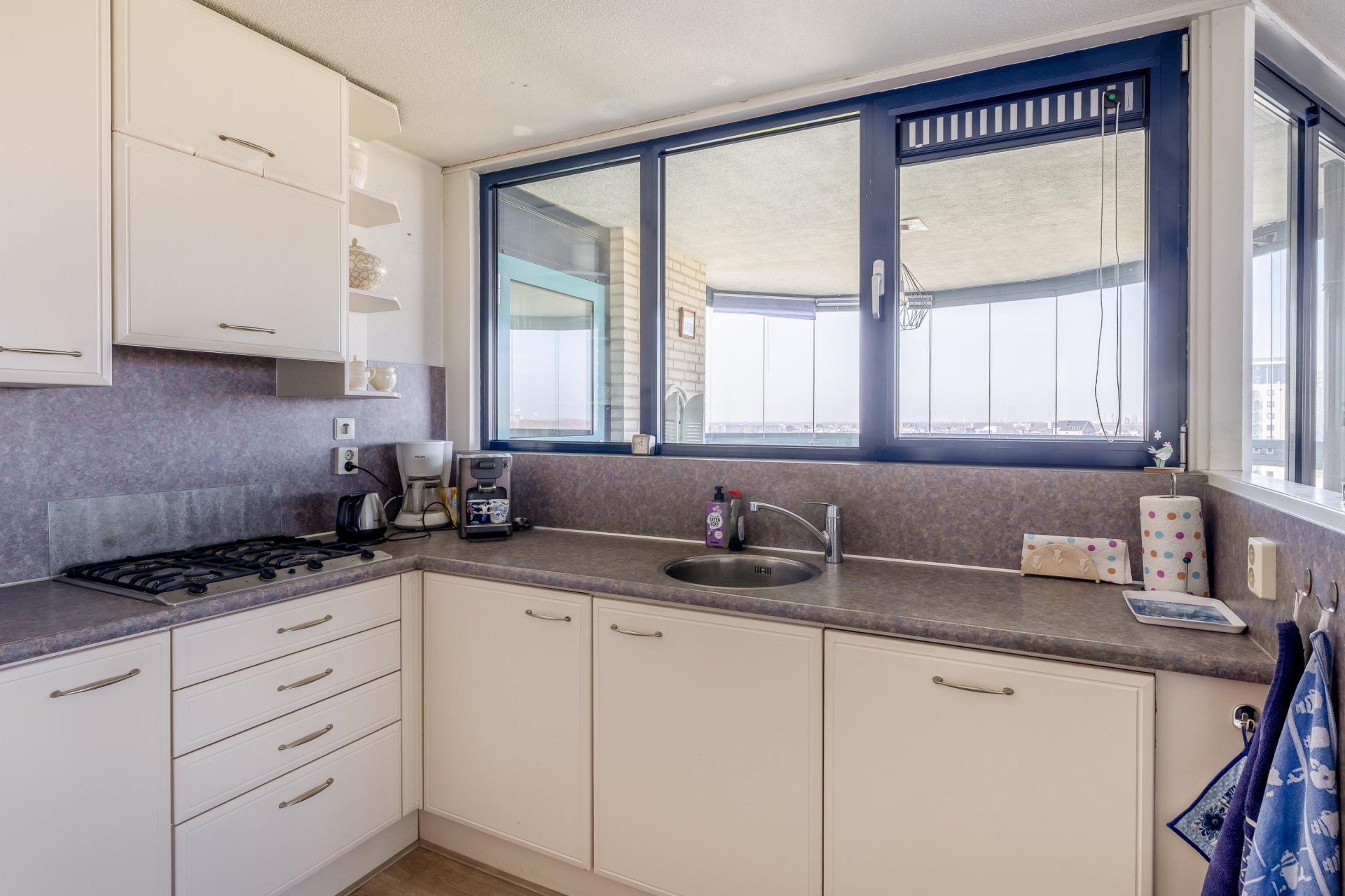 De keuken is praktisch ingericht en ligt centraal in het huis, met directe toegang tot het balkon. Ideaal voor wie graag kookt en toch in contact wil blijven met de rest van de ruimte.
