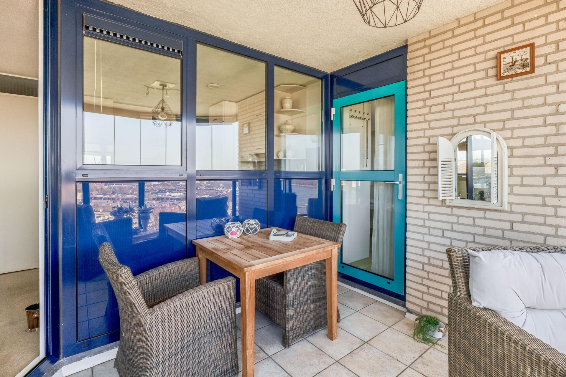 Een van de grote pluspunten van dit huis zijn de twee balkons. Het hoofdbalkon op het noordwesten is deels afgesloten met een glazen wand, waardoor je hier al vroeg in het seizoen comfortabel zit. Deze serre-achtige ruimte maakt het mogelijk om ook op minder warme dagen te genieten van buiten.