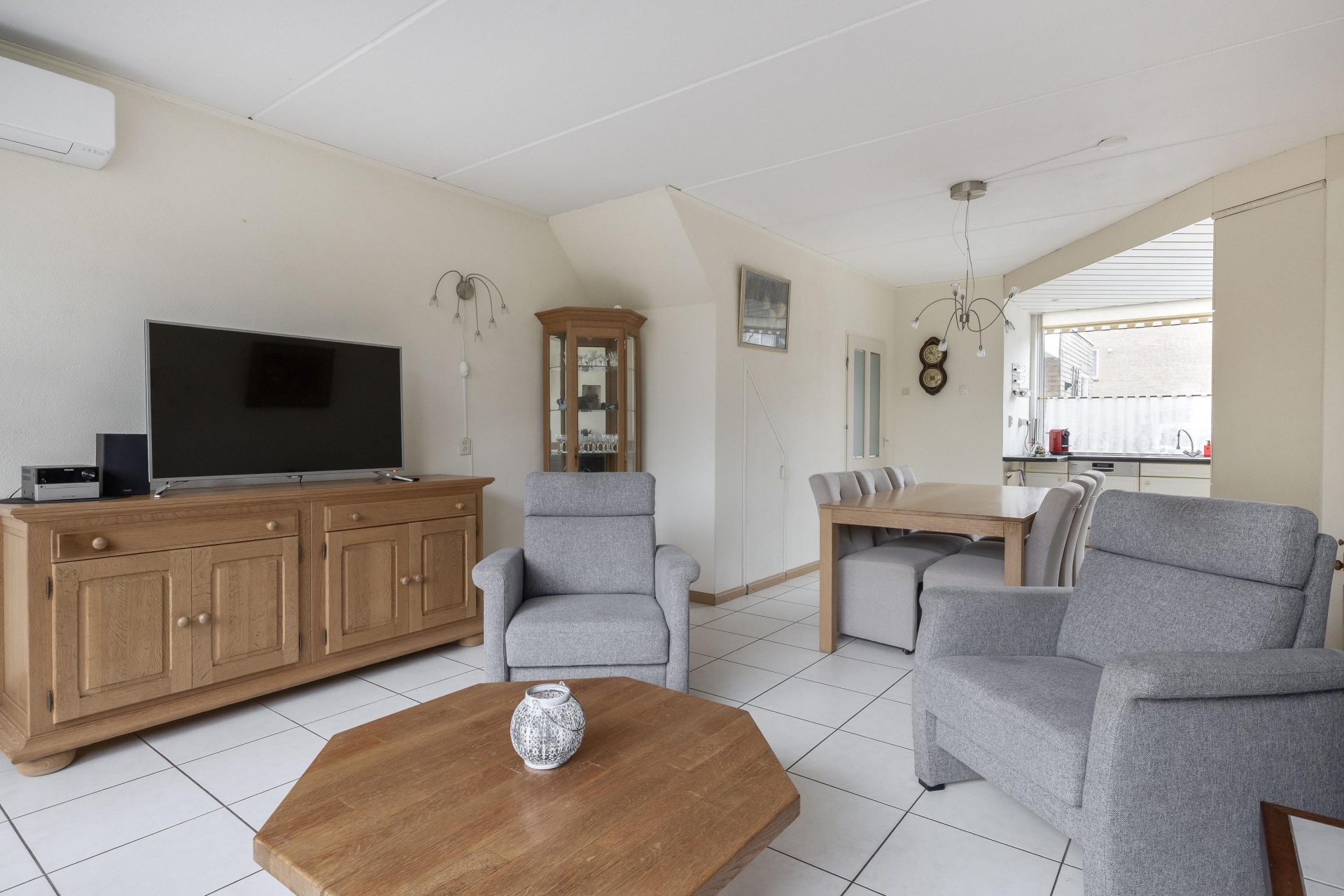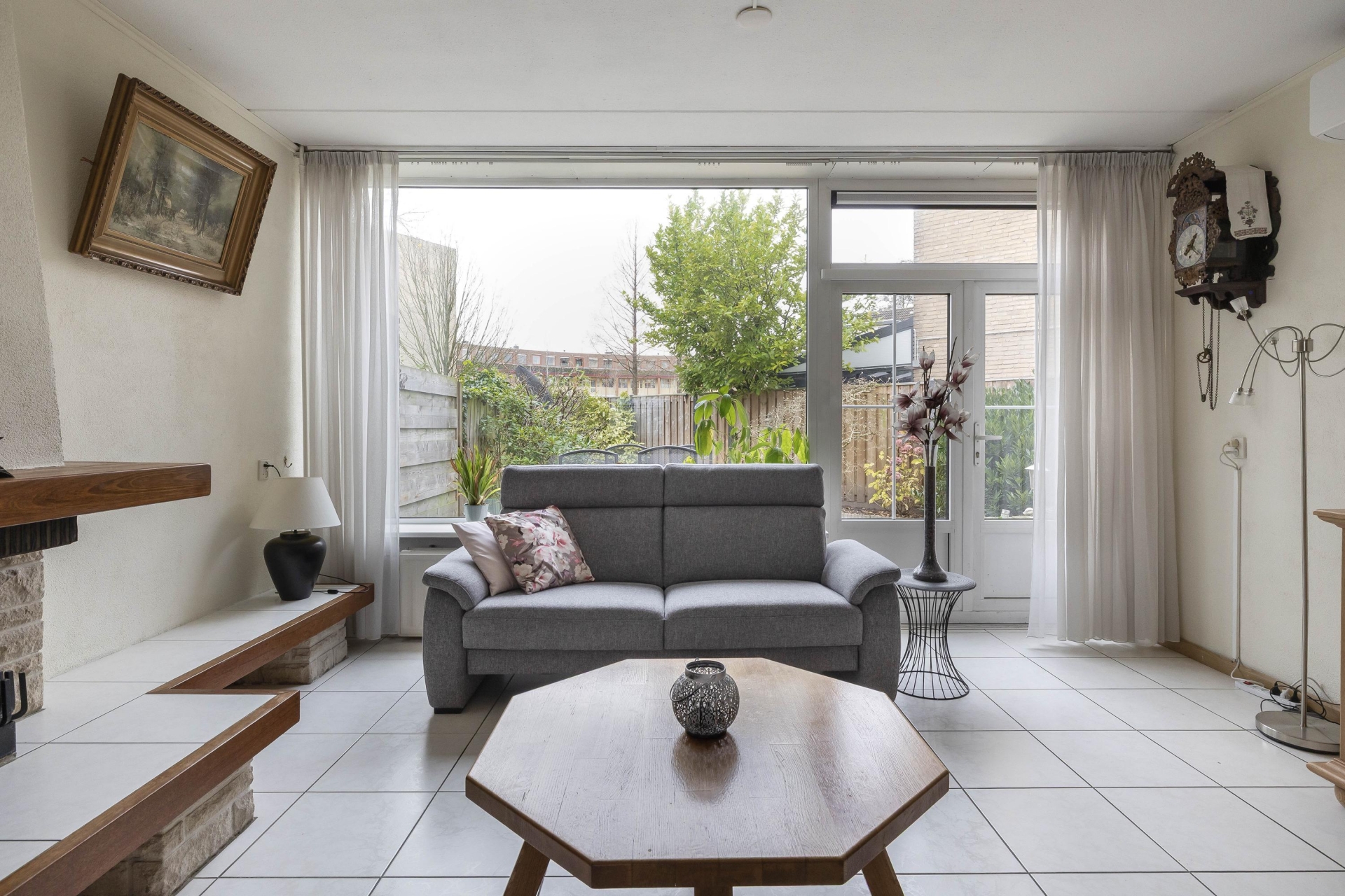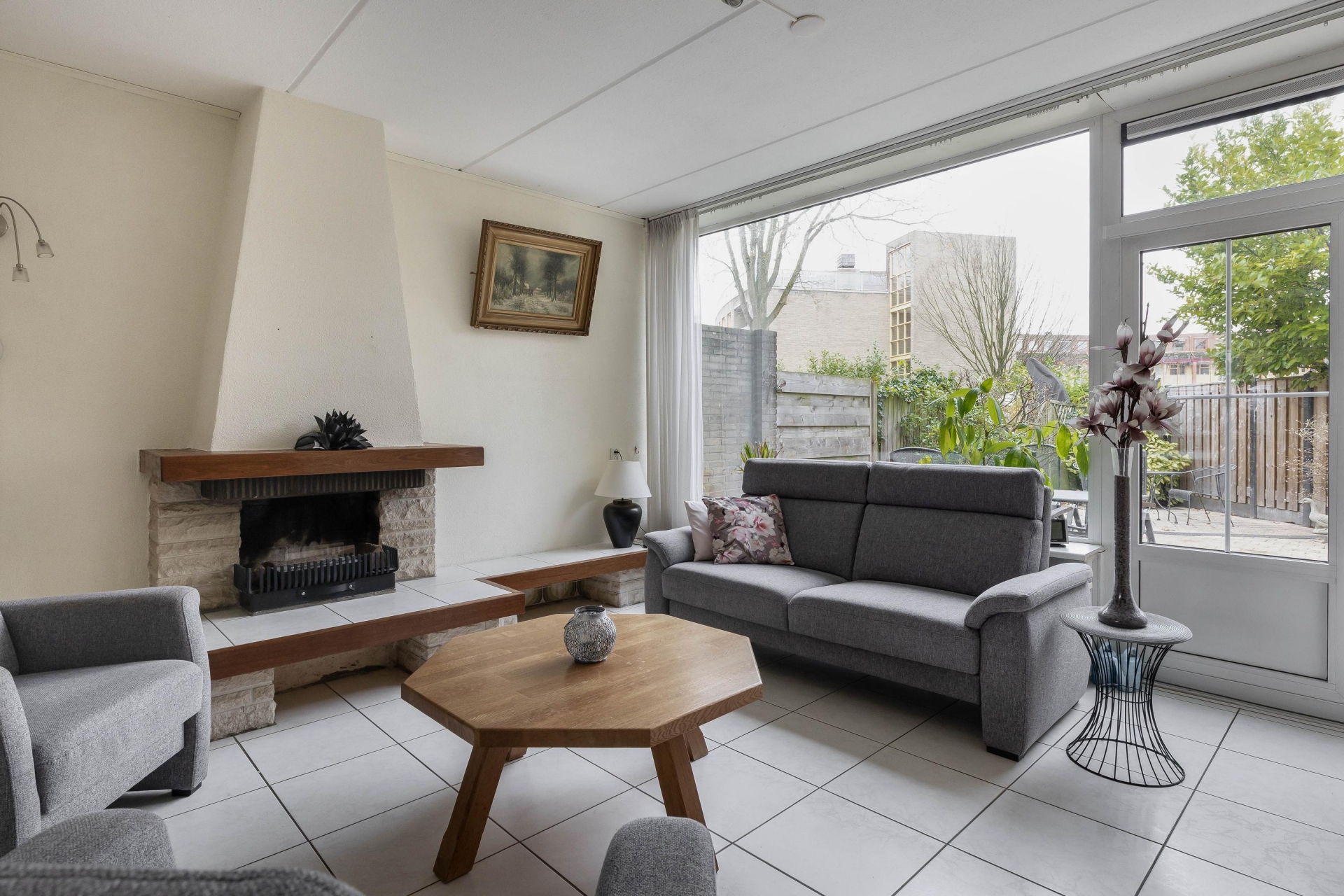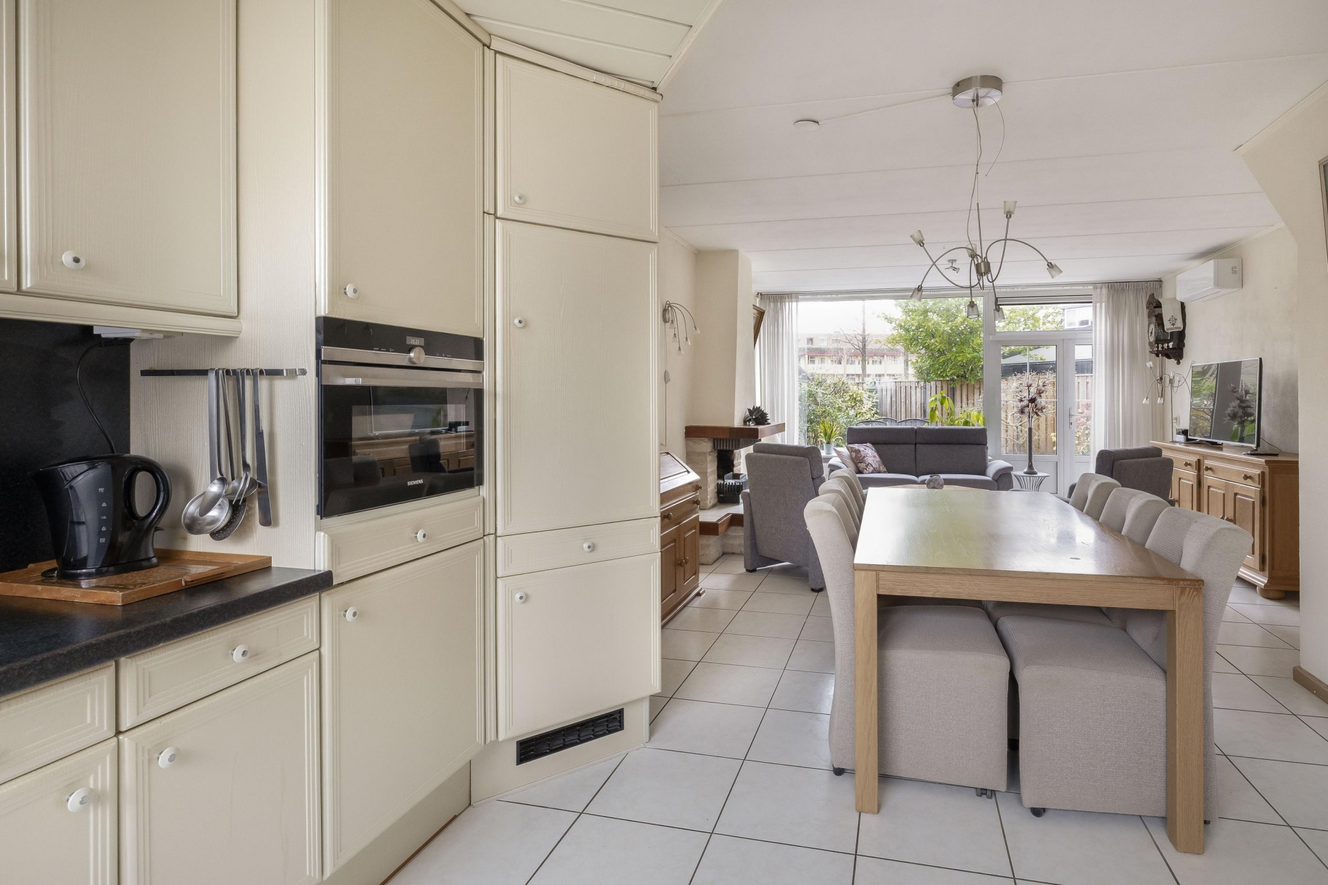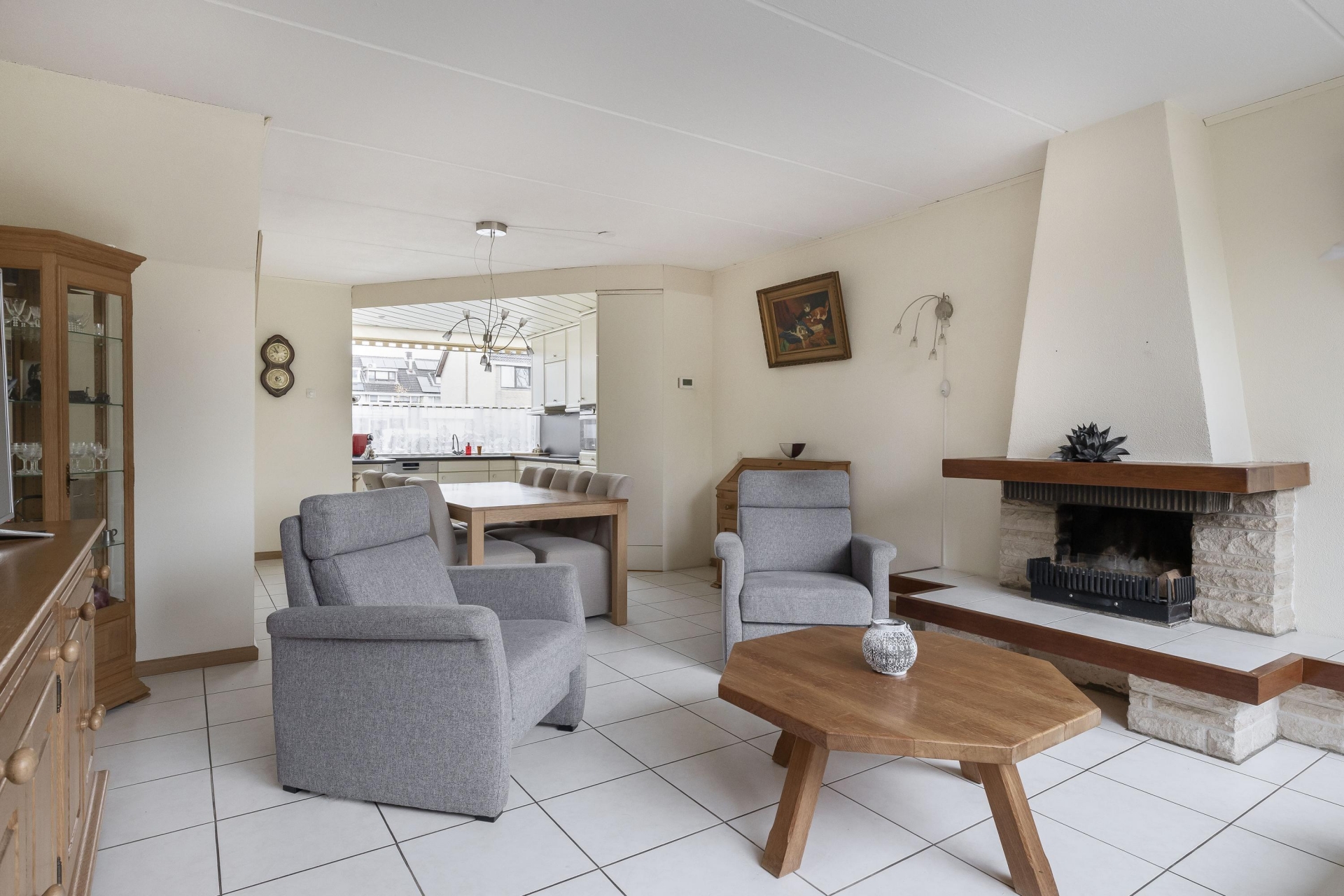 Je komt binnen in een royale woonkamer met grote raampartijen waardoor het daglicht de ruimte mooi vult. De zithoek bij de open haard is een fijne plek om te ontspannen en de doorloop naar de eetkamer en keuken zorgt voor een logische en open indeling.