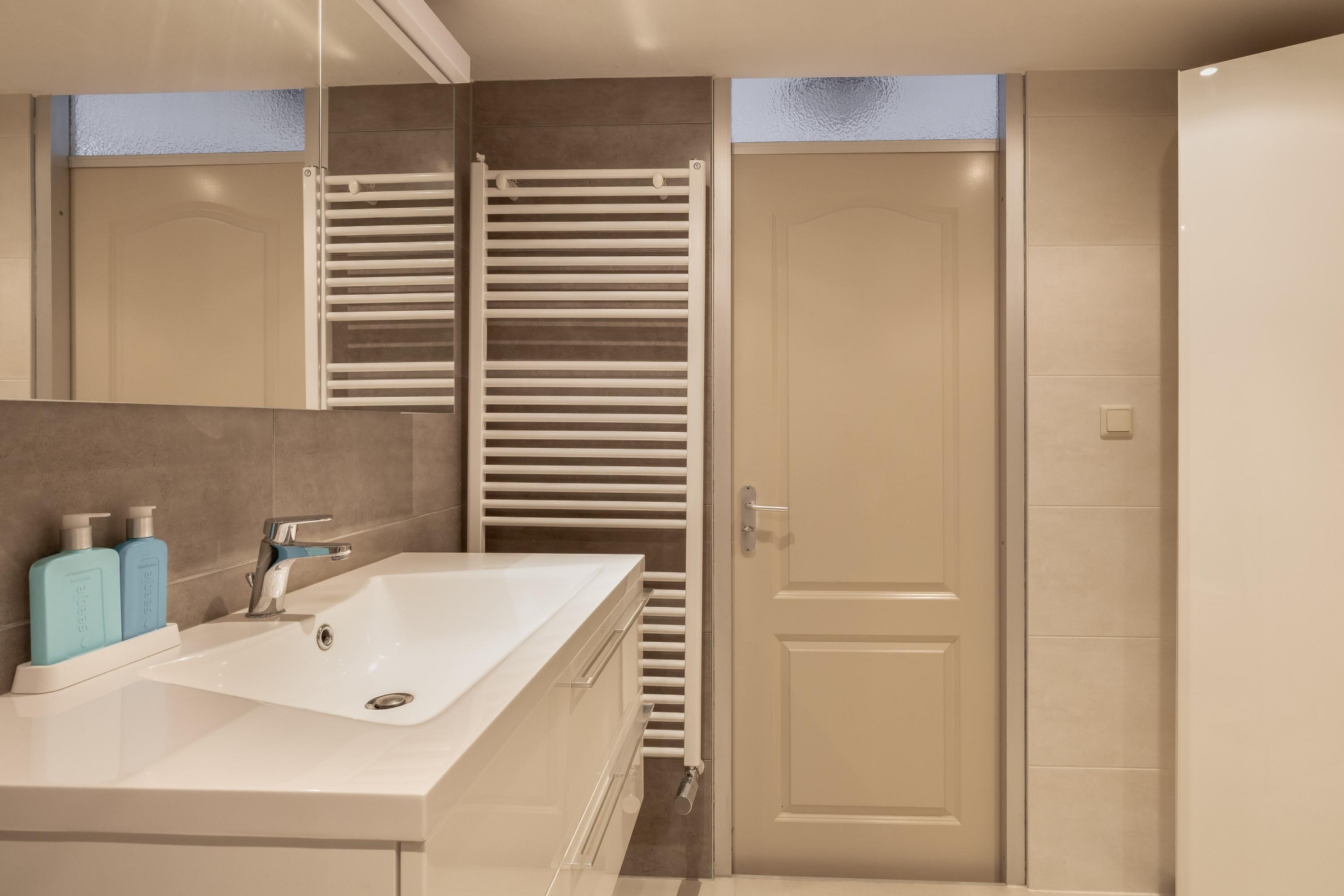 Op de eerste verdieping vind je 2 grote slaapkamers – één ruime master bedroom (voorheen 2 slaapkamers) en een royale slaapkamer 2. De badkamer is keurig en in lichte kleurstelling uitgevoerd en biedt met een grote inloopdouche, wastafelmeubel en 2e toilet alles wat je nodig hebt.