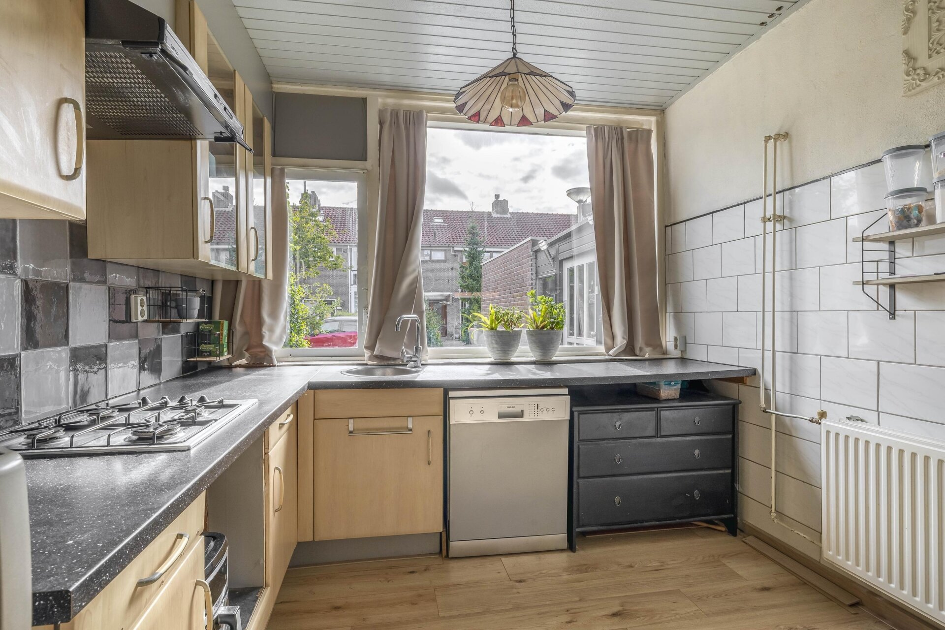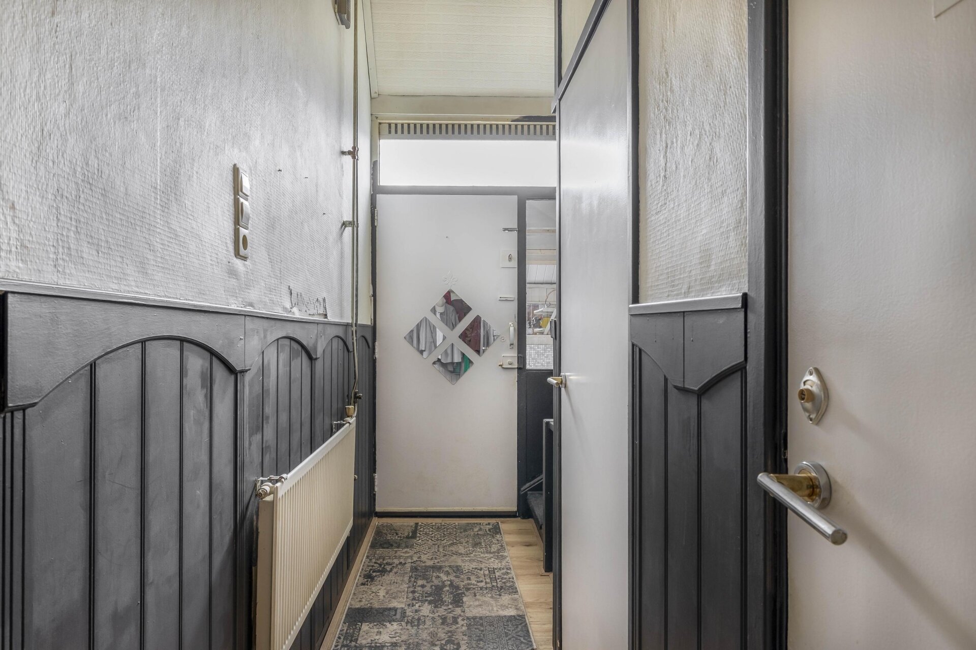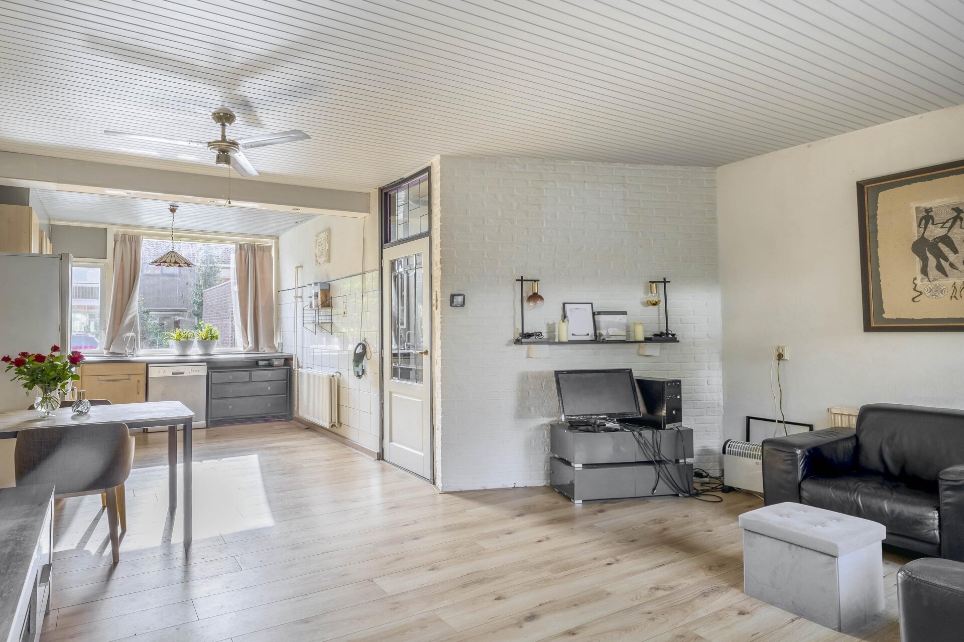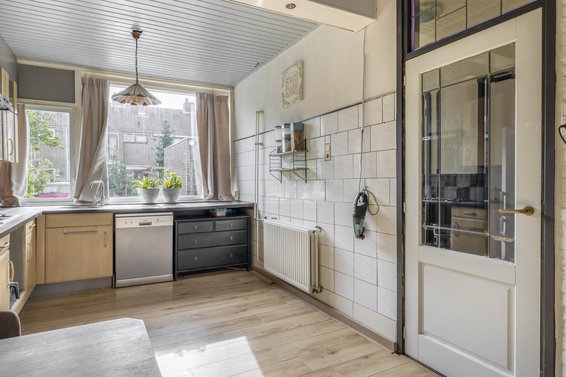 Via de voortuin en overdekte entree stap je binnen in de hal, waar je toegang hebt tot het toilet, de trapopgang en de doorzonwoonkamer. De woonkamer is licht dankzij de grote ramen aan voor- en achterzijde. De keuken ligt aan de voorzijde. Deze ruimte is nu eenvoudig, maar biedt veel mogelijkheden voor een moderne open keukenopstelling of juist een praktische hoekkeuken.