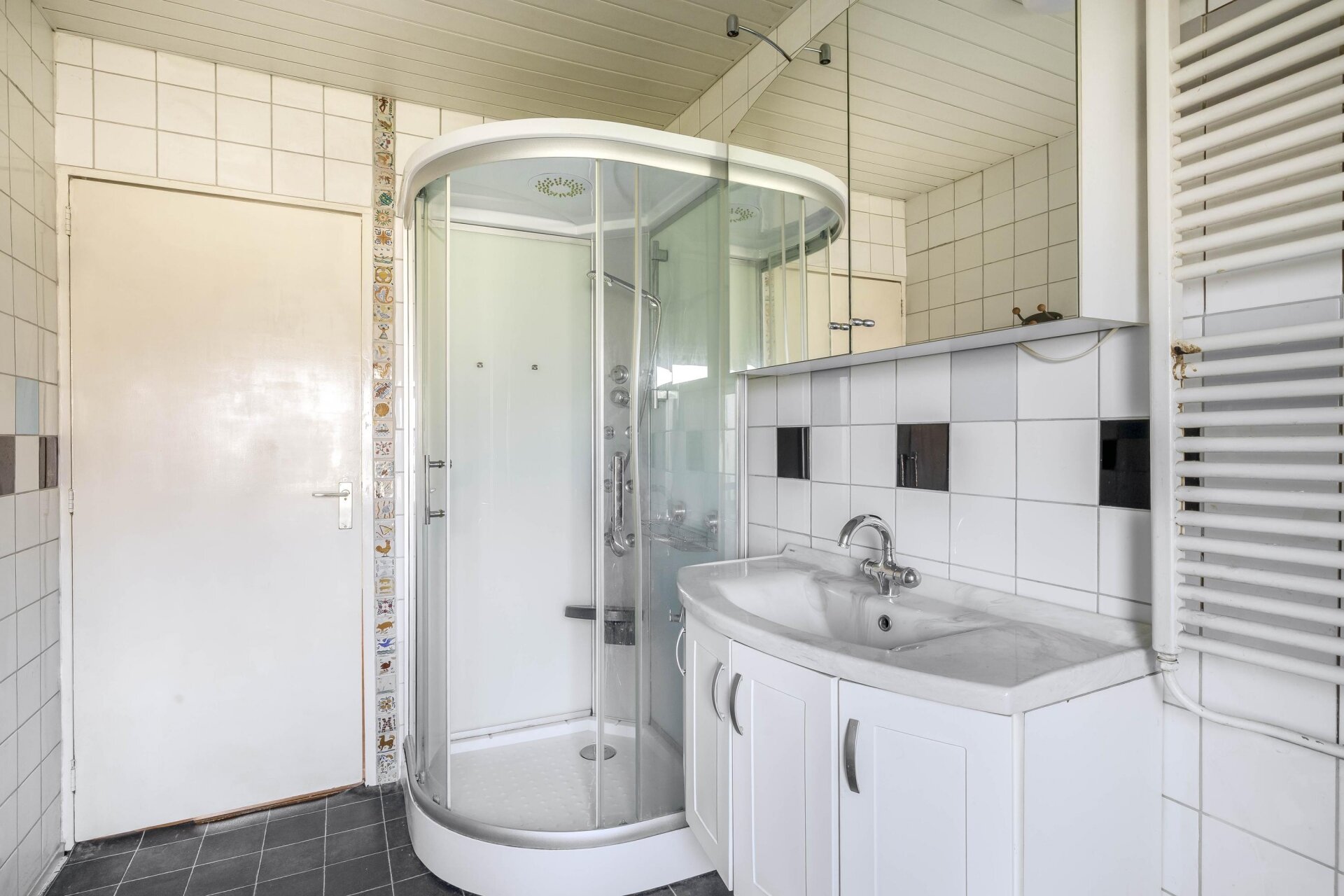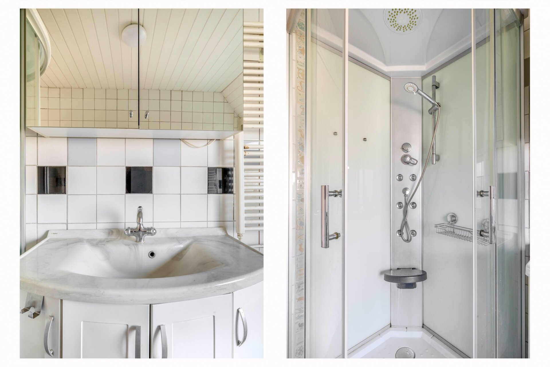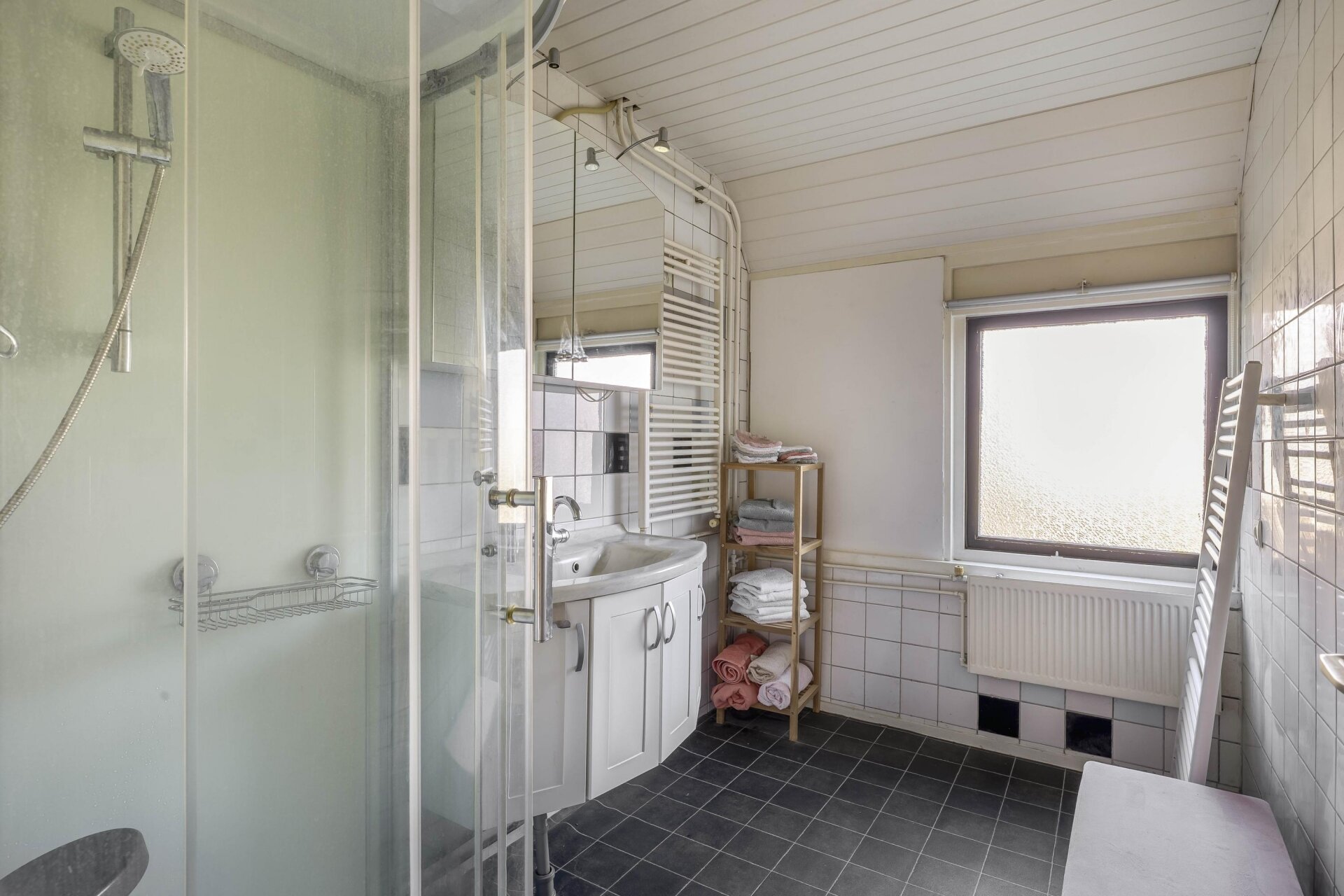 Op de eerste verdieping zijn twee slaapkamers te vinden. De grootste slaapkamer ligt aan de achterzijde van het huis, de tweede slaapkamer bevindt zich aan de voorzijde. Beide kamers zijn voorzien van daglicht en hebben een fijne maatvoering. De badkamer is uitgerust met een douchecabine, wastafelmeubel en radiator. Ook deze ruimte vraagt om een frisse update, maar vormt qua basis een prima vertrekpunt.