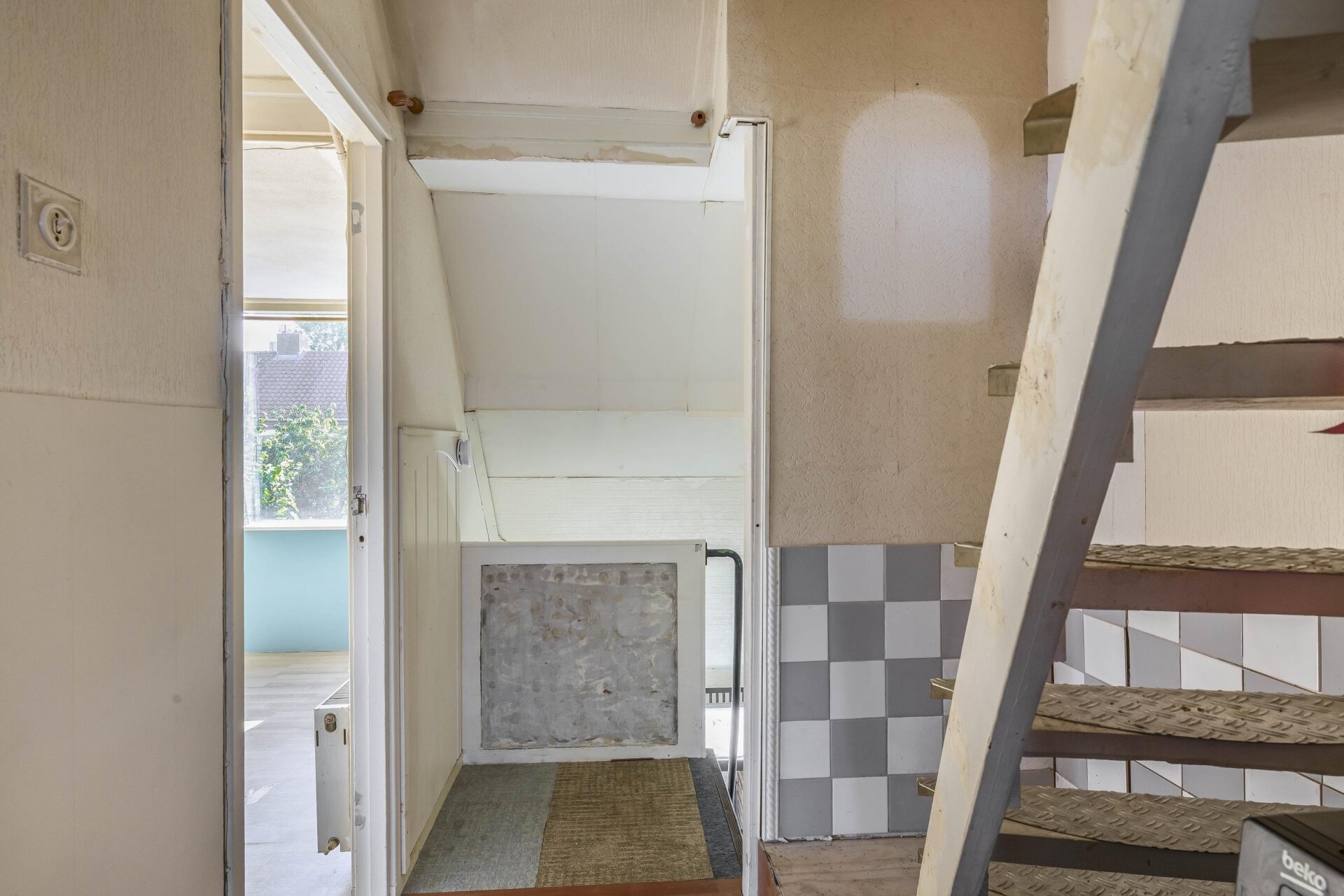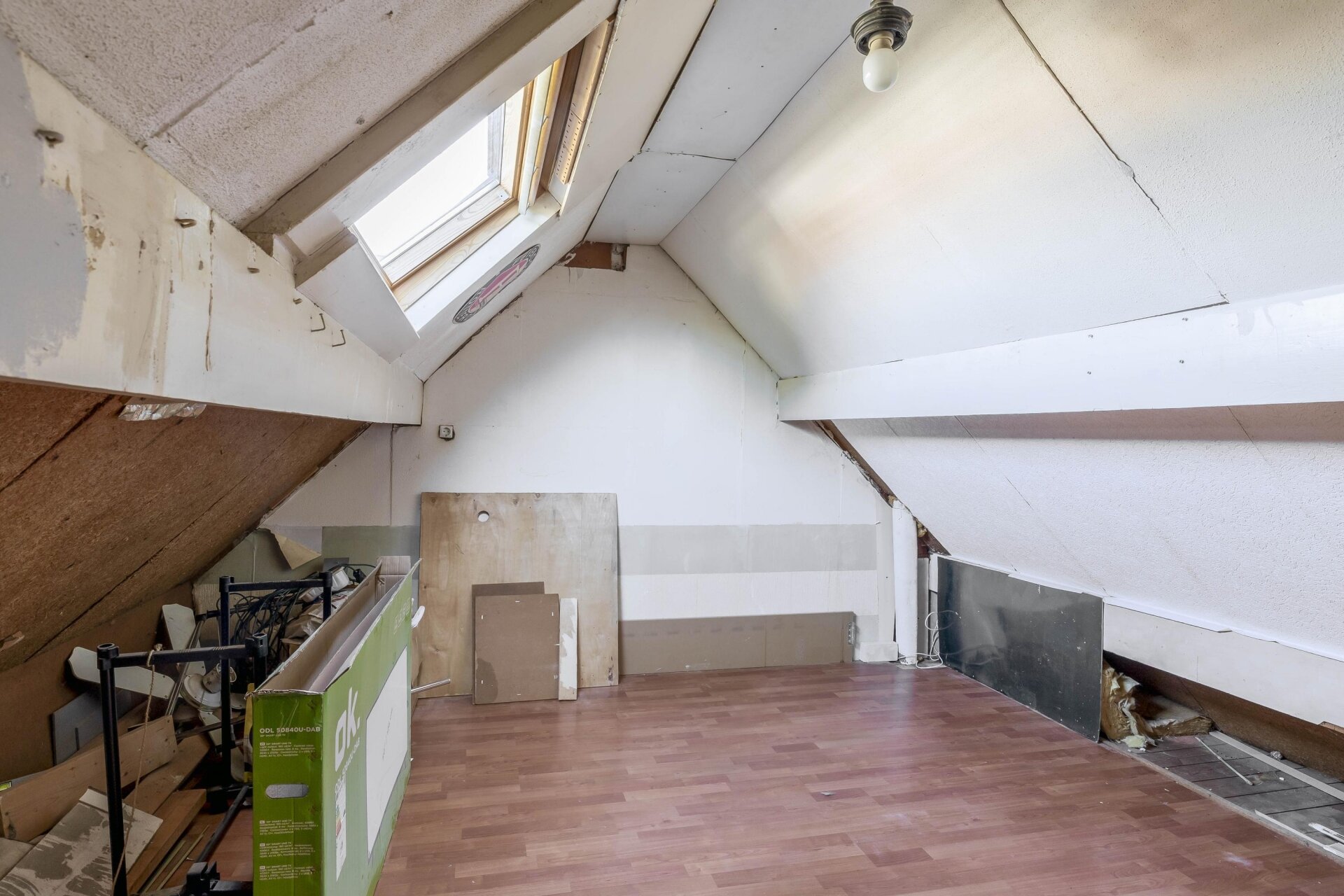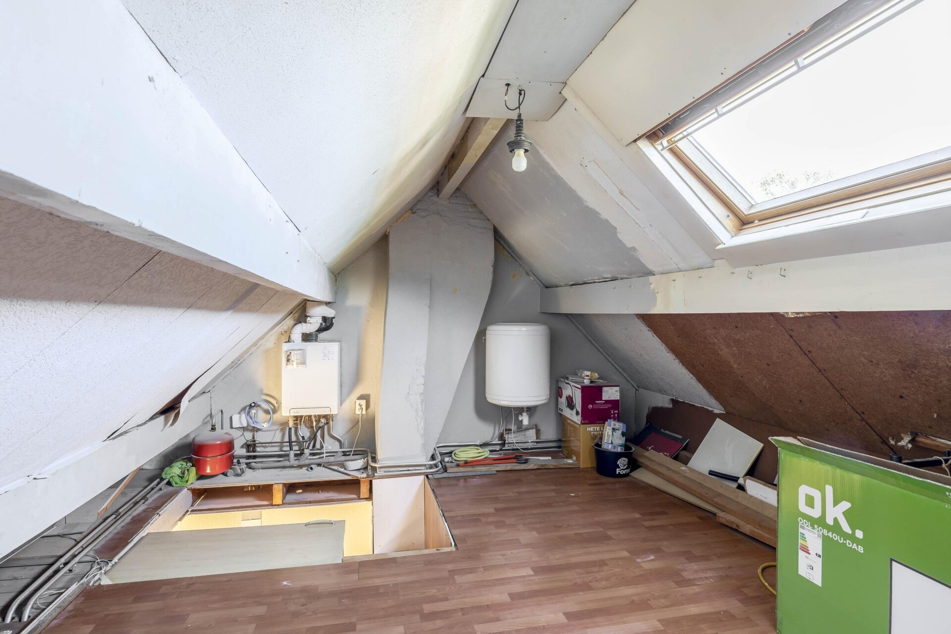 De zolderverdieping is via een vaste trap bereikbaar. Hier vind je een overloop met de opstelling van de CV-ketel en een grote zolderkamer onder het schuine dak. Deze verdieping leent zich uitstekend voor een extra slaapkamer, werkruimte of hobbykamer. Met een dakkapel maak je hier écht iets bijzonders van.