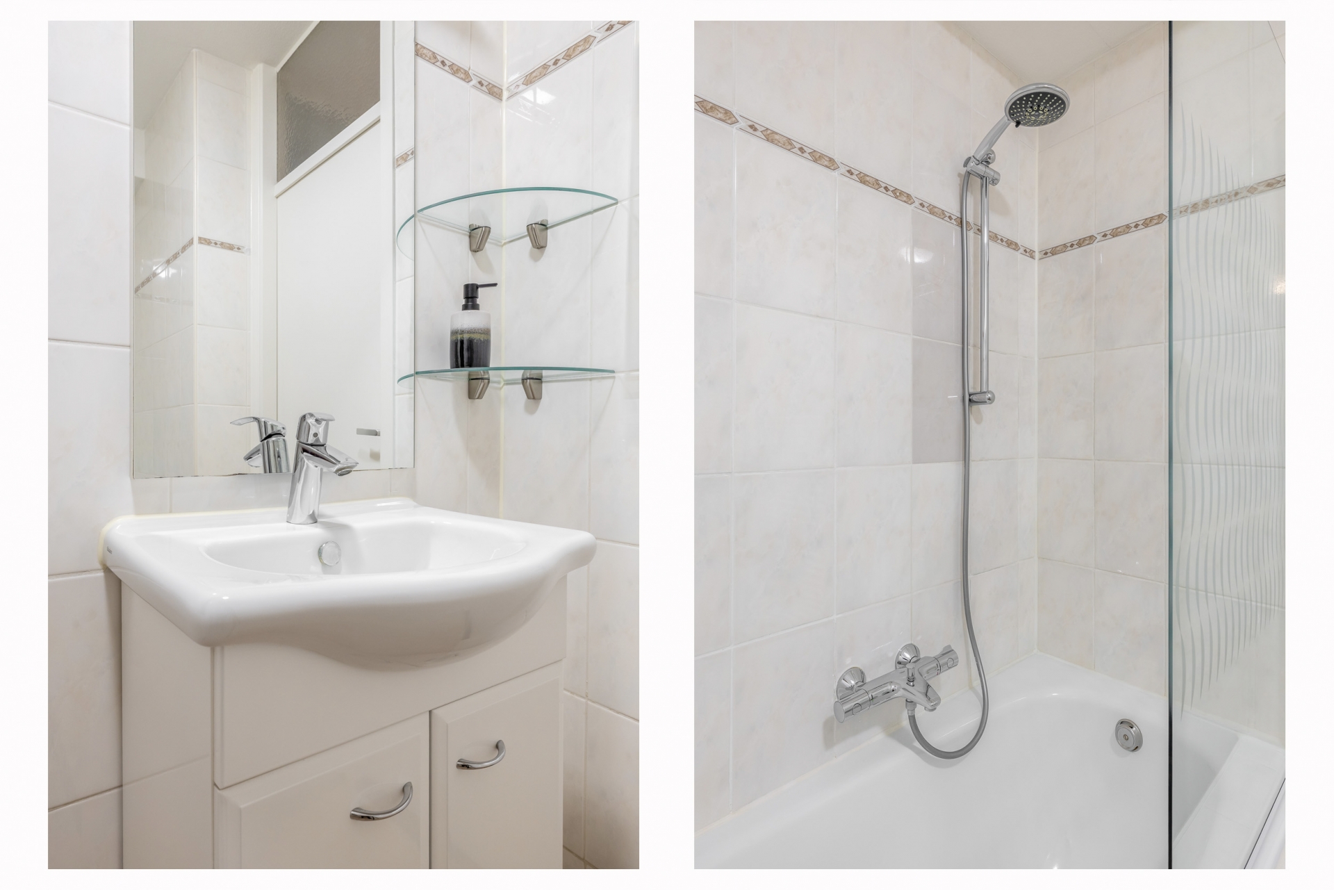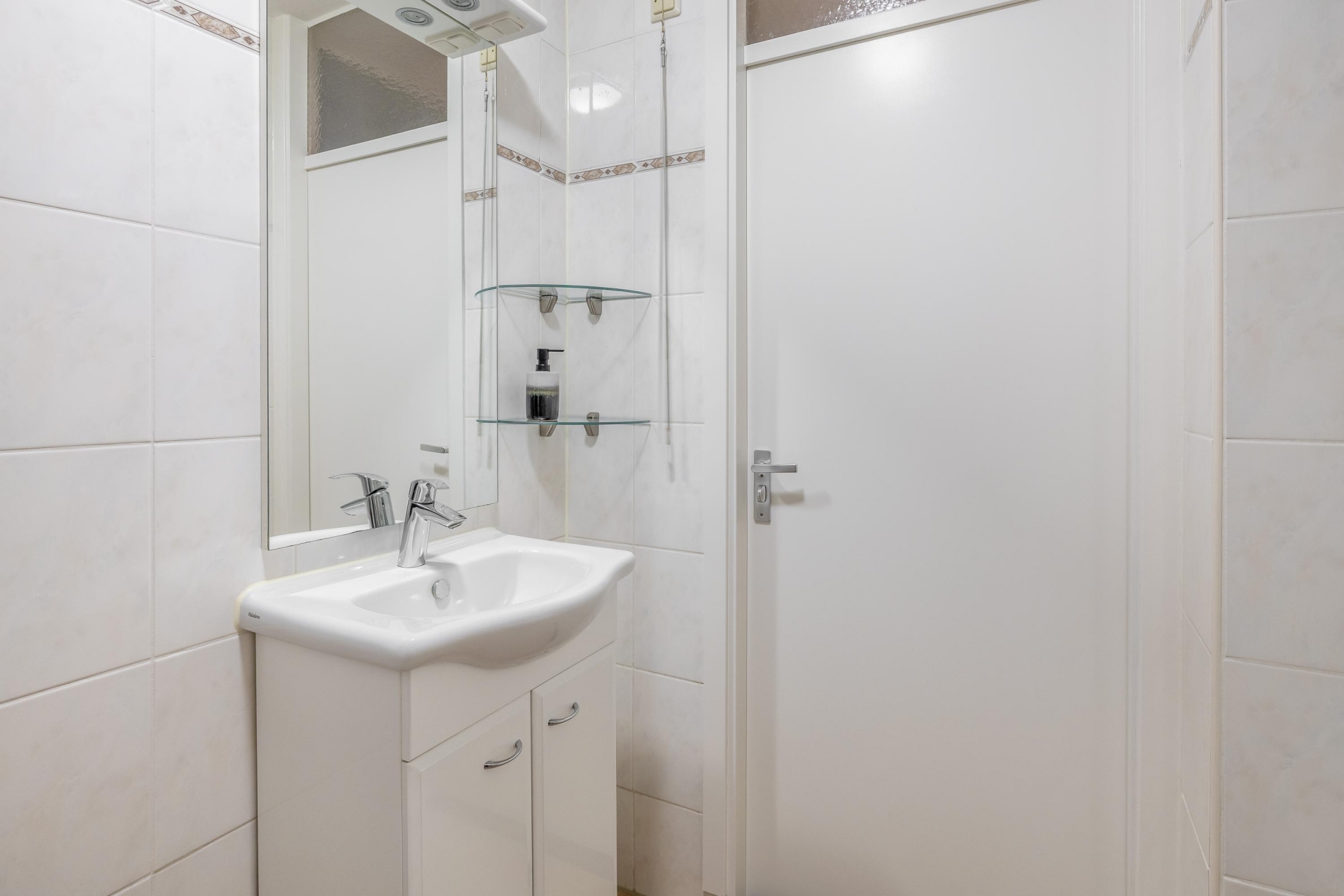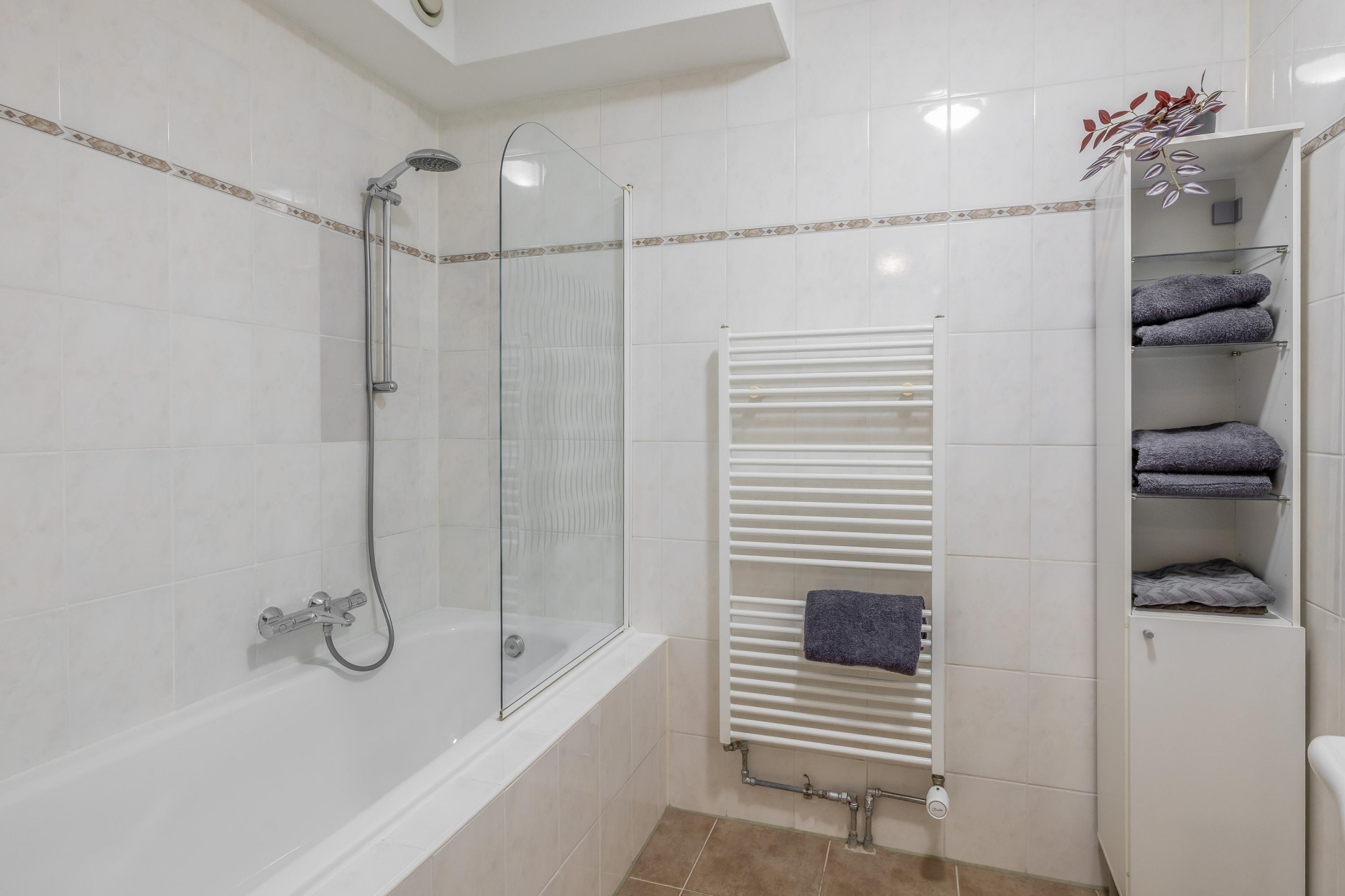 Centraal in het appartement bevindt zich de badkamer, uitgerust met een ligbad/douche, wastafelmeubel en designradiator.