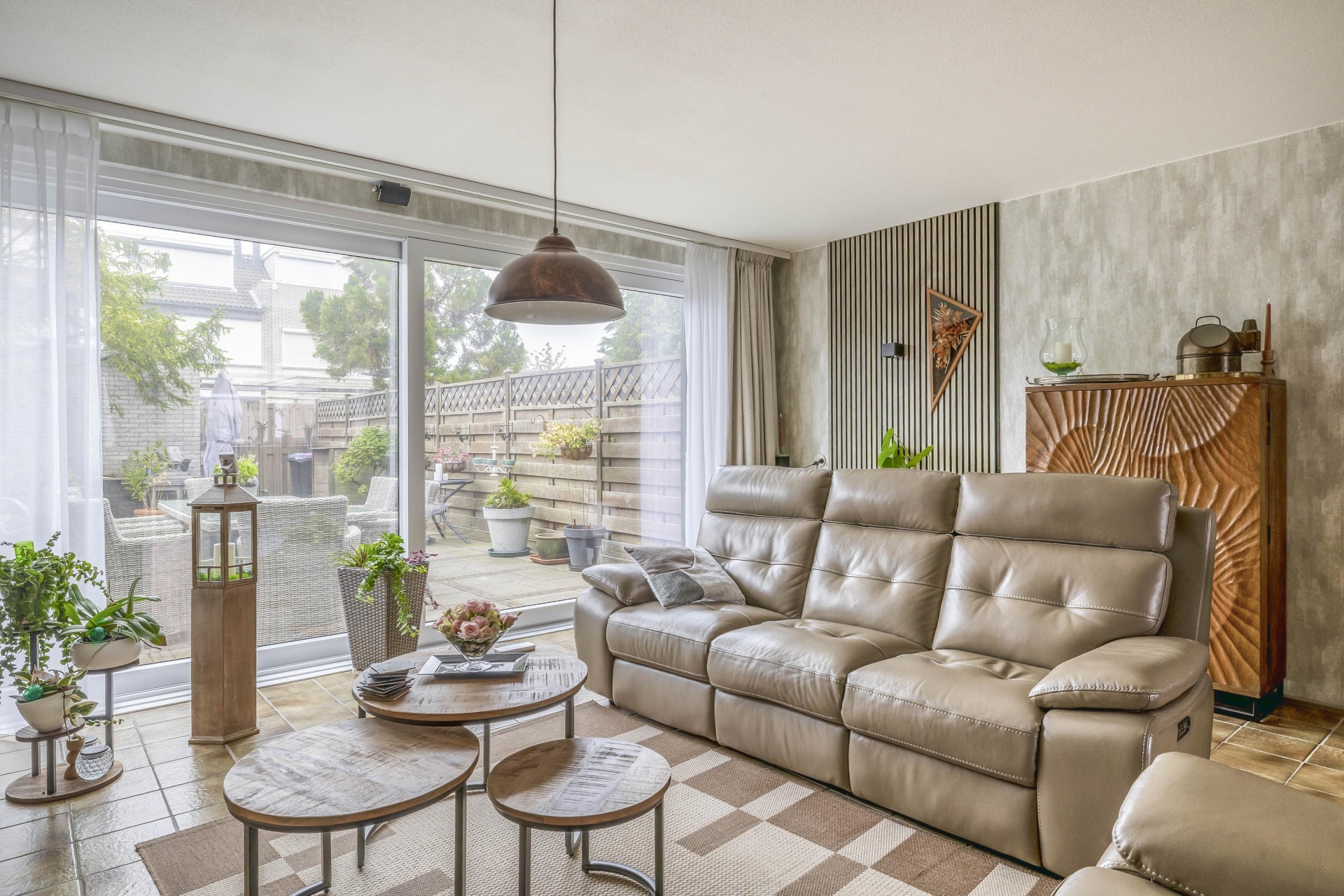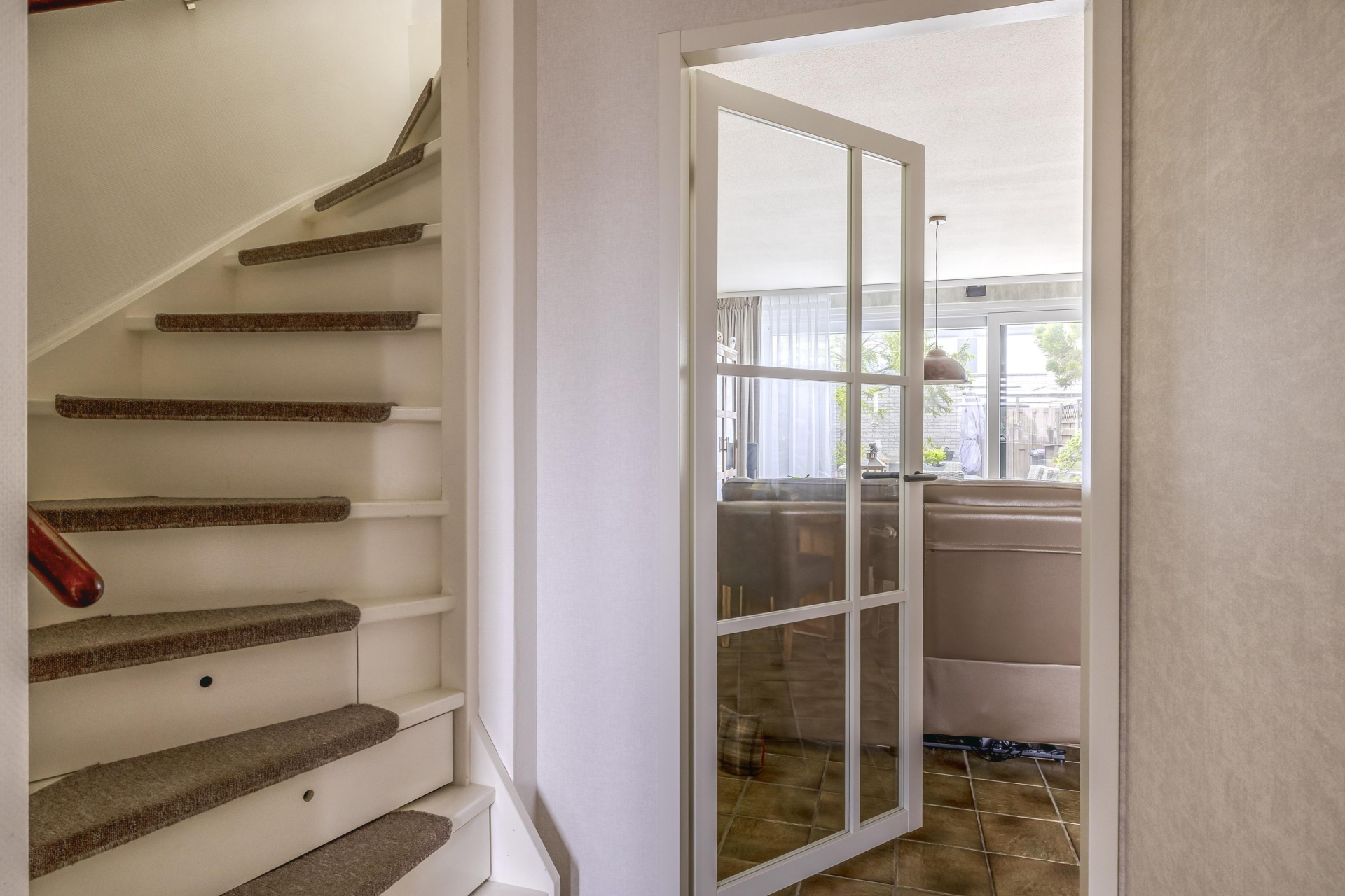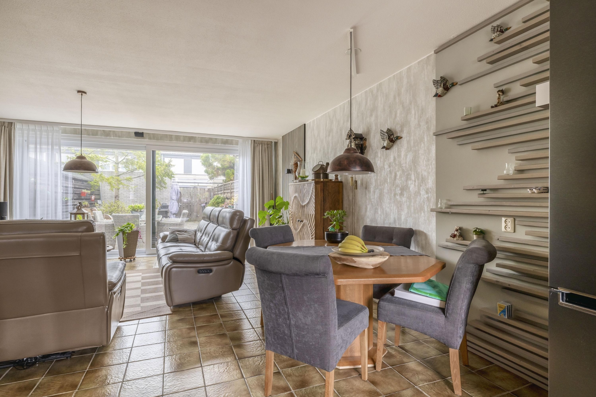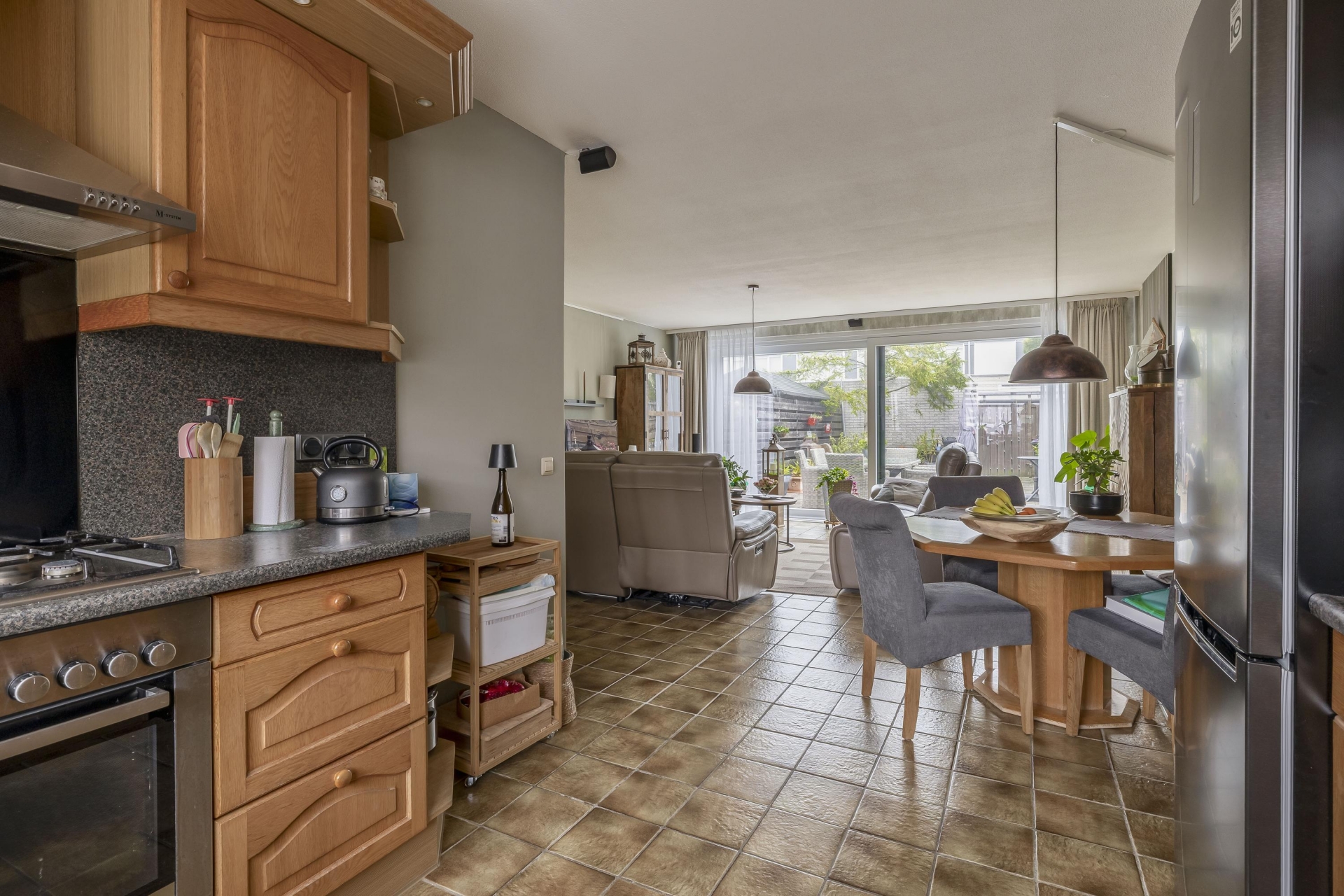 De woonkamer is tuingericht en dankzij de grote raampartij is het er de hele dag door heerlijk licht. De ruimte is praktisch in te delen met een ruime zithoek en aparte eethoek. Via de schuifpui loop je zo de achtertuin in – een fijne verlenging van je leefruimte.