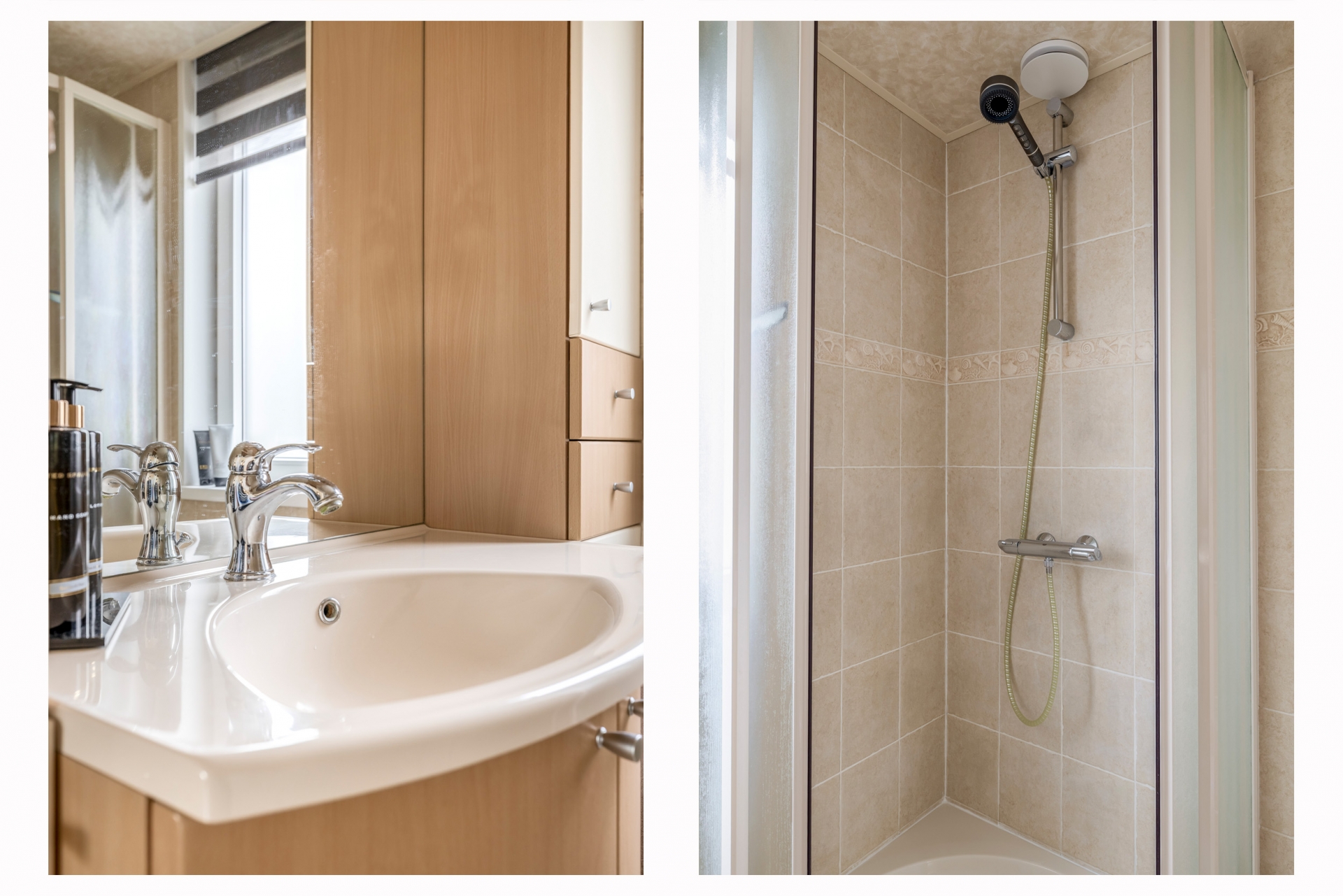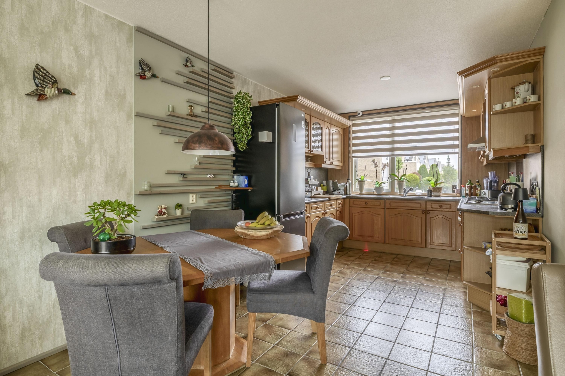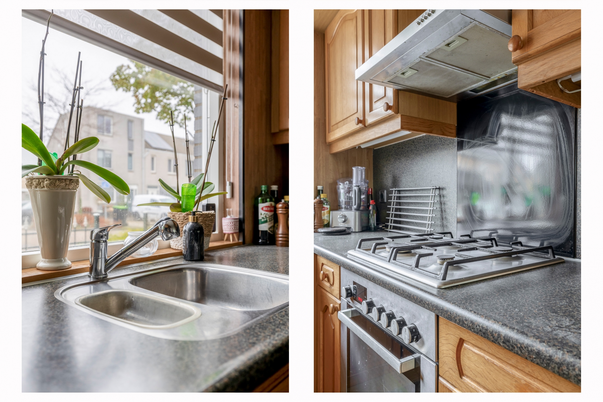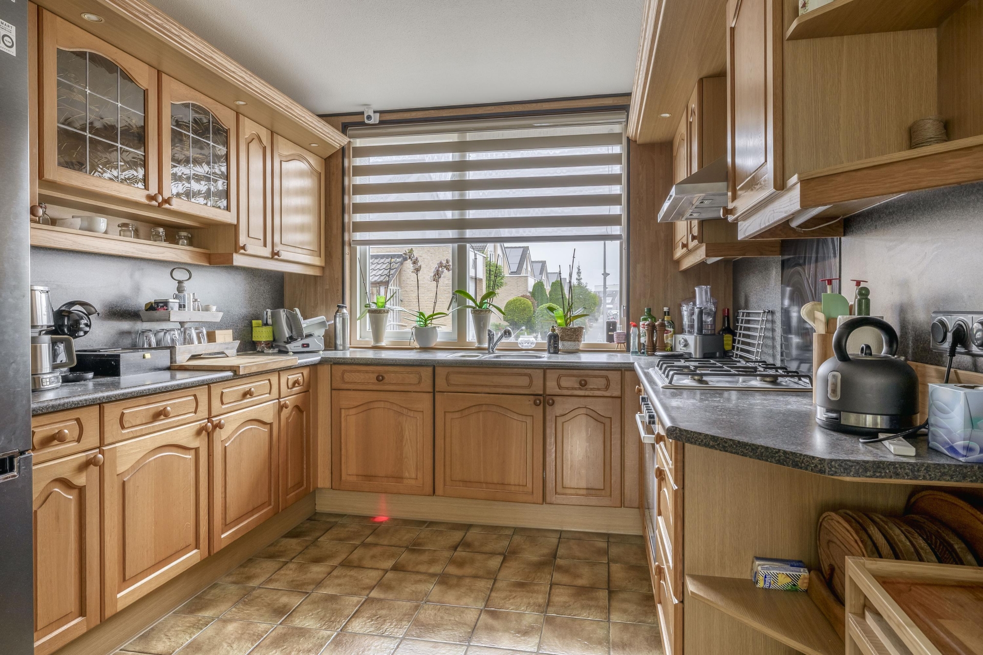 Aan de voorzijde vind je de royale keuken, uitgevoerd in een landelijke stijl met veel werk- en opbergruimte. De opstelling biedt voldoende plek voor al je kookgerei en apparatuur. Hier geniet je tijdens het koken van vrij uitzicht over de rustige straat.