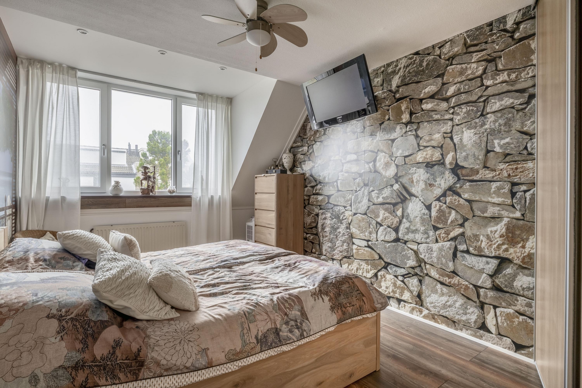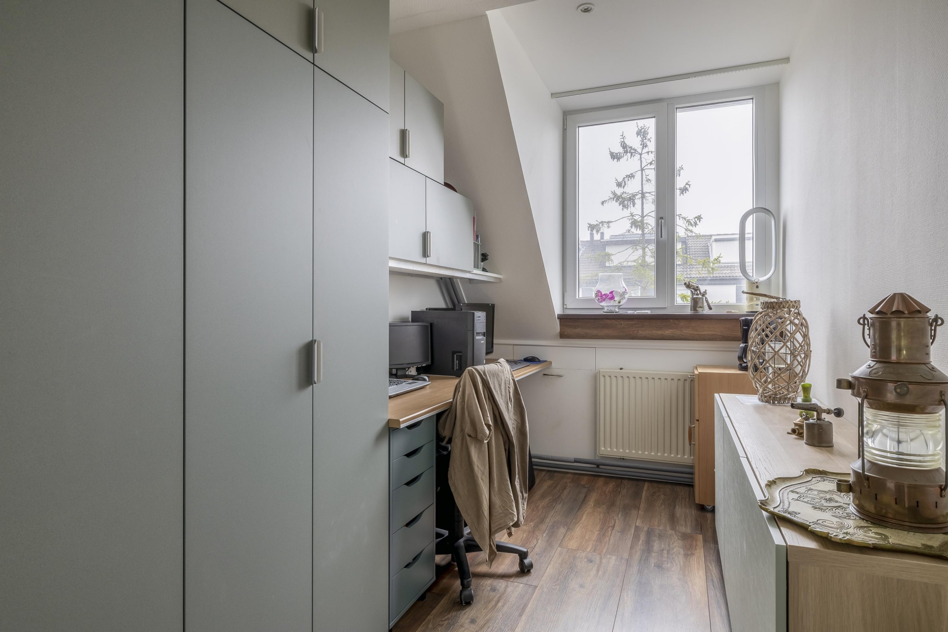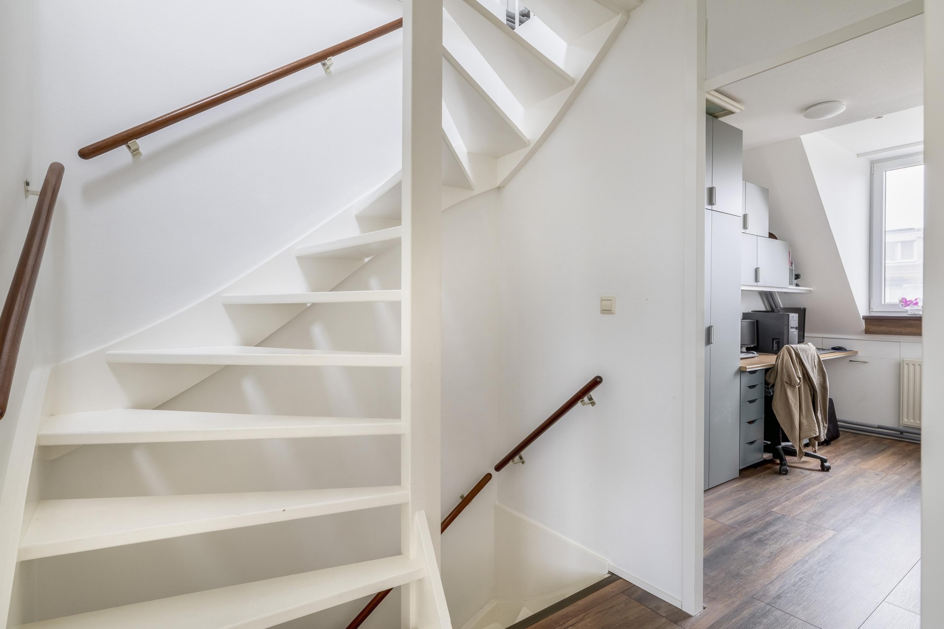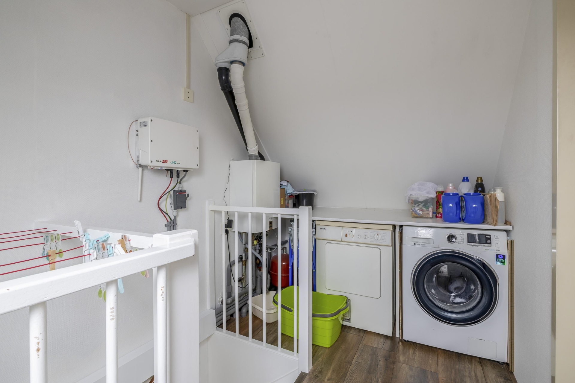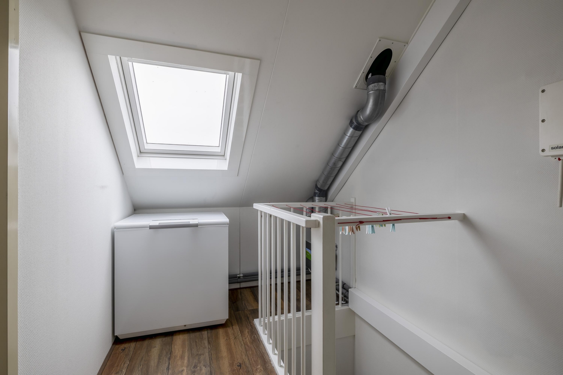 De zolderverdieping is in gebruik als vierde slaapkamer, voorzien van dakramen en extra bergruimte achter knieschotten. De ruime overloop is ingericht als wasruimte met opstelplaats voor de wasmachine, droger, cv-installatie én omvormer van de zonnepanelen. Ook hier ligt een nette vloer, wat de zolder tot een volwaardige verdieping maakt. Dankzij de vernieuwde meterkast (2023) en goede isolatie is dit huis technisch klaar voor de toekomst.