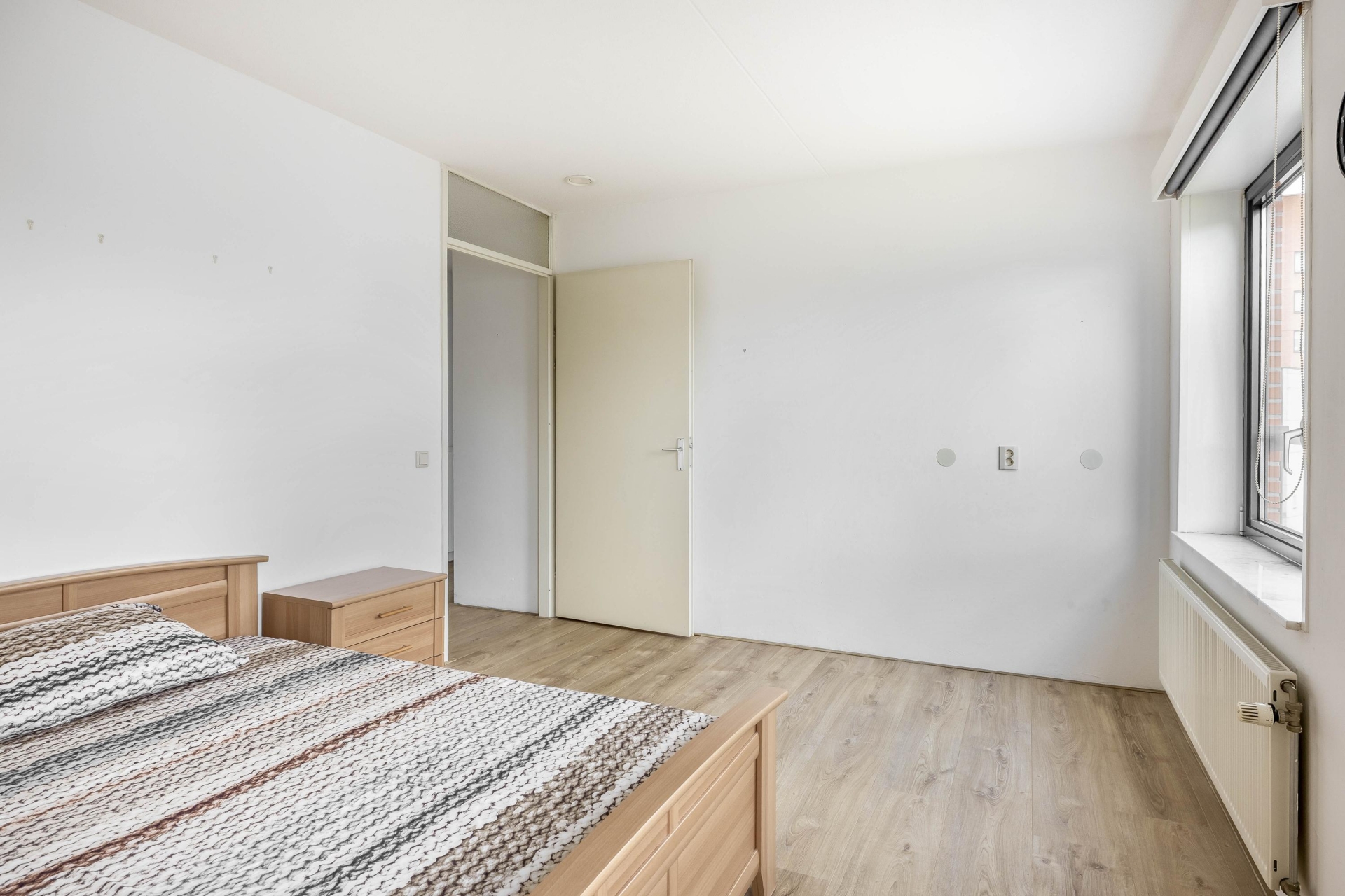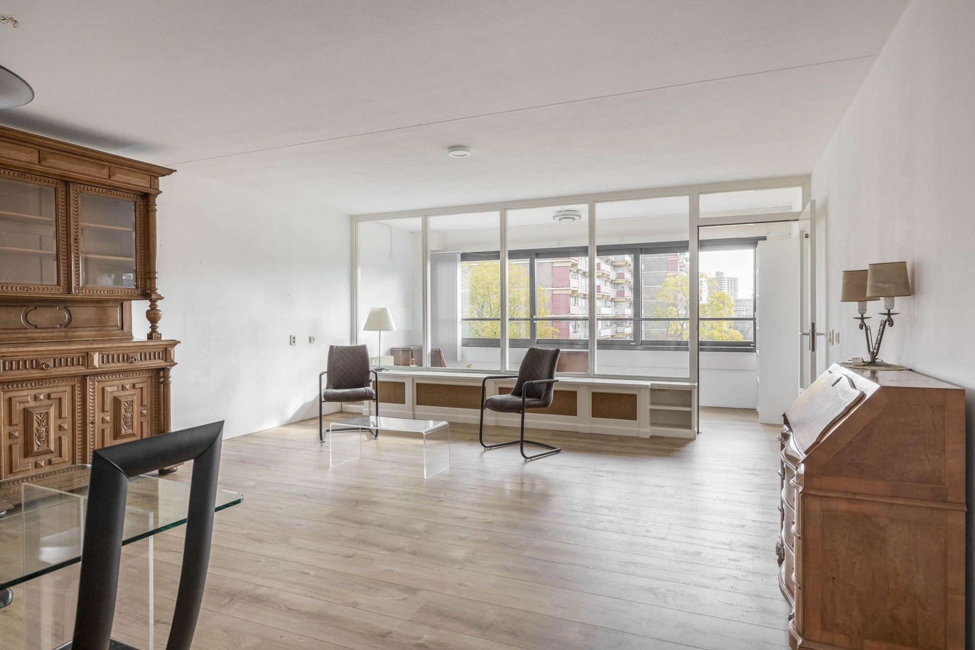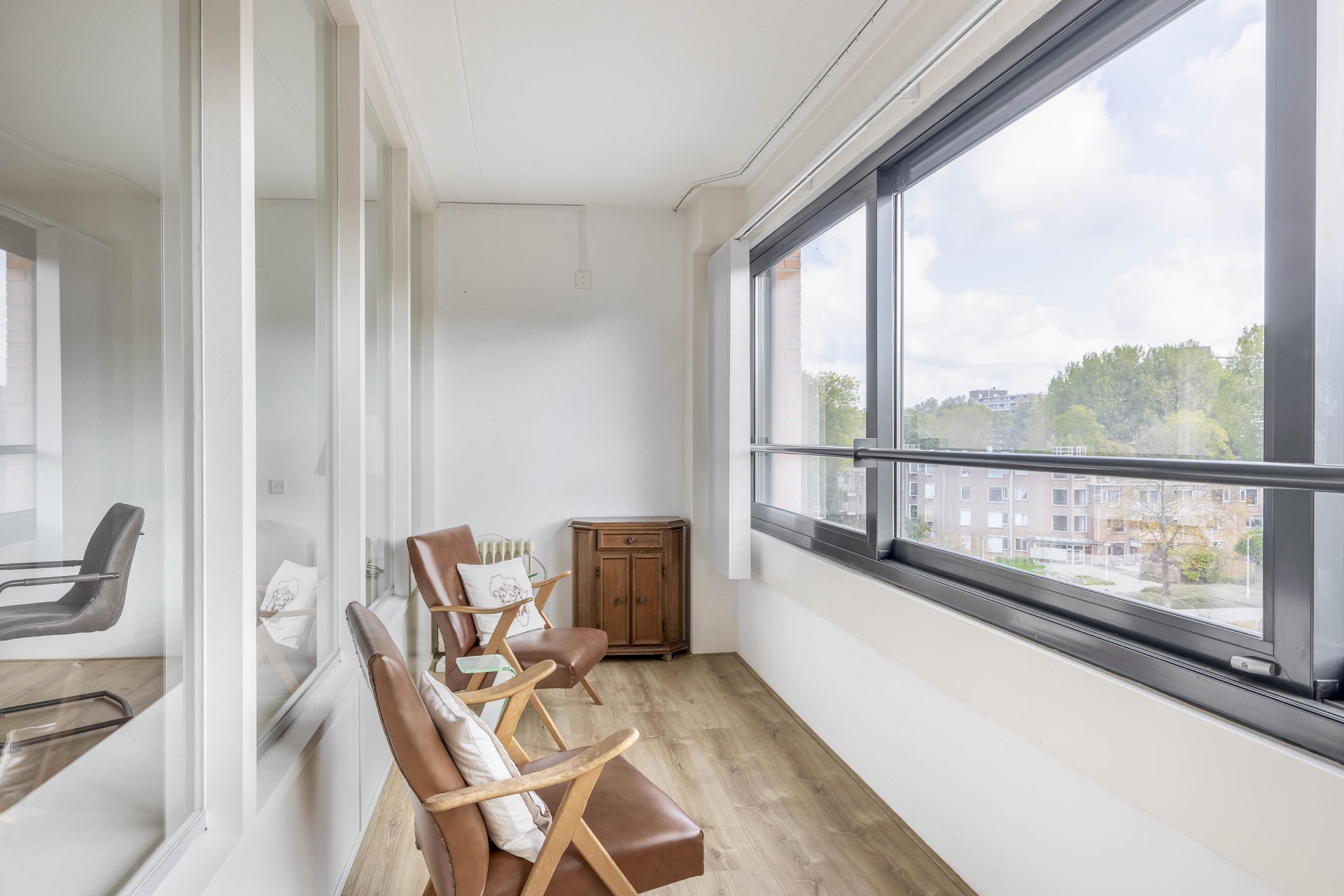 Zodra je binnenkomt, valt de ruime indeling direct op. De woonkamer is royaal opgezet en heeft dankzij de grote raampartijen een fijne lichtinval. De loggia aan de achterzijde, bereikbaar via de woonkamer, is een heerlijk verlengstuk van de leefruimte. Deze is voorzien van grote schuiframen waardoor je ook bij minder weer comfortabel zit, met een prettig vrij uitzicht over de groene omgeving en bebouwing in de verte. De vloer is netjes afgewerkt en de wanden zijn in neutrale kleurstelling gehouden, wat een rustige basis geeft aan de ruimte.