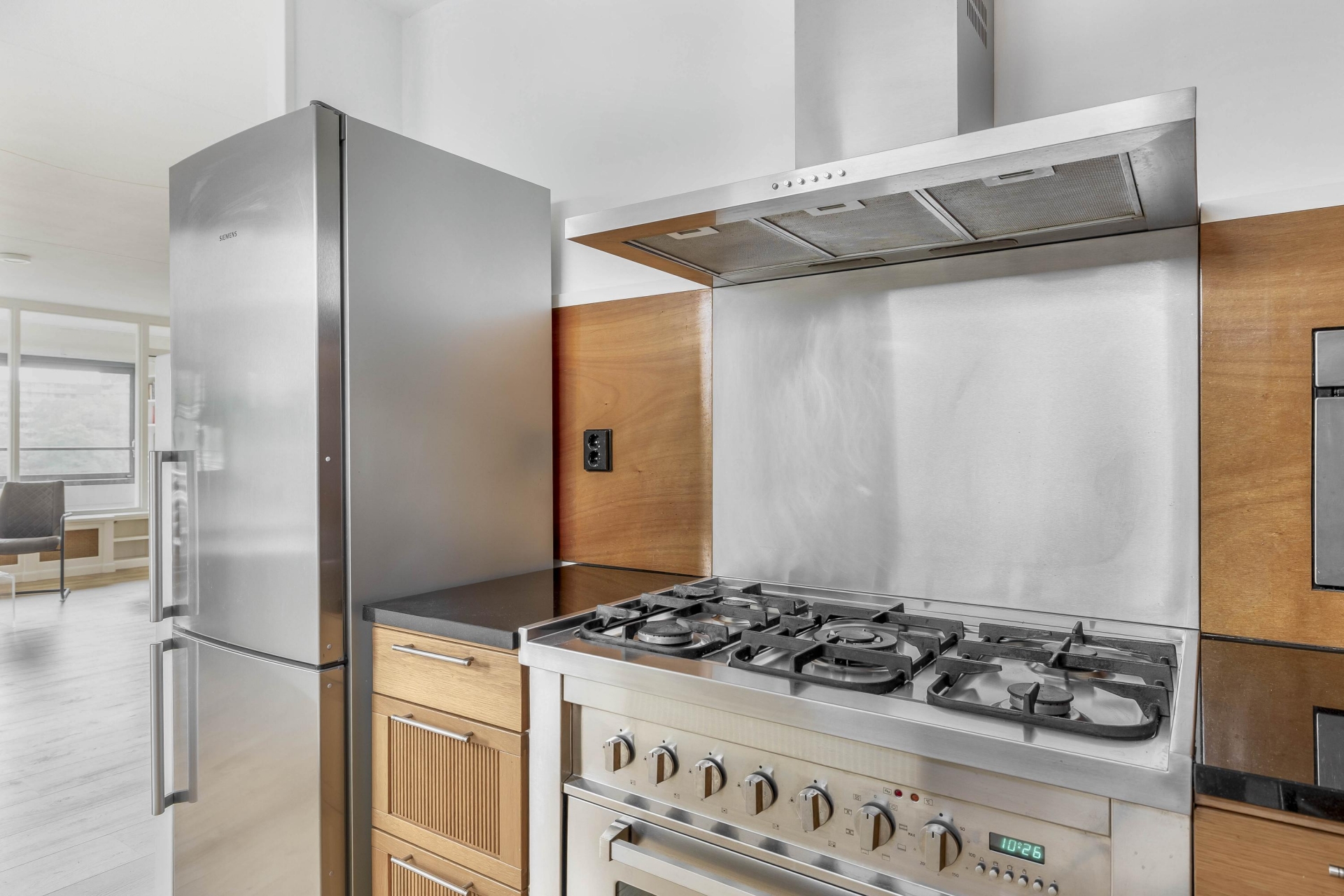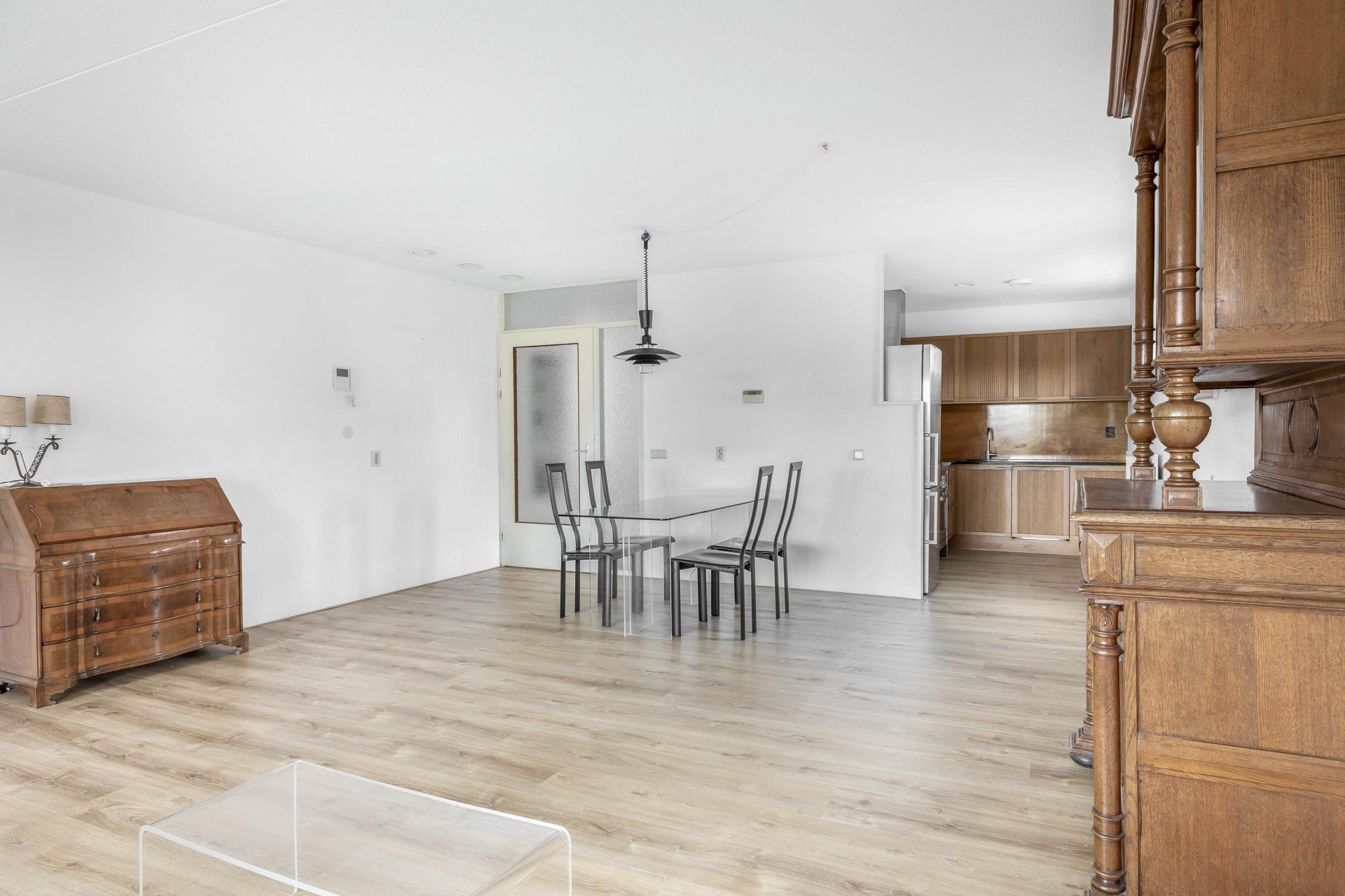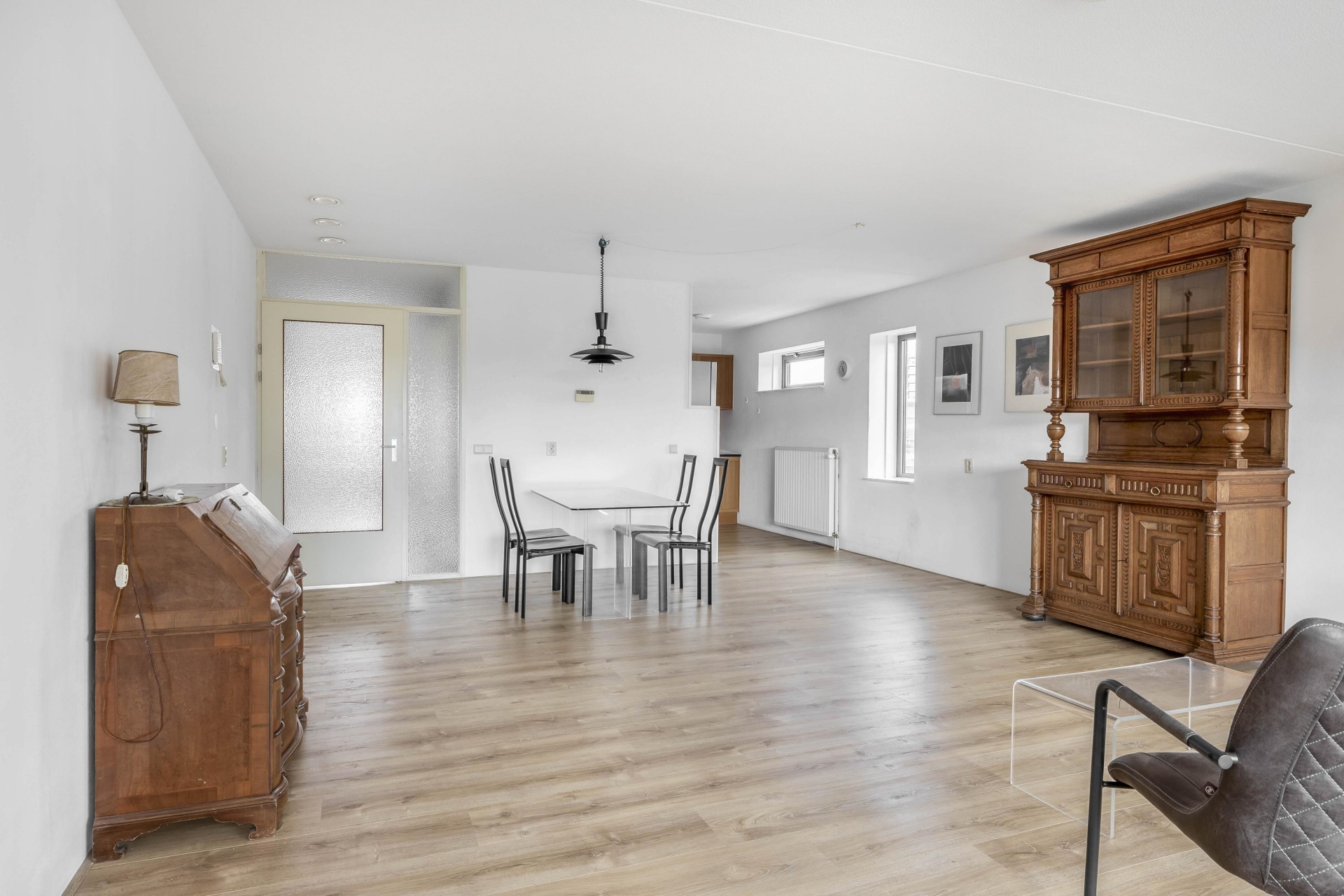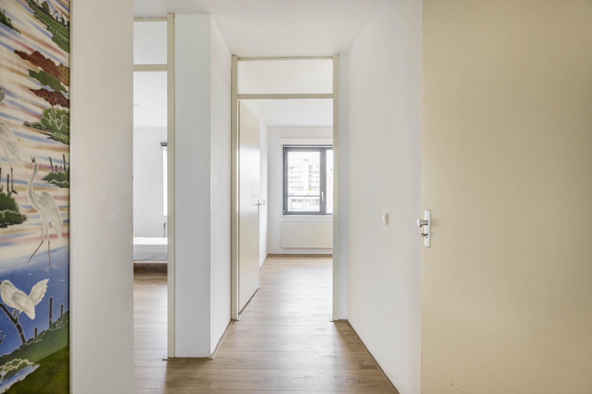 Zodra je binnenkomt, valt de ruime indeling direct op. De woonkamer is royaal opgezet en heeft dankzij de grote raampartijen een fijne lichtinval. De loggia aan de achterzijde, bereikbaar via de woonkamer, is een heerlijk verlengstuk van de leefruimte. Deze is voorzien van grote schuiframen waardoor je ook bij minder weer comfortabel zit, met een prettig vrij uitzicht over de groene omgeving en bebouwing in de verte. De vloer is netjes afgewerkt en de wanden zijn in neutrale kleurstelling gehouden, wat een rustige basis geeft aan de ruimte.