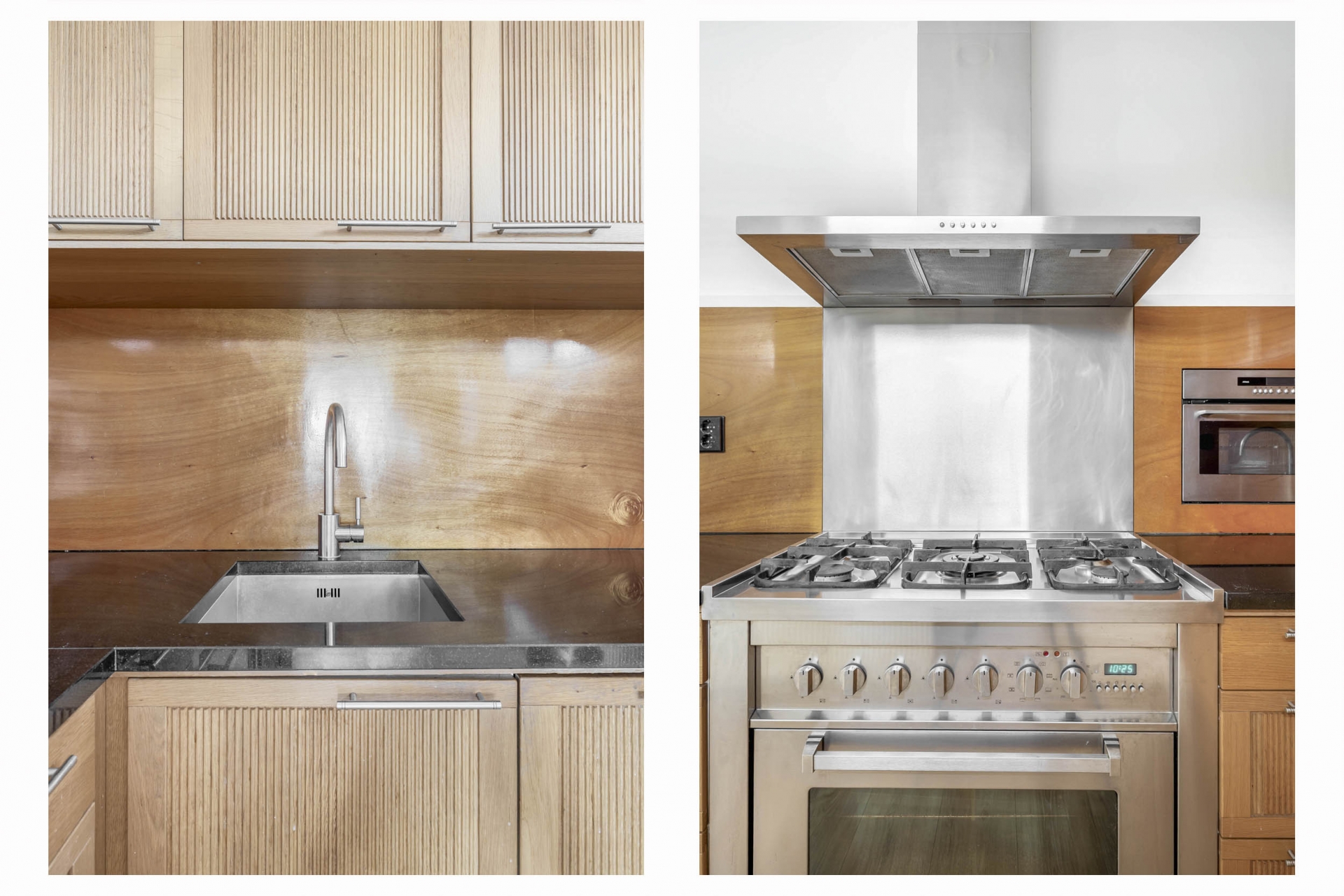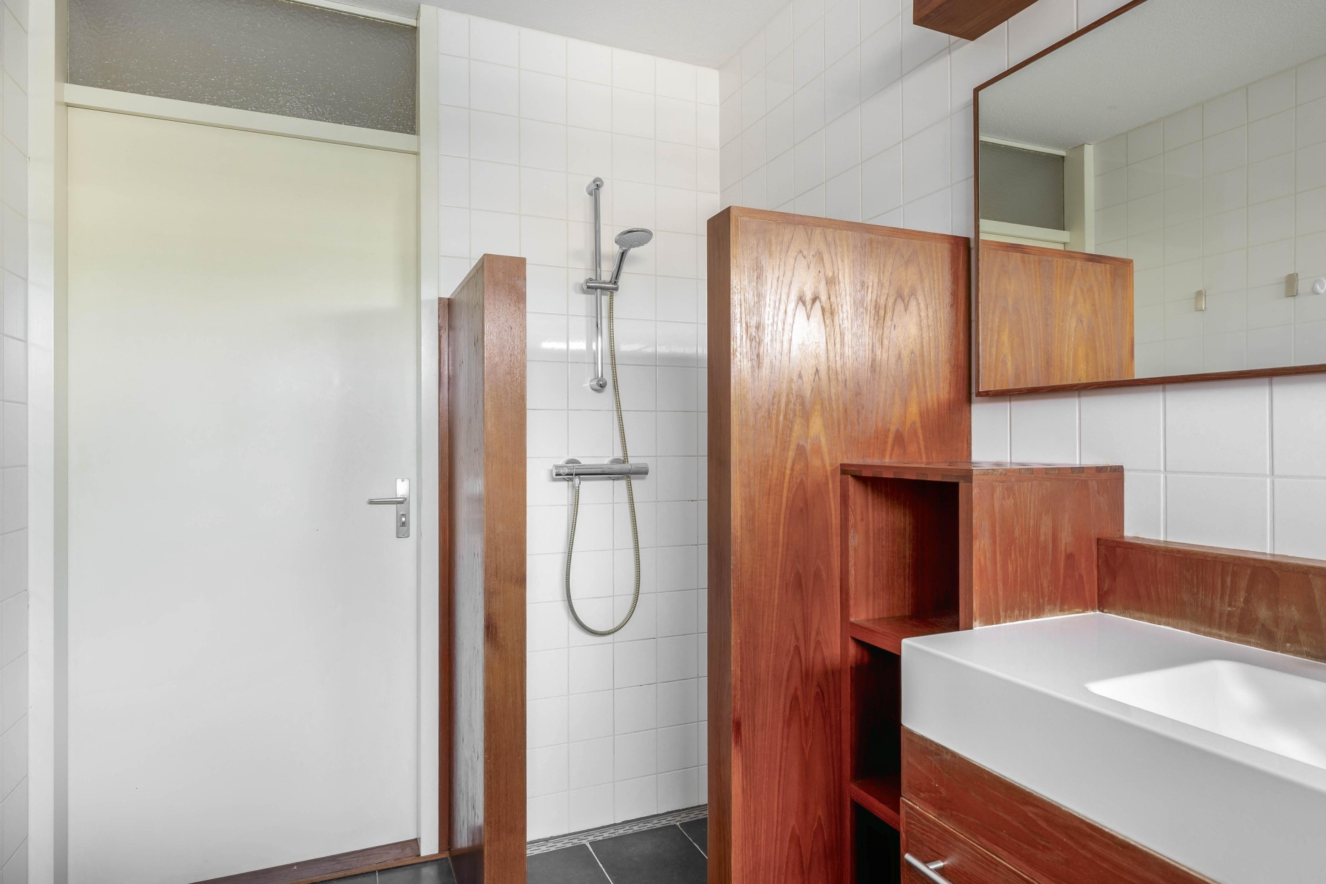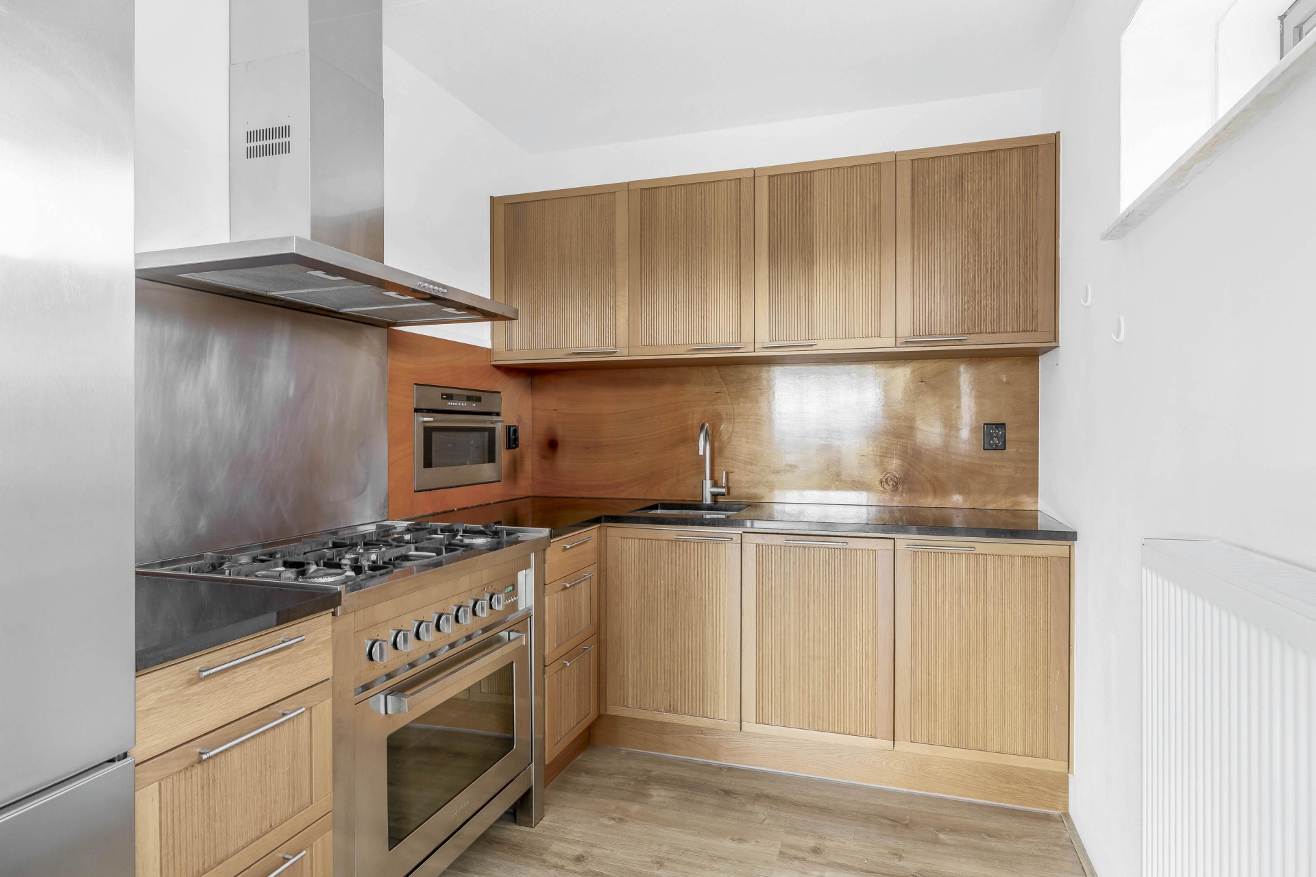 De open keuken is slim geplaatst in een L-opstelling en voorzien van diverse inbouwapparatuur, waaronder een 5-pits gasfornuis met oven, een afzuigkap, magnetron, koel-/vriescombinatie en vaatwasser. De houten afwerking van de kasten geeft een warme uitstraling, terwijl de roestvrijstalen accenten het geheel een stoere touch geven. De badkamer is uitgevoerd in wit met donkergrijze tegels en heeft een praktische indeling met een ruime inloopdouche, ligbad en een breed wastafelmeubel met houten omlijsting. Een apart toilet bevindt zich in de hal, evenals de inpandige berging met aansluitingen voor wasmachine en droger.