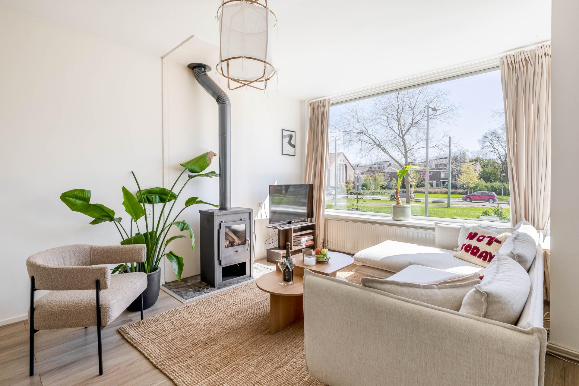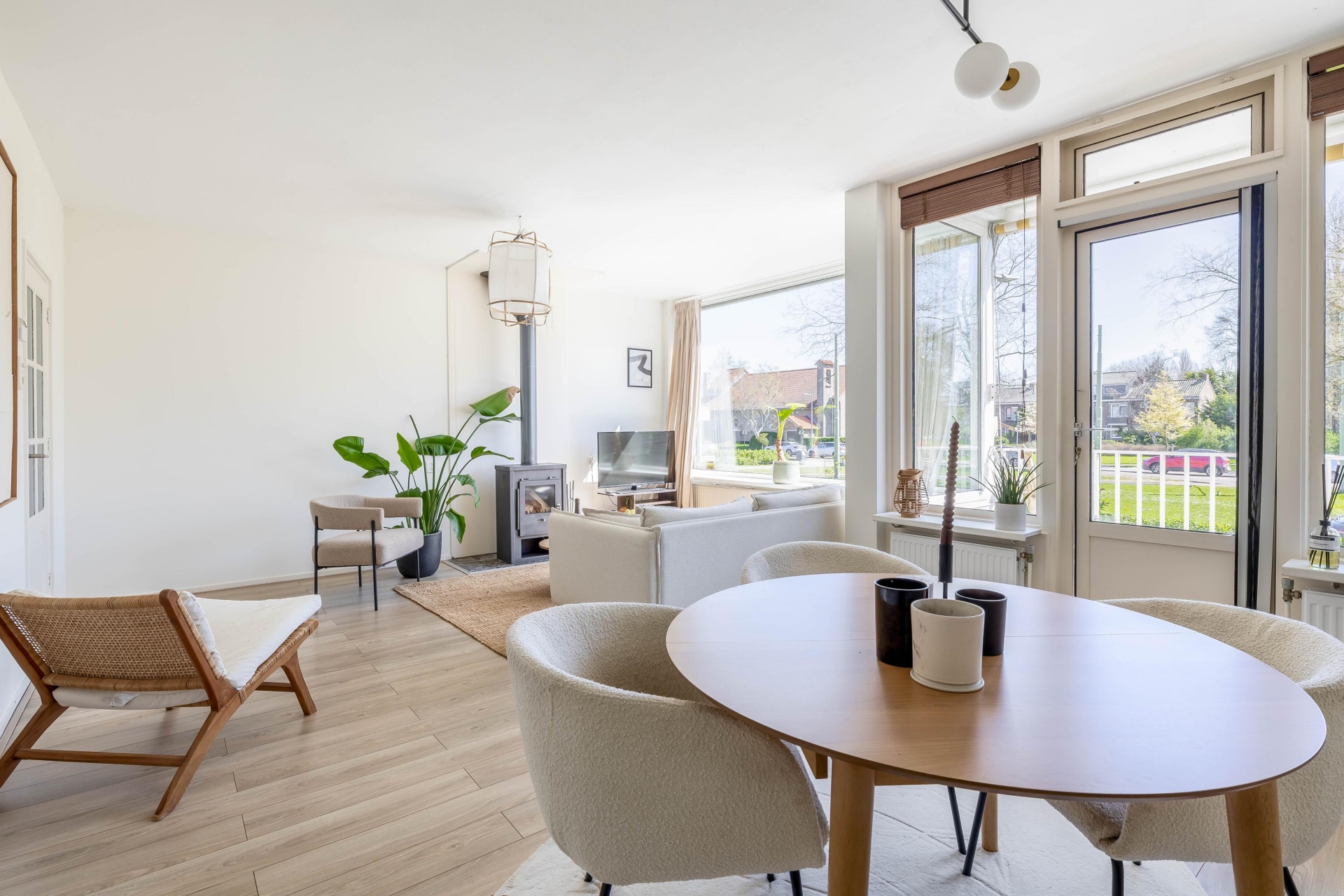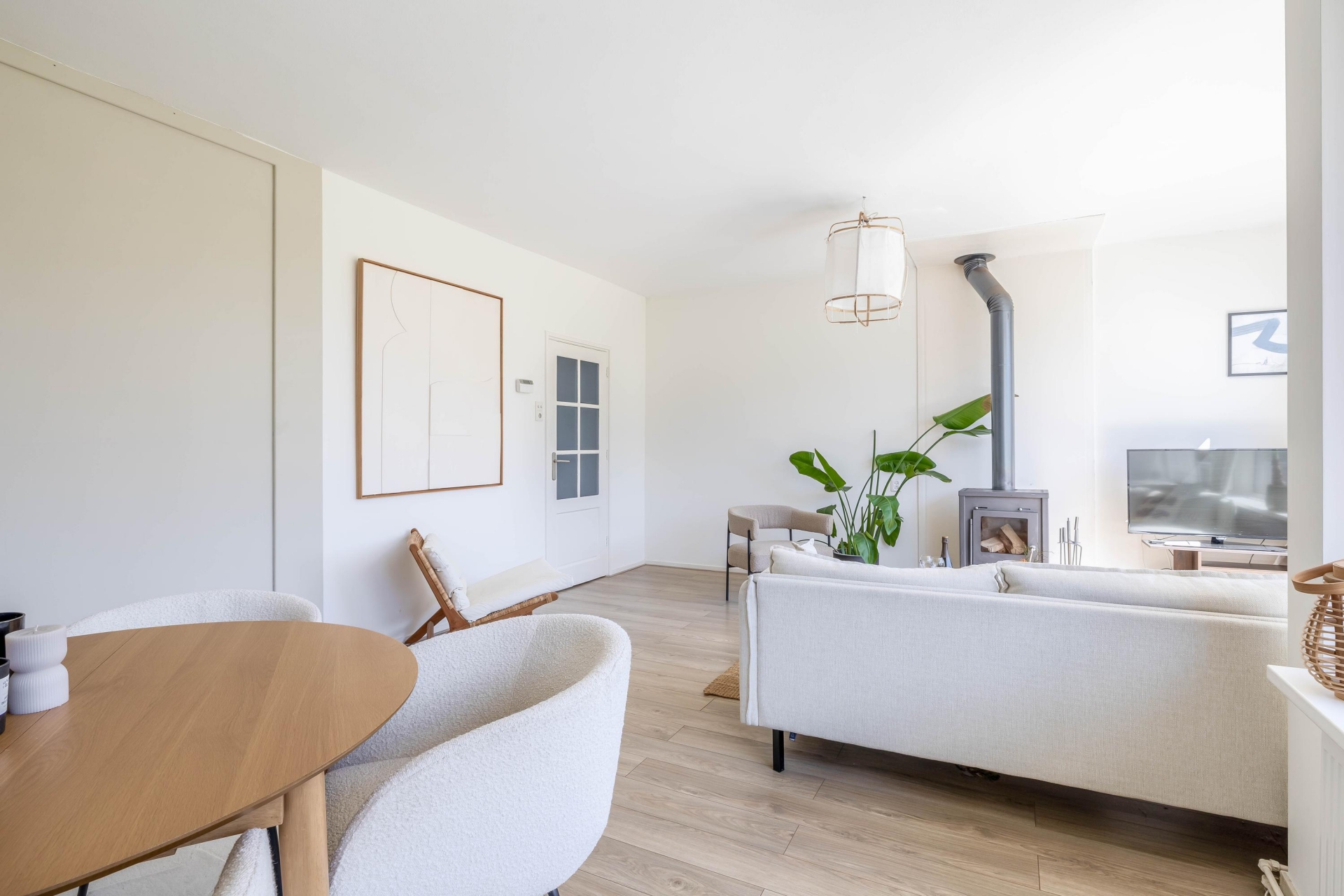 De woonkamer is opvallend licht en ruim opgezet, met grote raampartijen en een prettig uitzicht over het groen aan de voorzijde. De strakke afwerking, gestucte plafonds en de sfeervolle allesbrander zorgen voor een warme en verzorgde uitstraling. Hier creëer je moeiteloos een fijne zithoek én een gezellige eethoek, met altijd zicht op buiten.