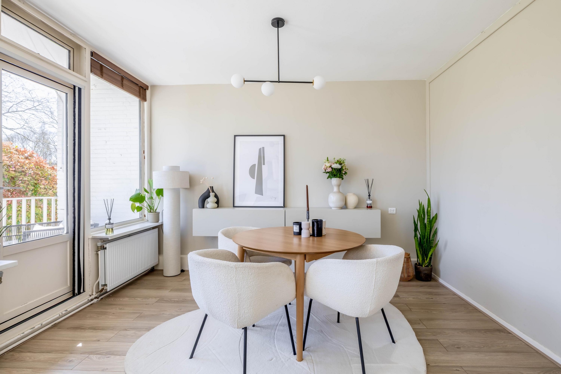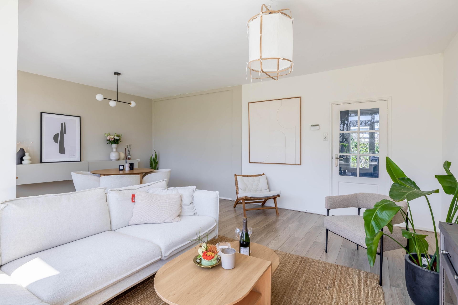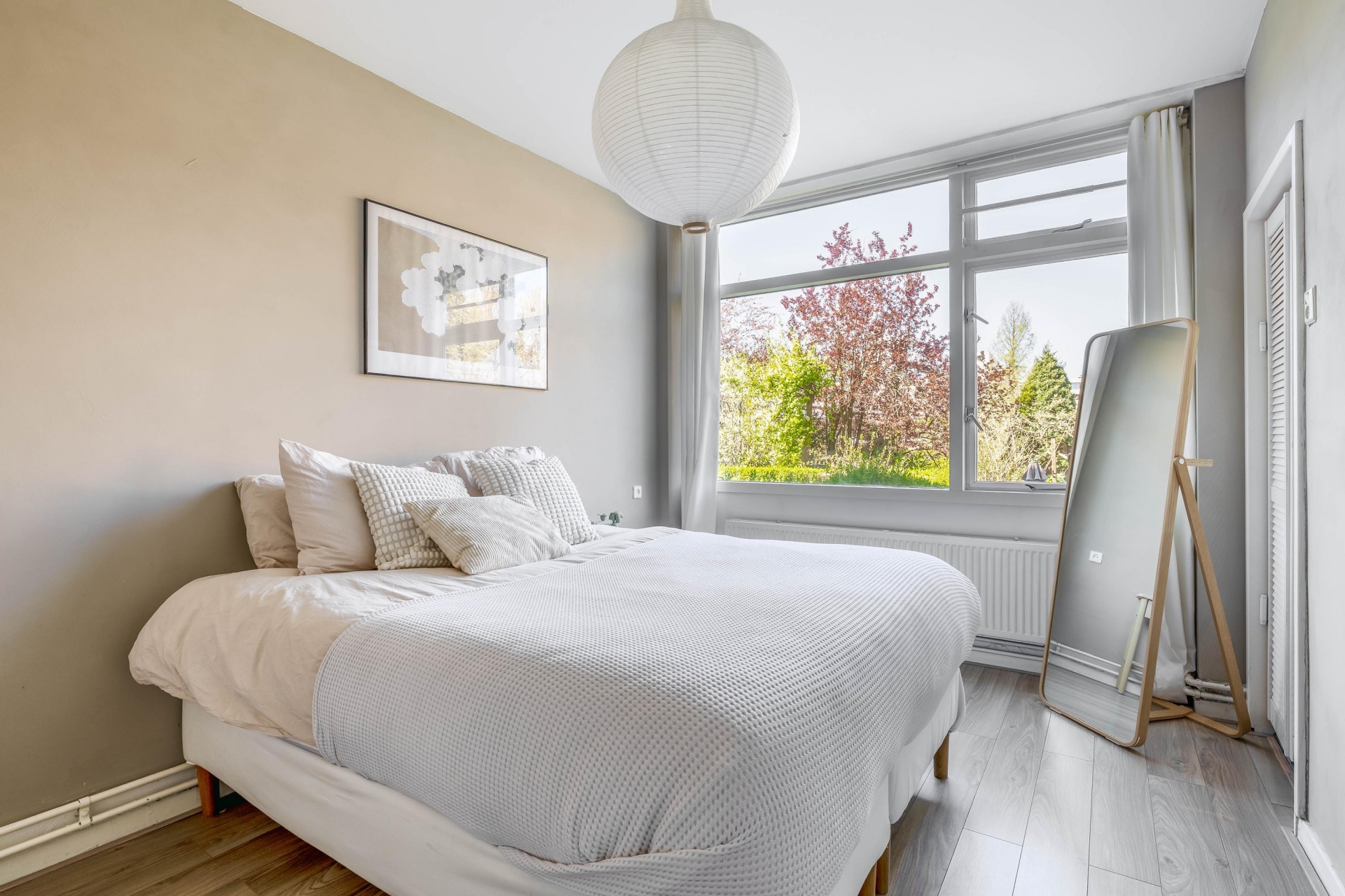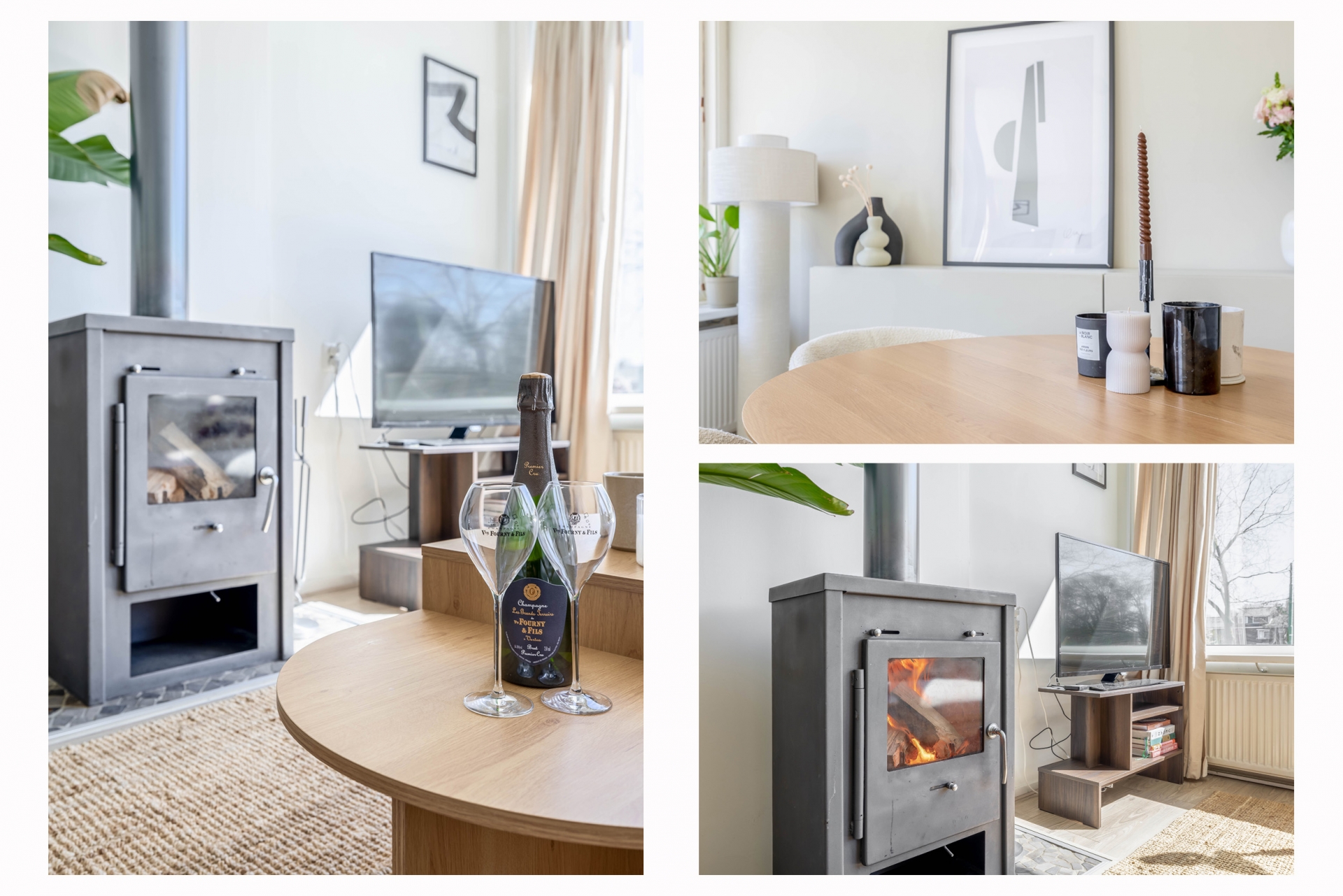De woonkamer is opvallend licht en ruim opgezet, met grote raampartijen en een prettig uitzicht over het groen aan de voorzijde. De strakke afwerking, gestucte plafonds en de sfeervolle allesbrander zorgen voor een warme en verzorgde uitstraling. Hier creëer je moeiteloos een fijne zithoek én een gezellige eethoek, met altijd zicht op buiten.