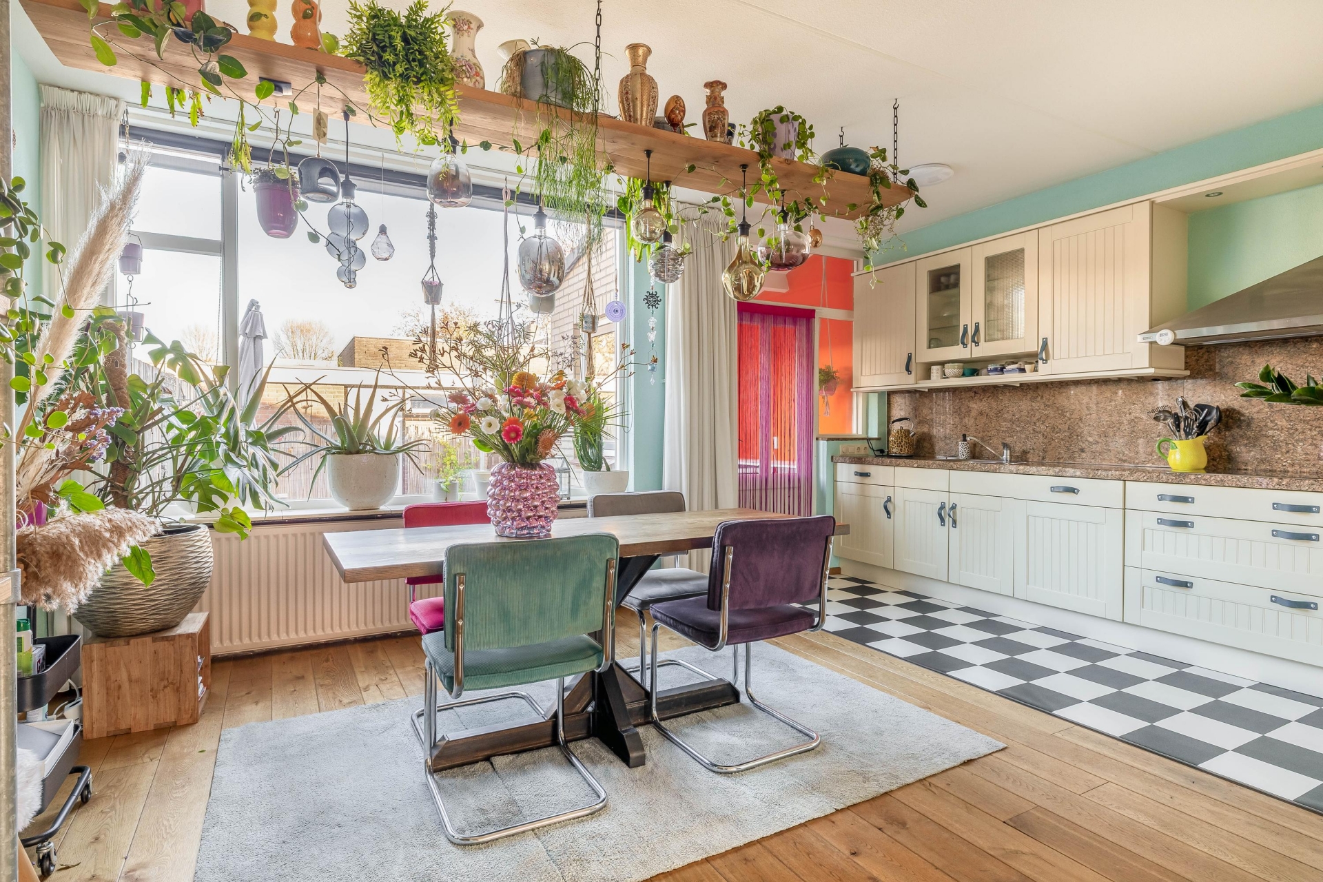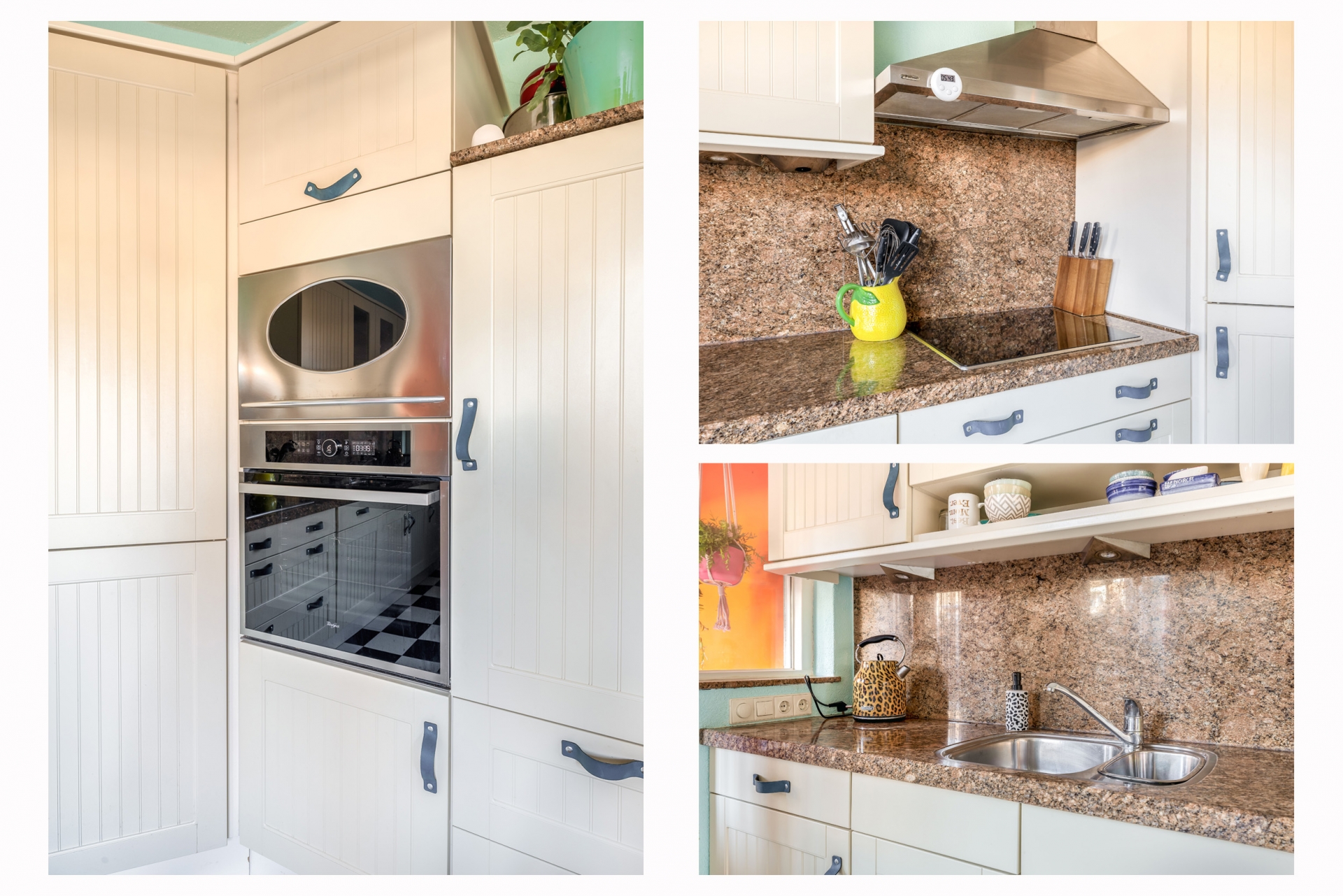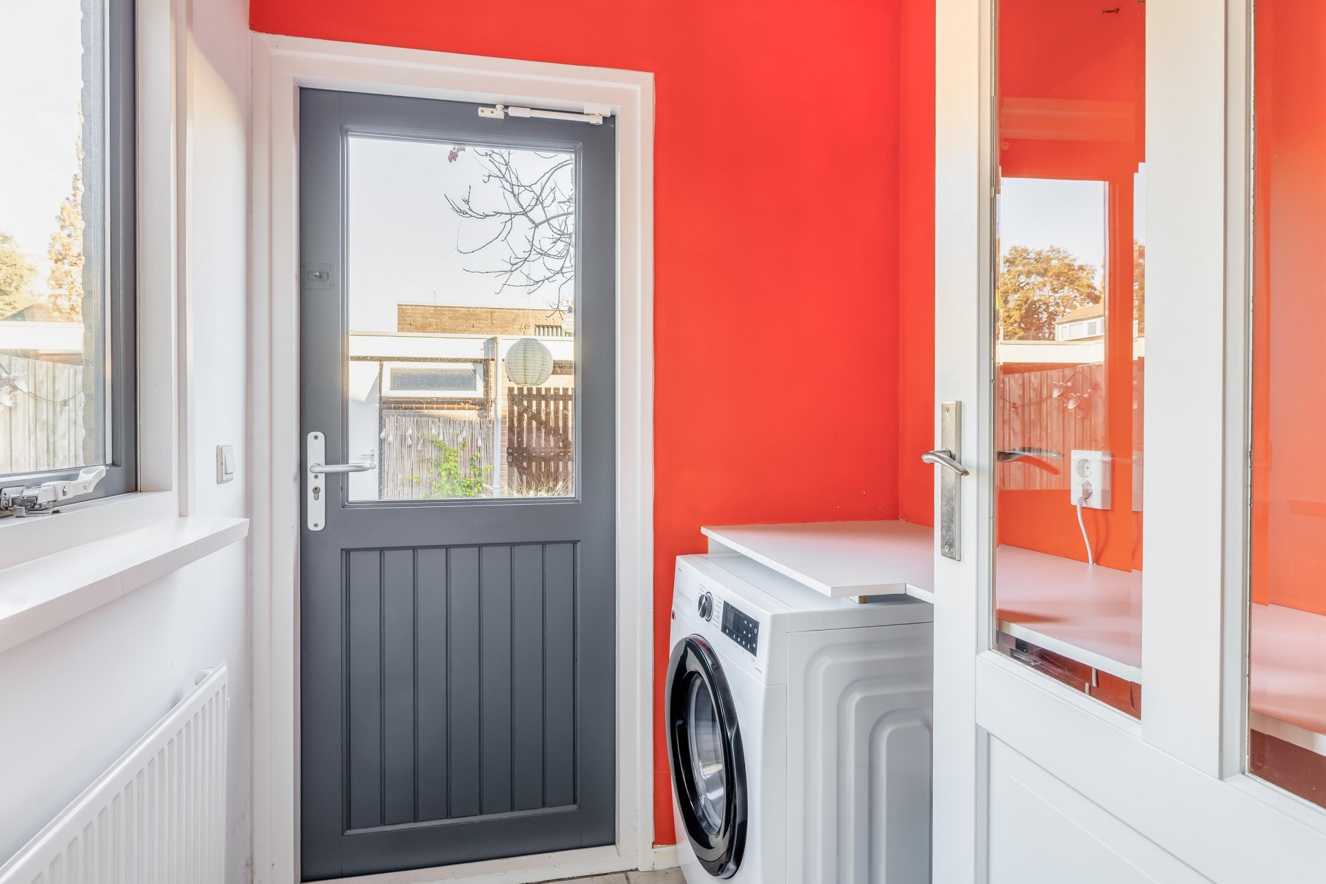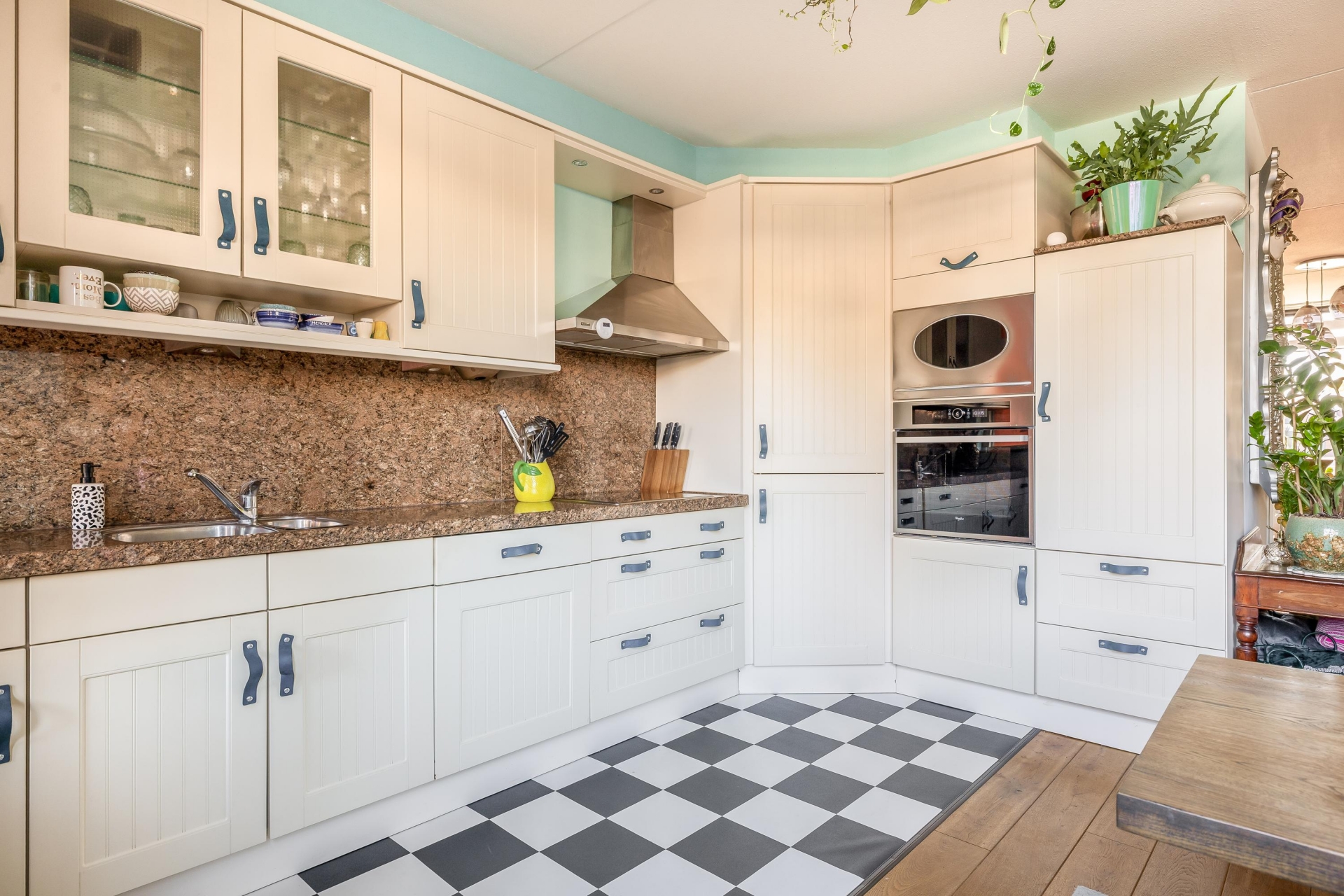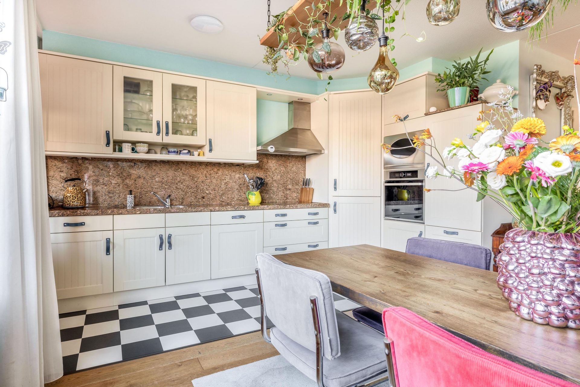 Aan de achterzijde ligt de keuken. Deze is verzorgd en biedt voldoende werk en kastruimte. Aansluitend vind je de bijkeuken, ideaal voor extra opslag en het plaatsen van witgoed. Vanuit hier loop je zo de achtertuin in, wat het contact met buiten prettig maakt.