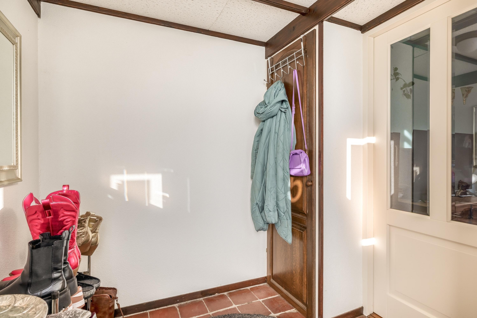 Via de entree kom je binnen in de hal. Vanuit hier stap je de woonkamer in, waarbij er een aparte tussenhal is met de trapopgang naar boven en toegang tot het toilet. Dat zorgt voor een prettige scheiding tussen het woongedeelte en de praktische ruimtes.