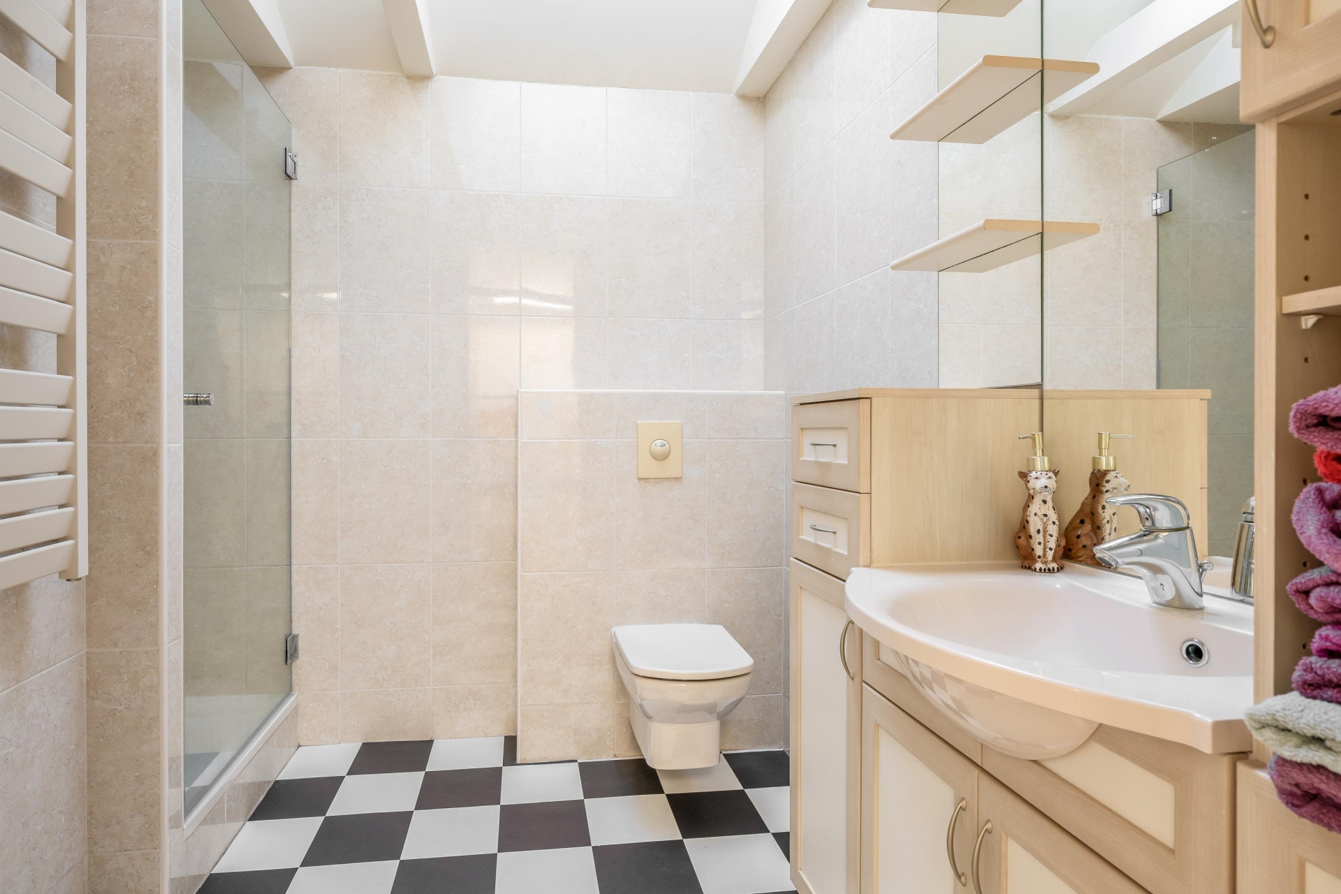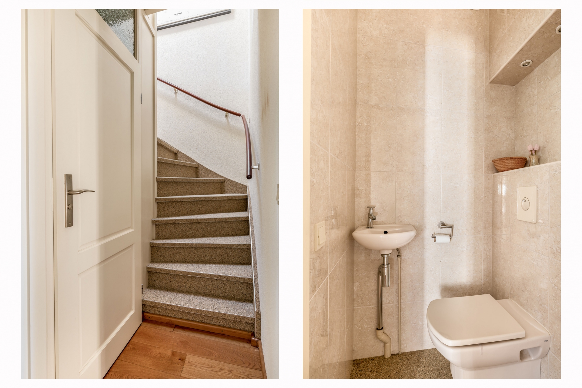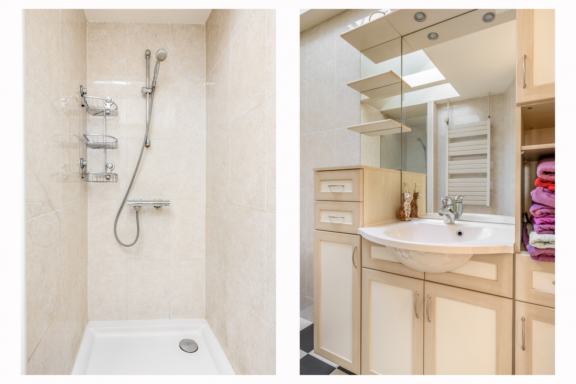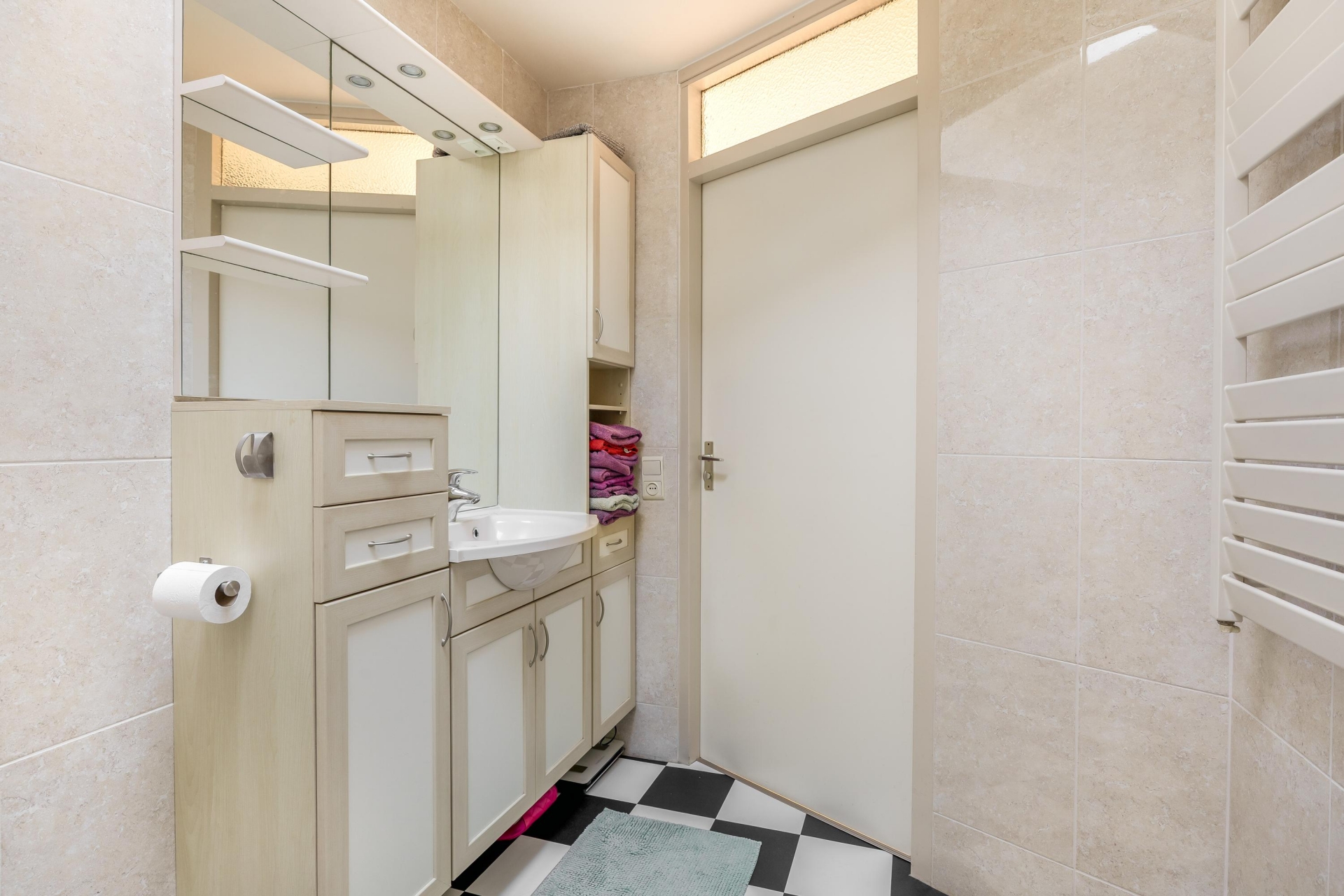 De badkamer ligt centraal op de verdieping en is voorzien van een douche, wastafel en toilet. Alles is logisch ingedeeld en functioneel in gebruik.