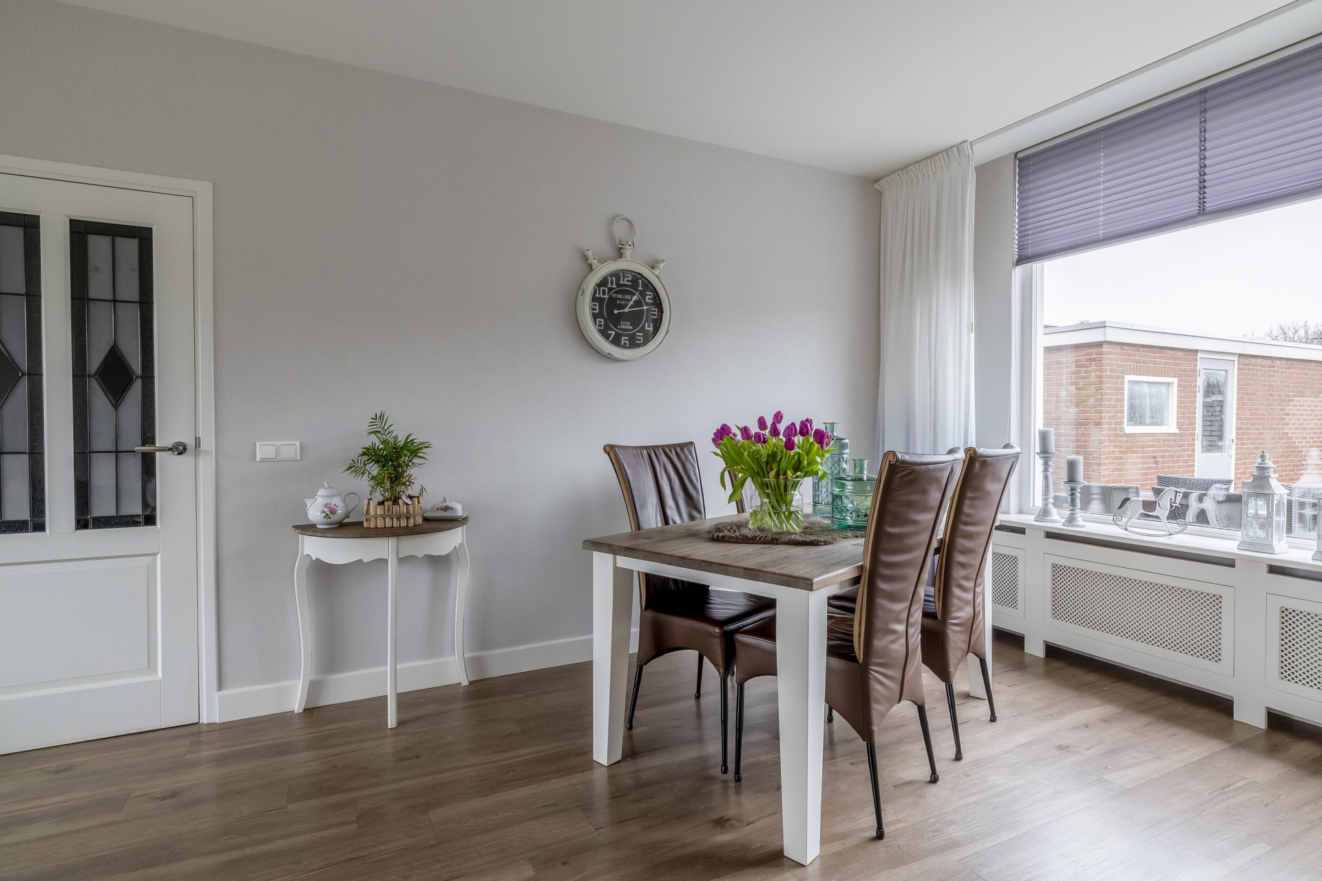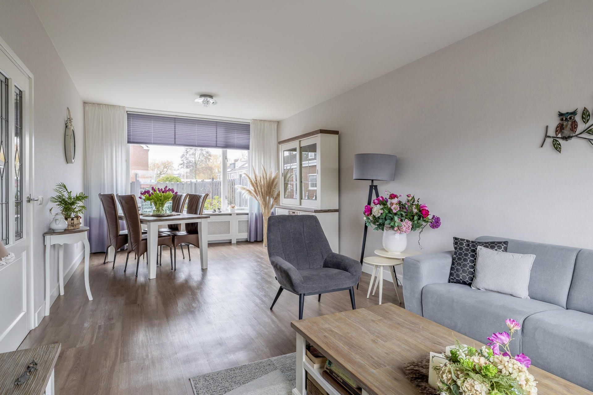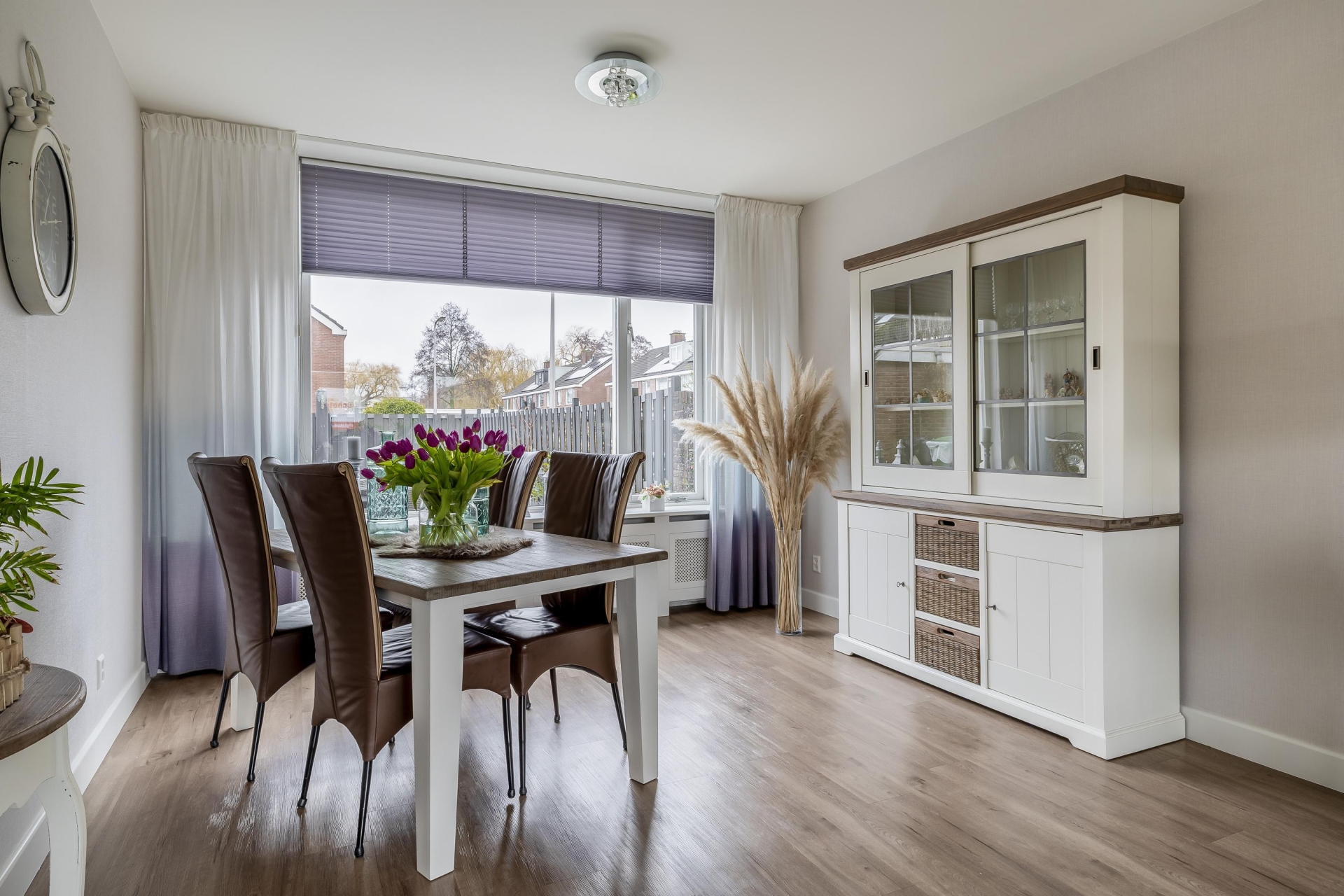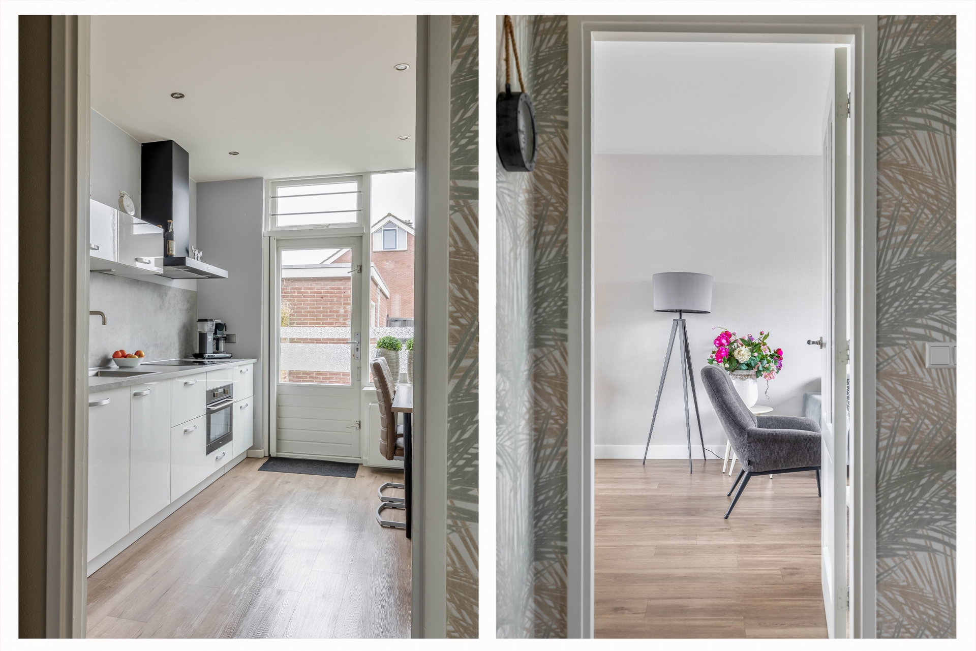 Bij binnenkomst valt direct op hoe licht de woonkamer is. De grote raampartij aan de voorzijde zorgt voor veel daglicht en een vrij zicht de straat in. De ruimte is strak afgewerkt met een moderne PVC vloer, gestuukt plafond en mooie wandafwerking, waardoor je hier met vrijwel iedere interieurstijl uit de voeten kunt. Er is voldoende plek voor een royale zithoek én een aparte eethoek.