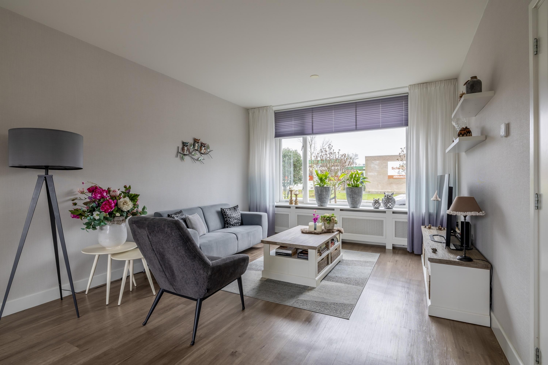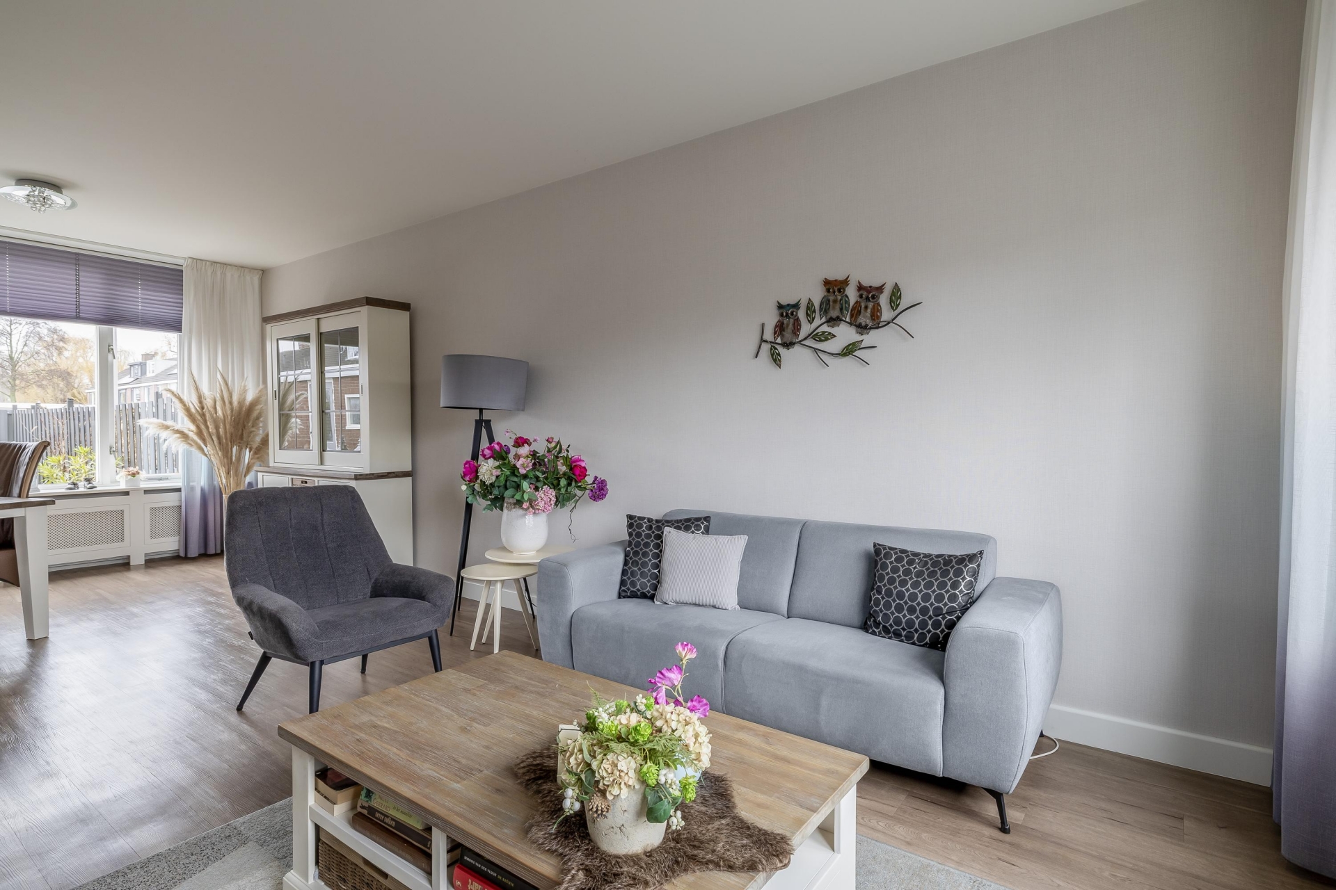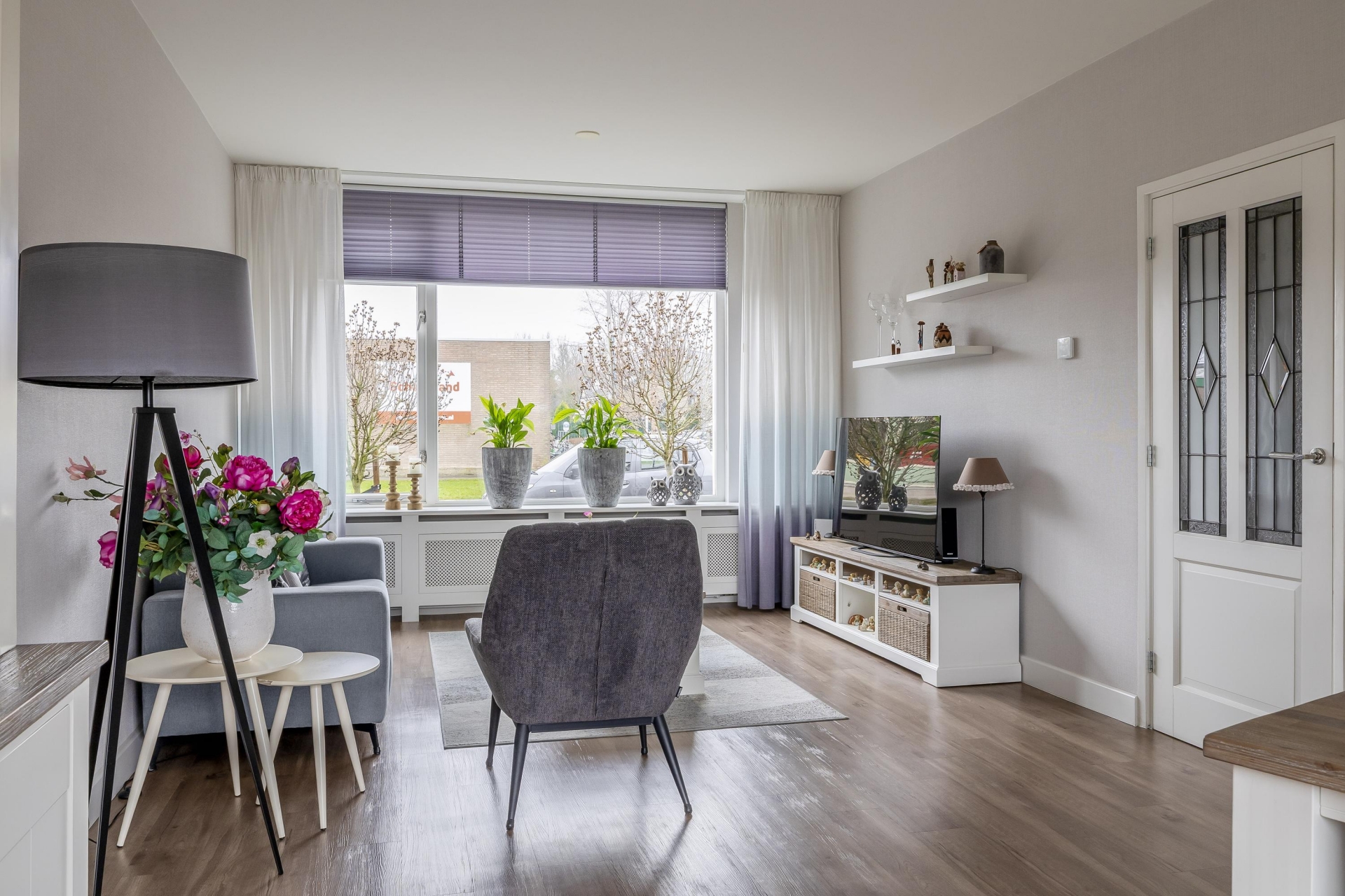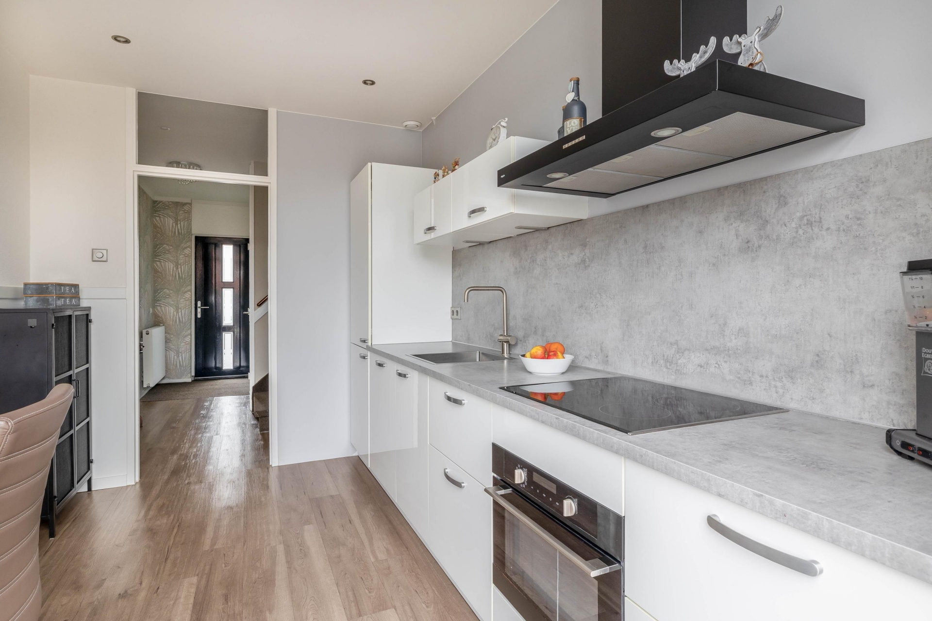 Bij binnenkomst valt direct op hoe licht de woonkamer is. De grote raampartij aan de voorzijde zorgt voor veel daglicht en een vrij zicht de straat in. De ruimte is strak afgewerkt met een moderne PVC vloer, gestuukt plafond en mooie wandafwerking, waardoor je hier met vrijwel iedere interieurstijl uit de voeten kunt. Er is voldoende plek voor een royale zithoek én een aparte eethoek.