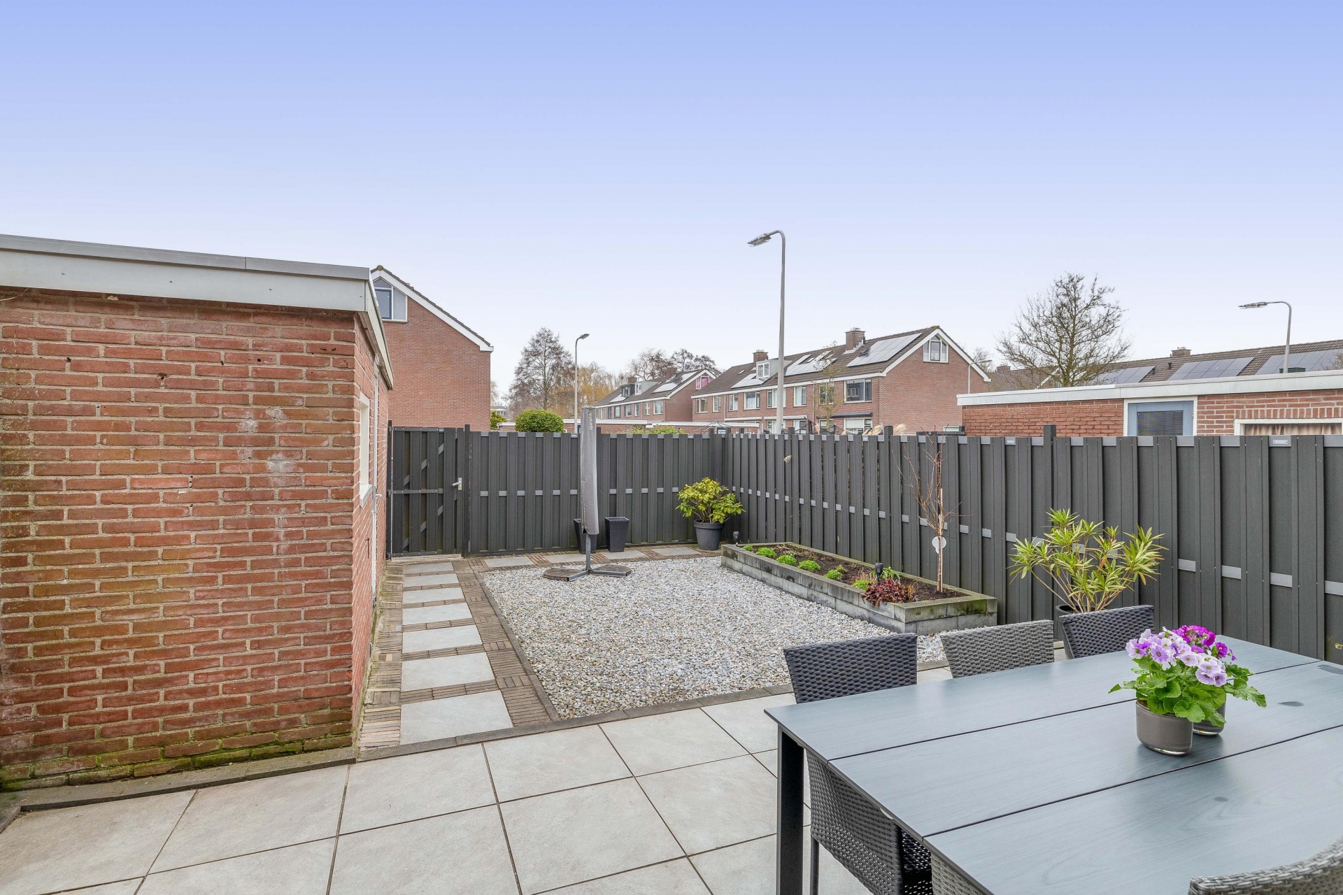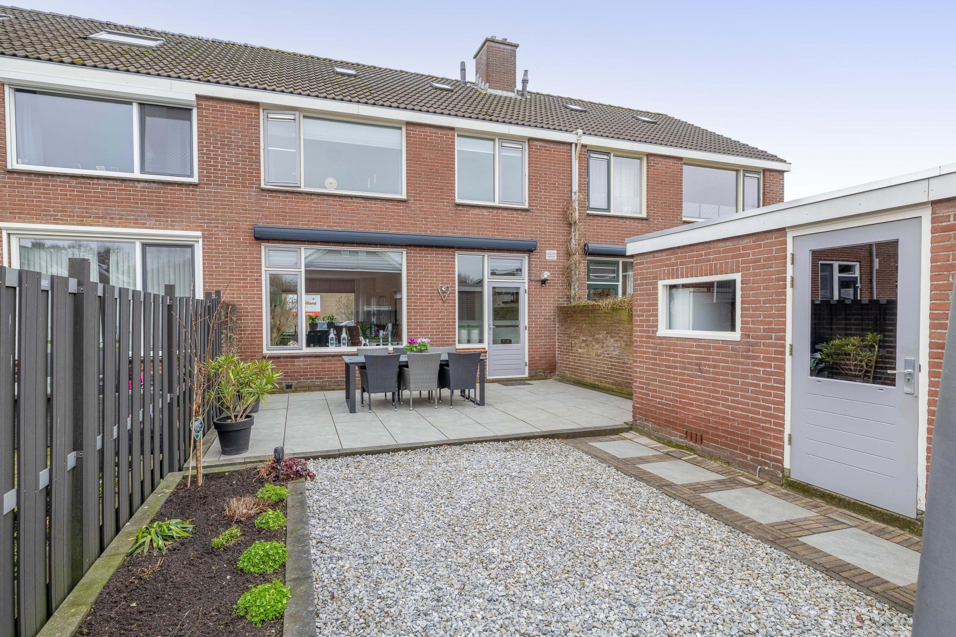 De achtertuin is verzorgd aangelegd met mooie nieuwe schuttingen en ligt op het noordwesten. Dat betekent dat je vanaf de middag tot in de avond van de zon kunt genieten. Er is gekozen voor een combinatie van bestrating en groen, wat zorgt voor een onderhoudsvriendelijk maar toch sfeervol geheel.