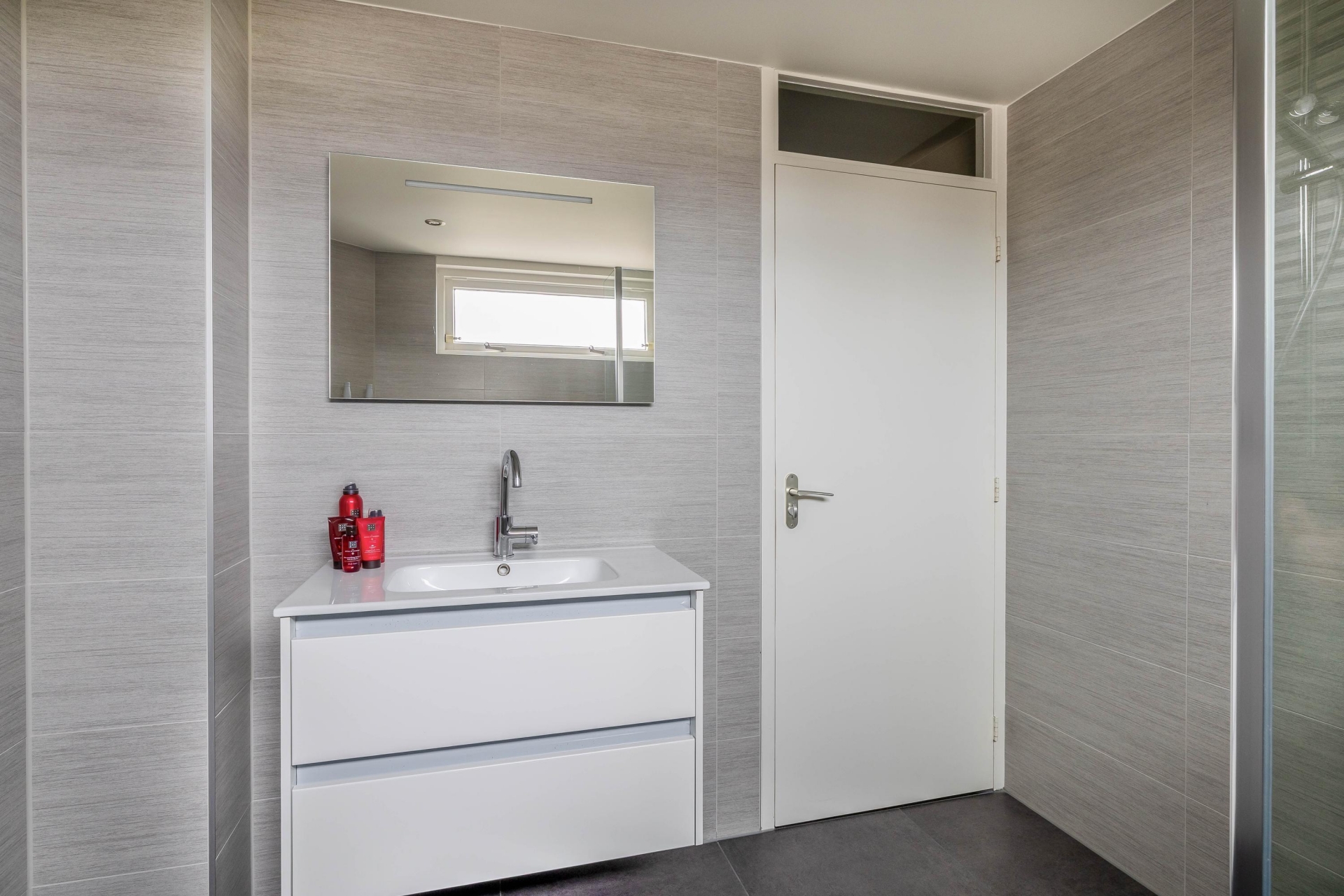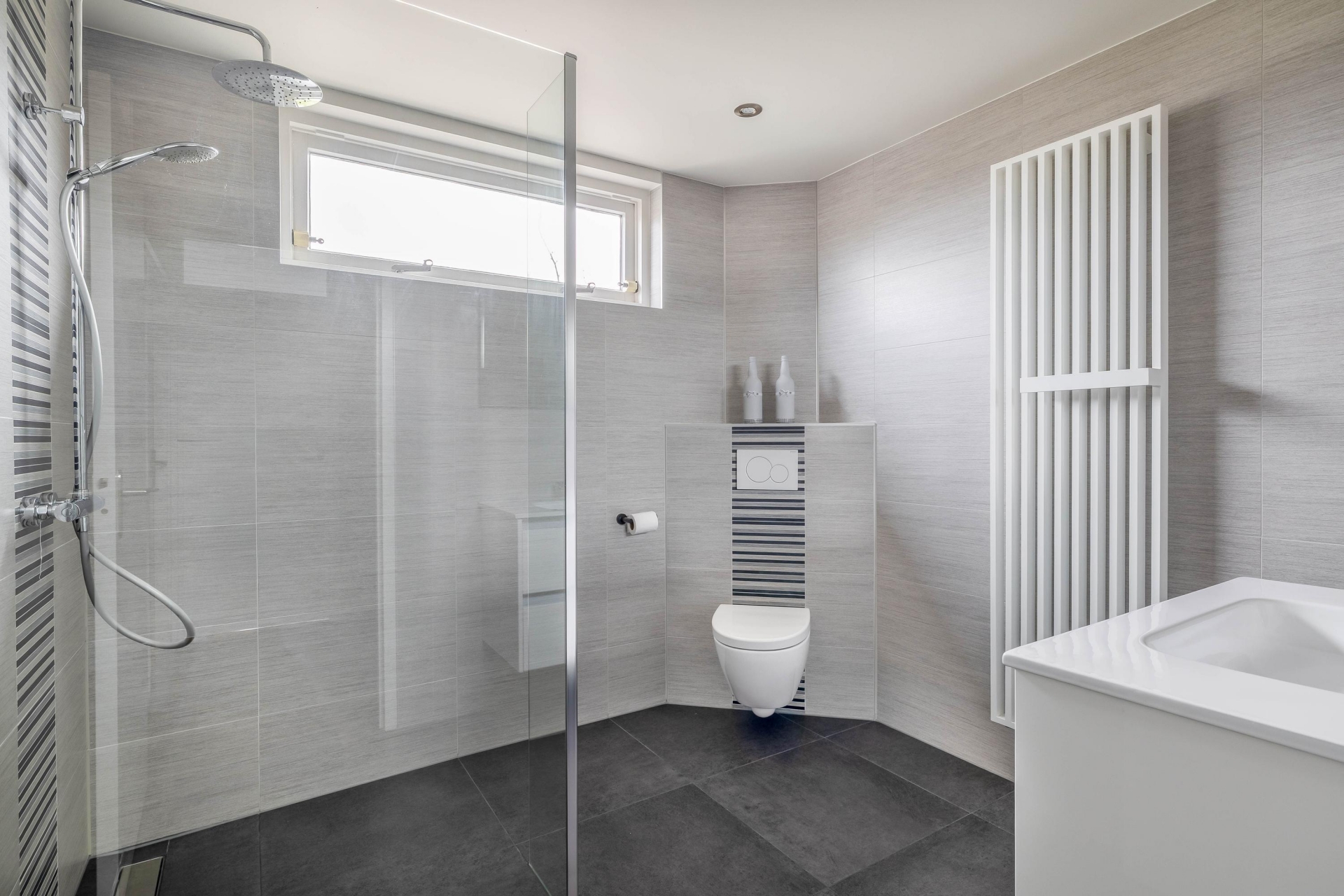 De badkamer is circa zeven jaar oud en modern uitgevoerd. Hier beschik je over een comfortabele douche, wastafelmeubel, tweede toilet en een nette afwerking in neutrale tinten. Alles is functioneel en goed onderhouden.