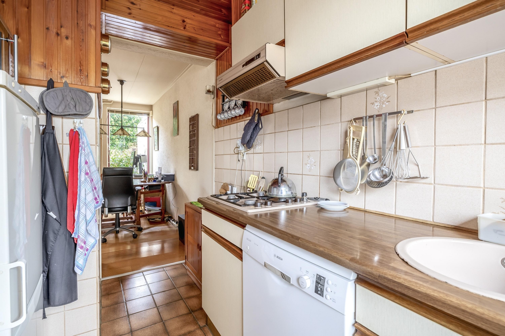 Aan de voorzijde bevindt zich de half open keuken (8m²), met daarin een keukenblok in L-opstelling, voorzien van enige inbouw-/losse keuken apparatuur.