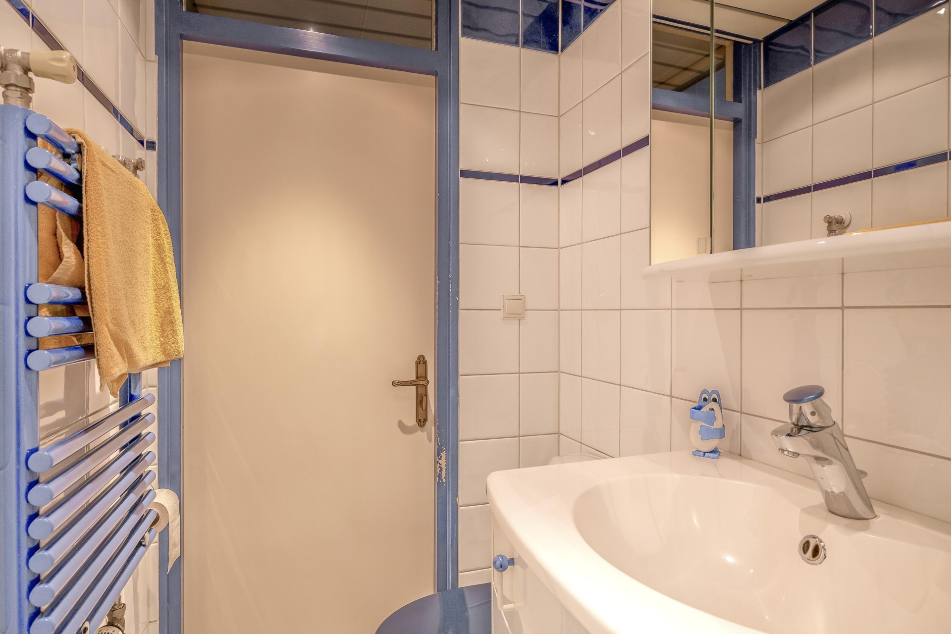 De tussengelegen badkamer (4m²) is geheel betegeld en voorzien van een toilet, wastafelmeubel, inloopdouche en handdoekradiator.