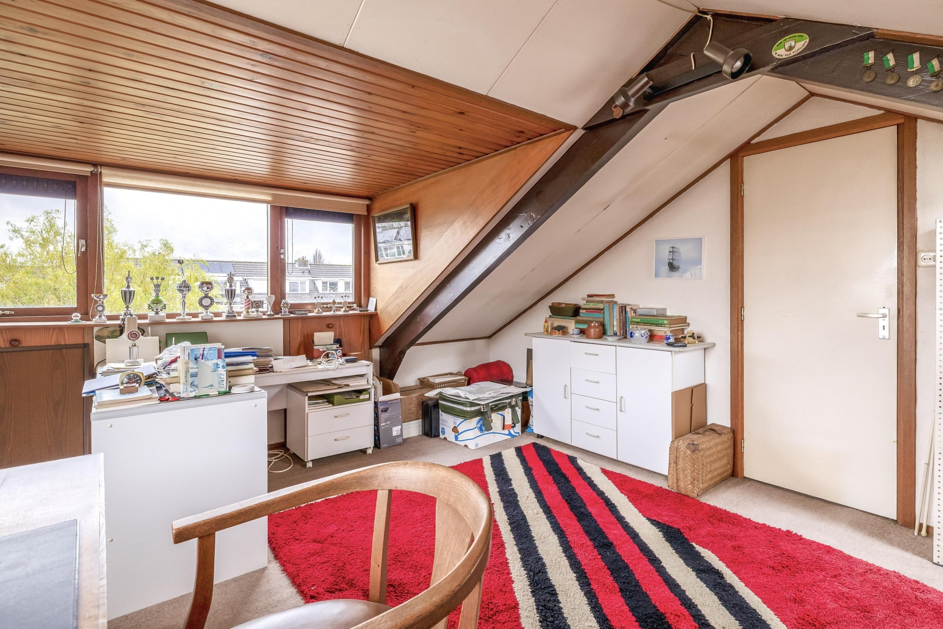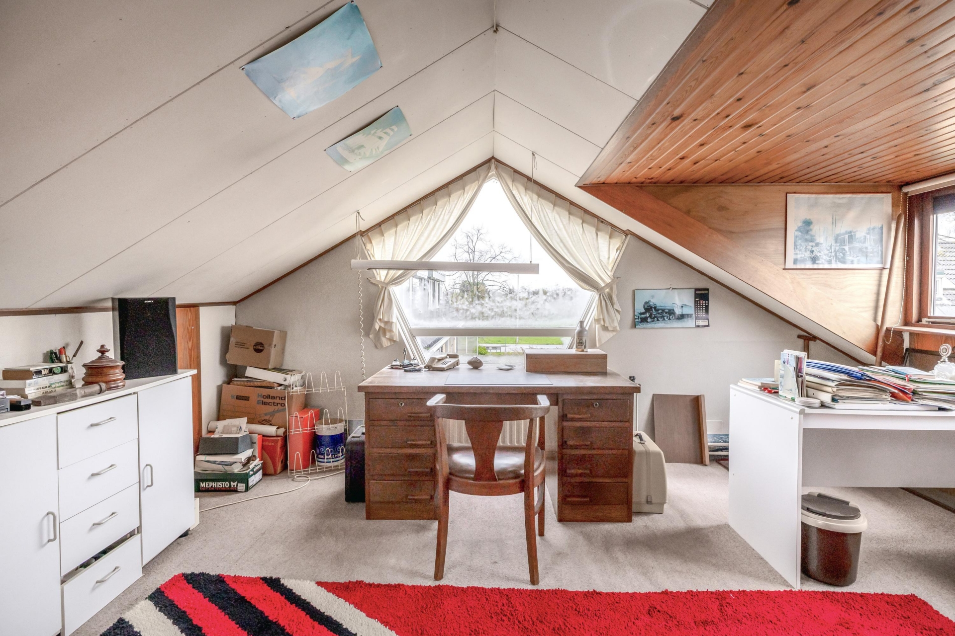 Vanuit deze kamer is aan weerszijde, onder de schuine kap, toegang tot 2 grote bergruimtes achter de knieschoten.