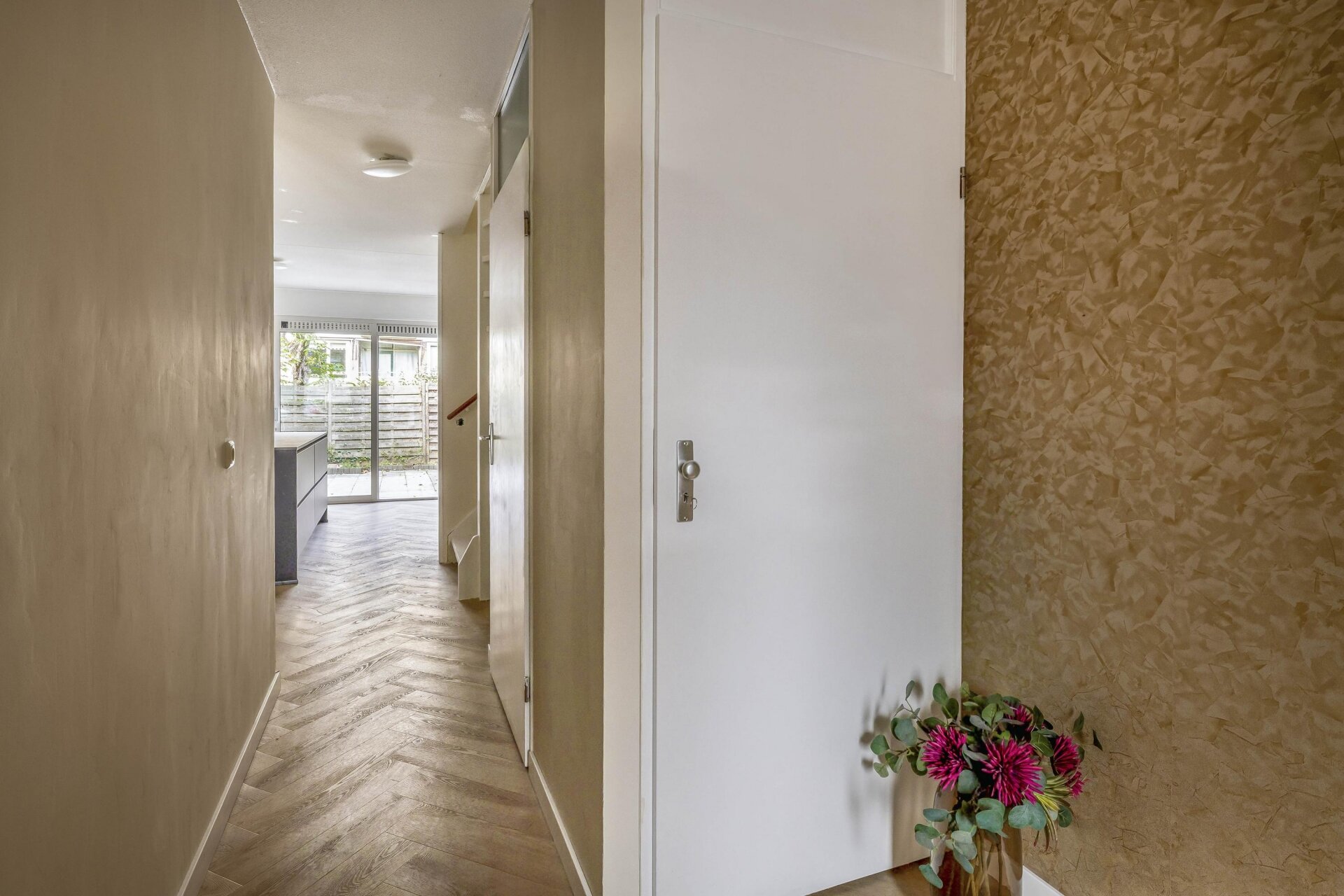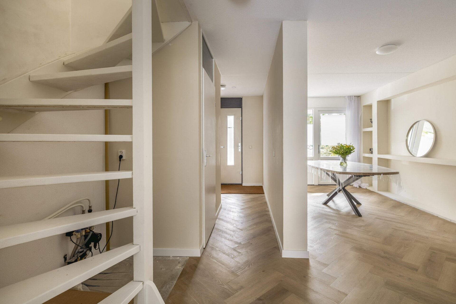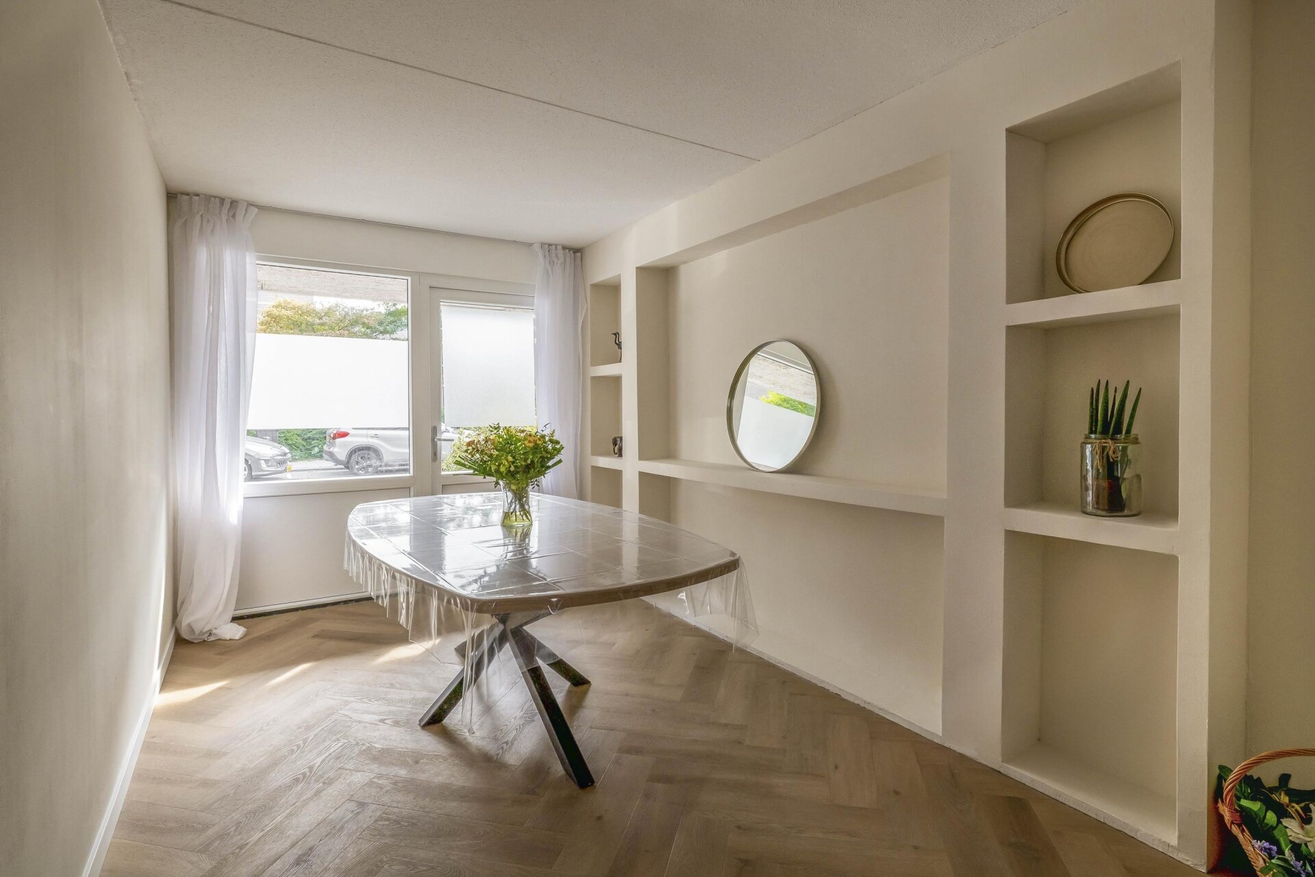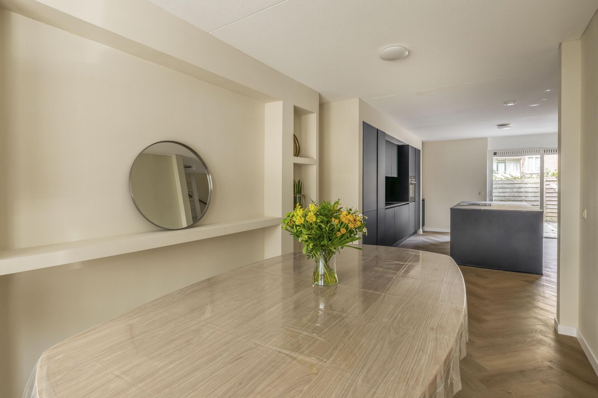 Zodra je binnenkomt, valt de stijlvolle PVC visgraatvloer met vloerverwarming meteen op: strak, sfeervol en onderhoudsvriendelijk. De eetkamer aan de voorzijde heeft grote raampartijen met fijne lichtinval en zicht op het groen van de straat.