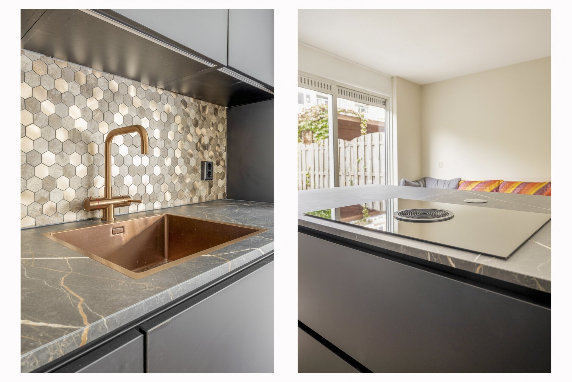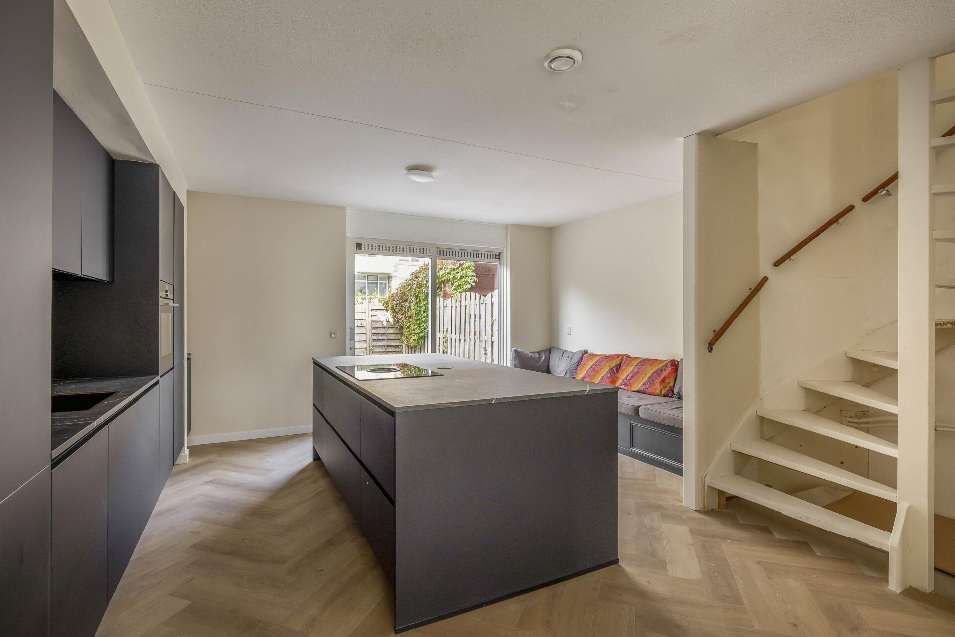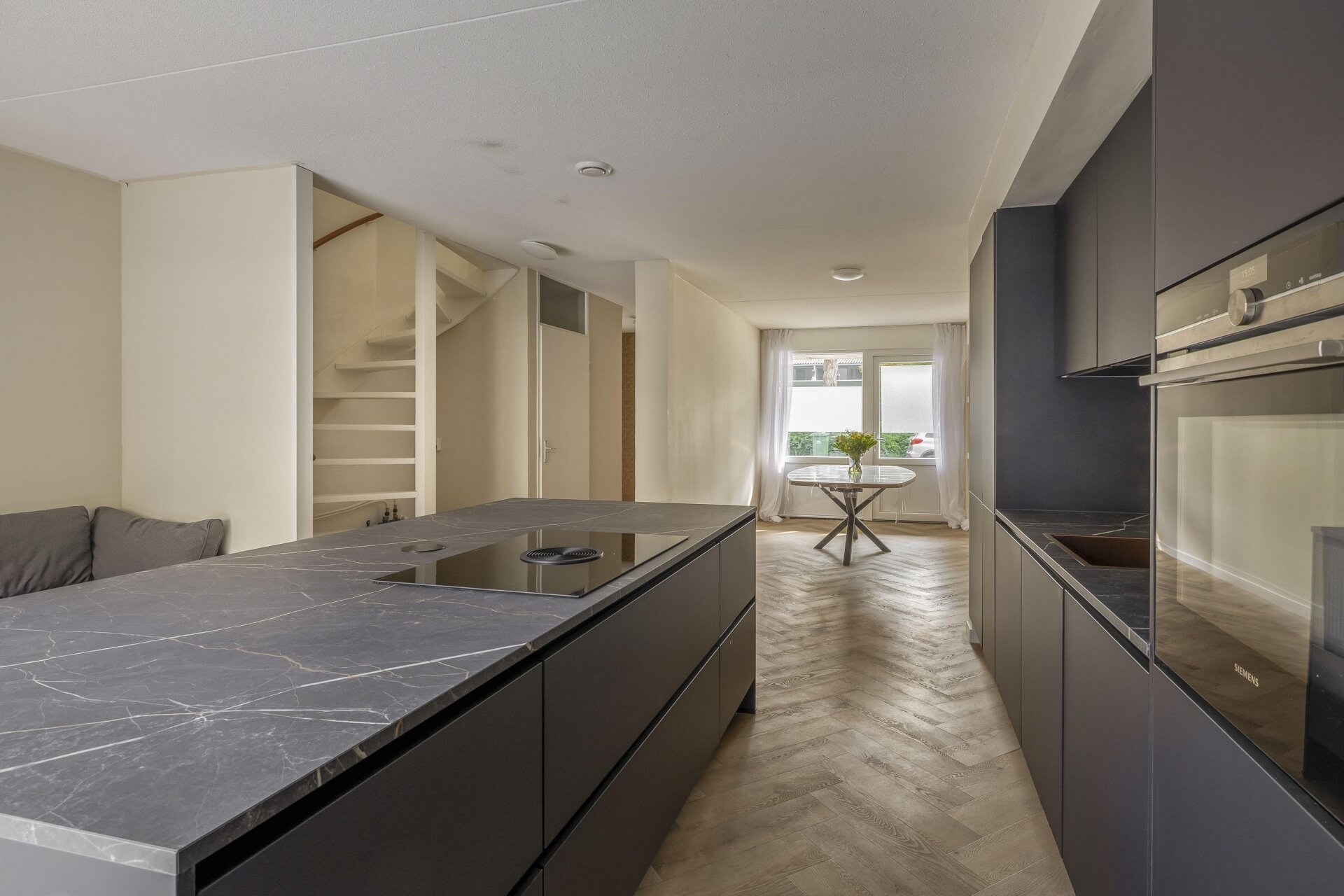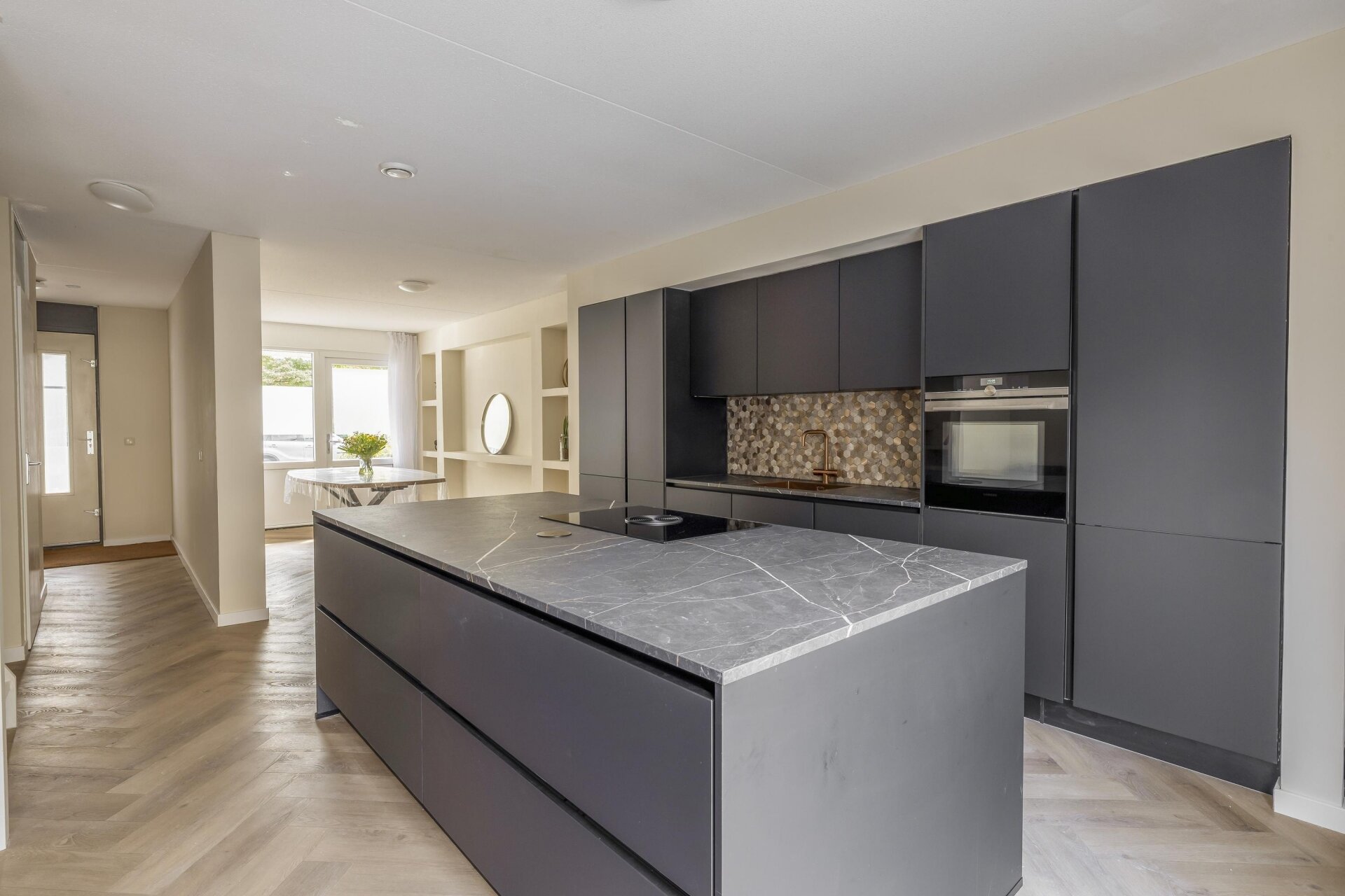 Achterin de woning vind je de echte eyecatcher: een moderne en greeploze keuken met kookeiland, uitgevoerd in een strakke donkergrijze tint met warme accenten. Hier is het heerlijk koken én tafelen, met directe toegang tot de tuin via schuifdeuren. De keuken is met zorg en stijl samengesteld: het kookeiland biedt veel werkruimte en opbergruimte, en is voorzien van alle wenselijke inbouwapparatuur.