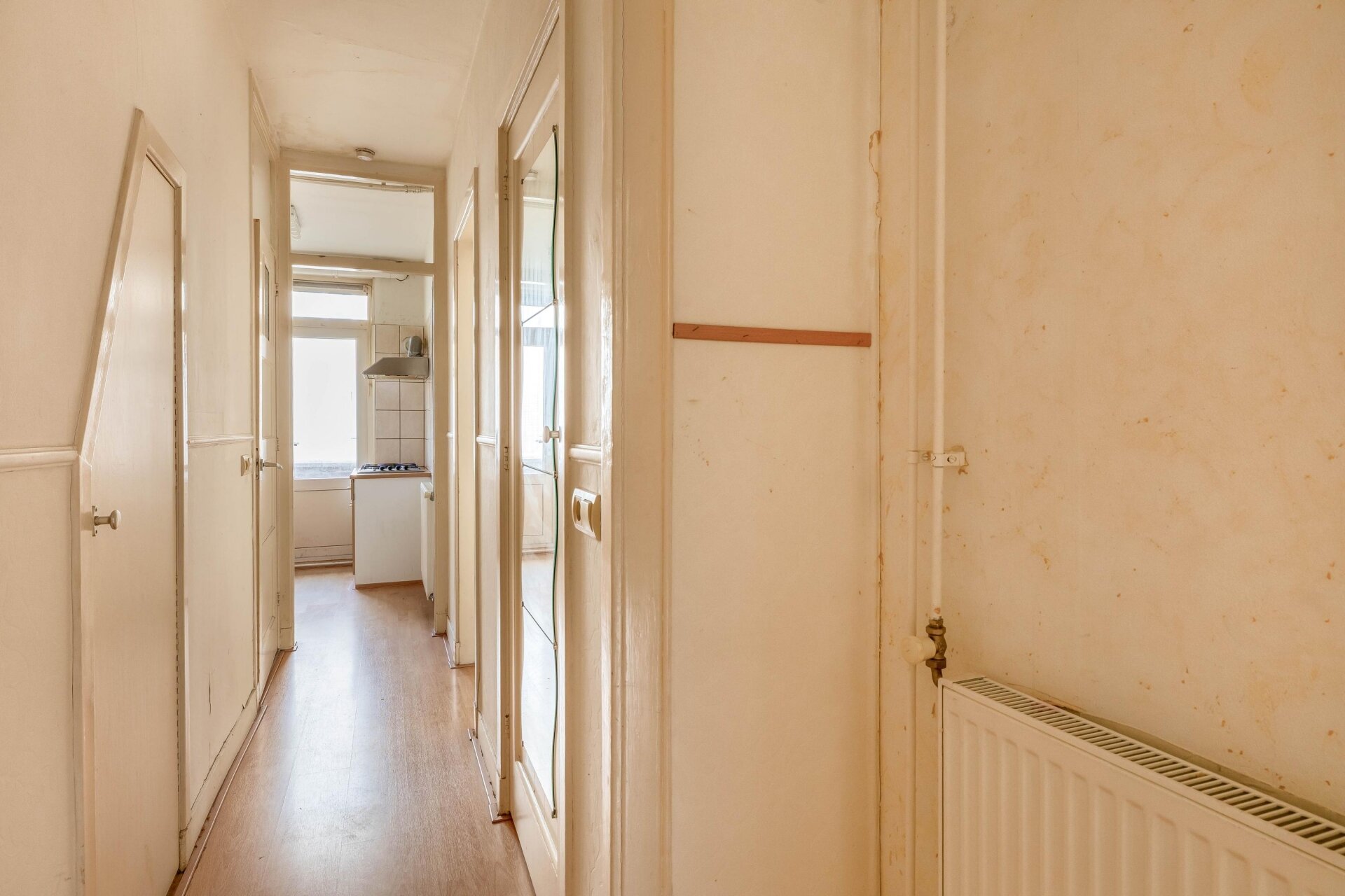Entree van de woning met toegang tot de diverse vertrekken. De woonkamer is gesitueerd aan de straatzijde en voorzien van een laminaatvloer, een schouw en kunststof kozijnen met dubbel glas.