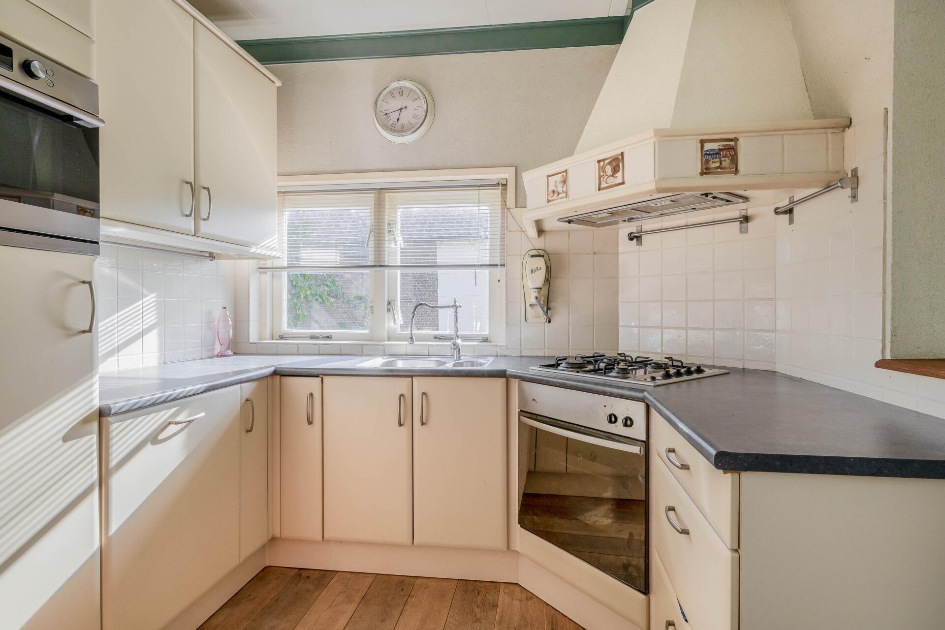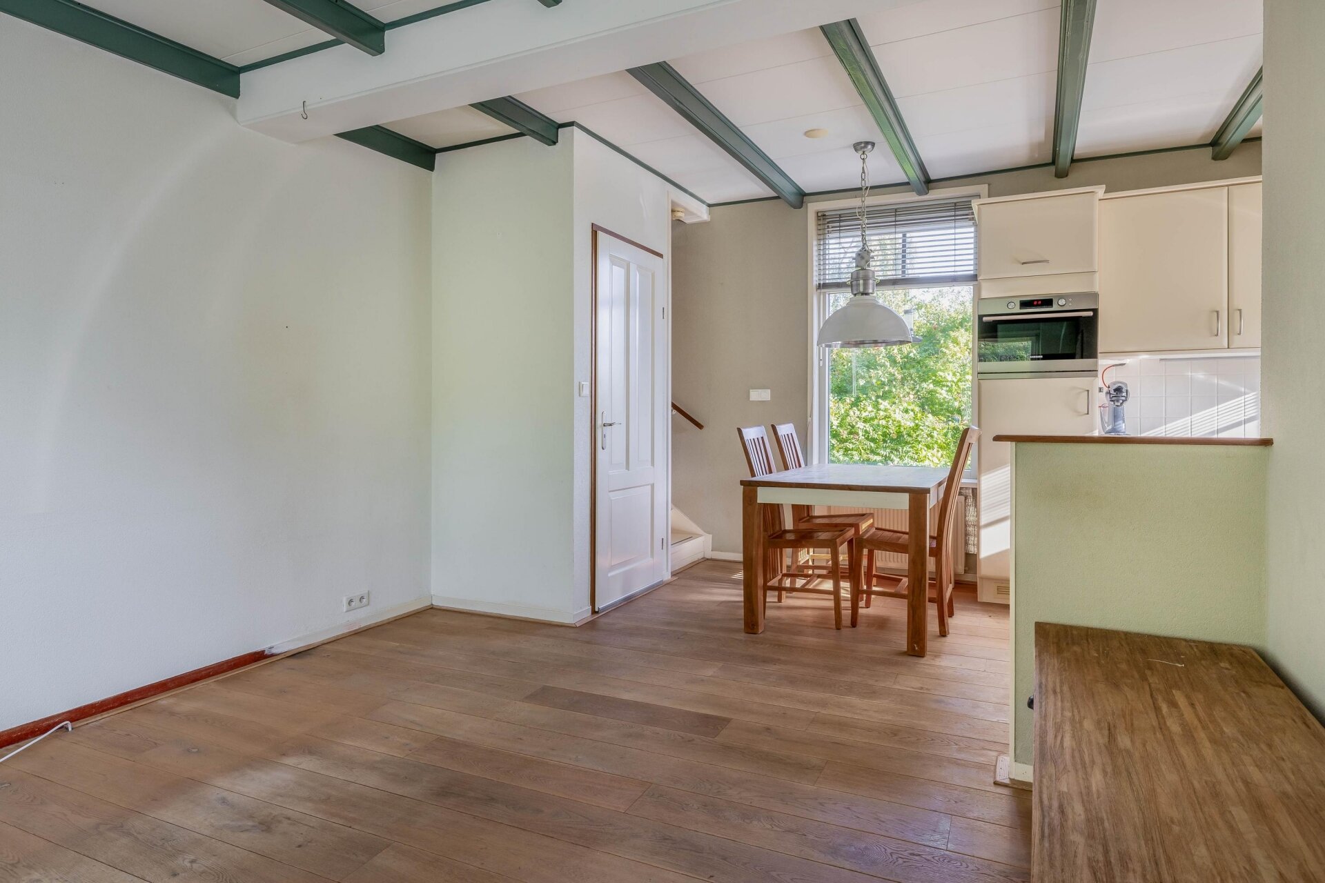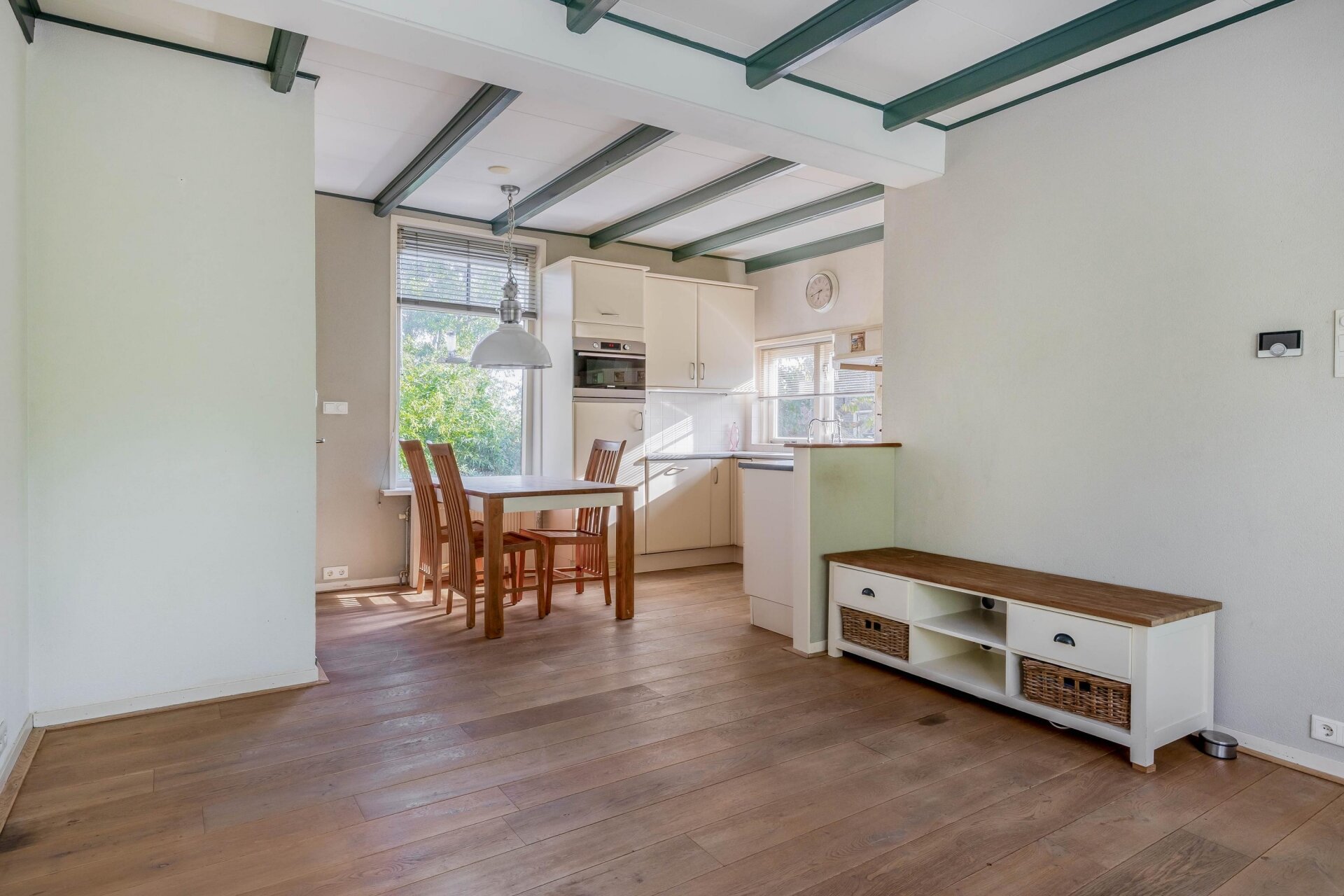 Zodra je binnenkomt, valt het natuurlijke licht op: de woonkamer en eetkeuken hebben grote ramen en een fijne lichtinval. De houten vloer en het balkenplafond geven de ruimte een warme, landelijke sfeer. De open keuken is netjes en voorzien van de nodige inbouwapparatuur.