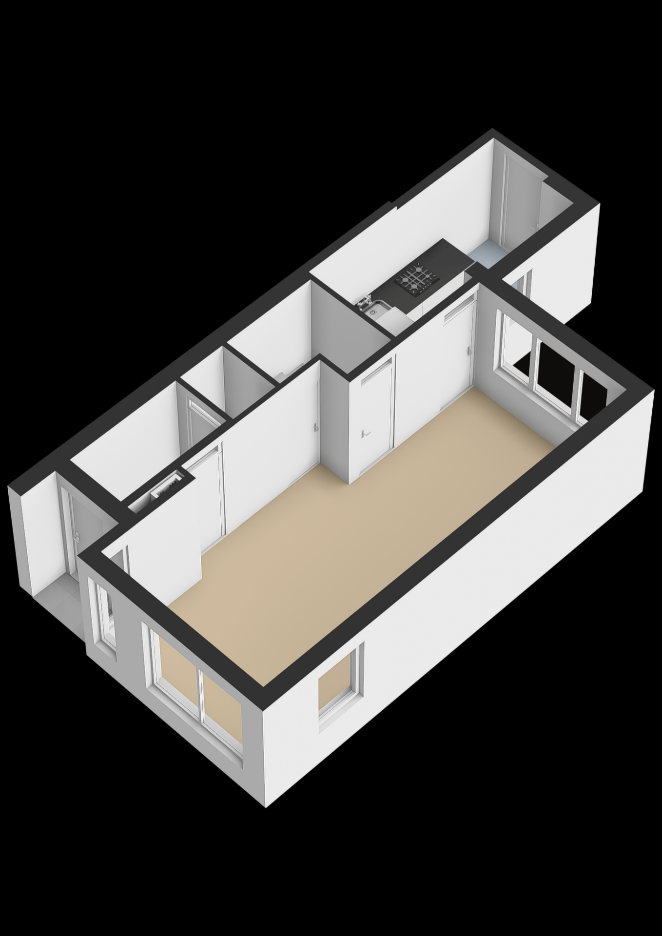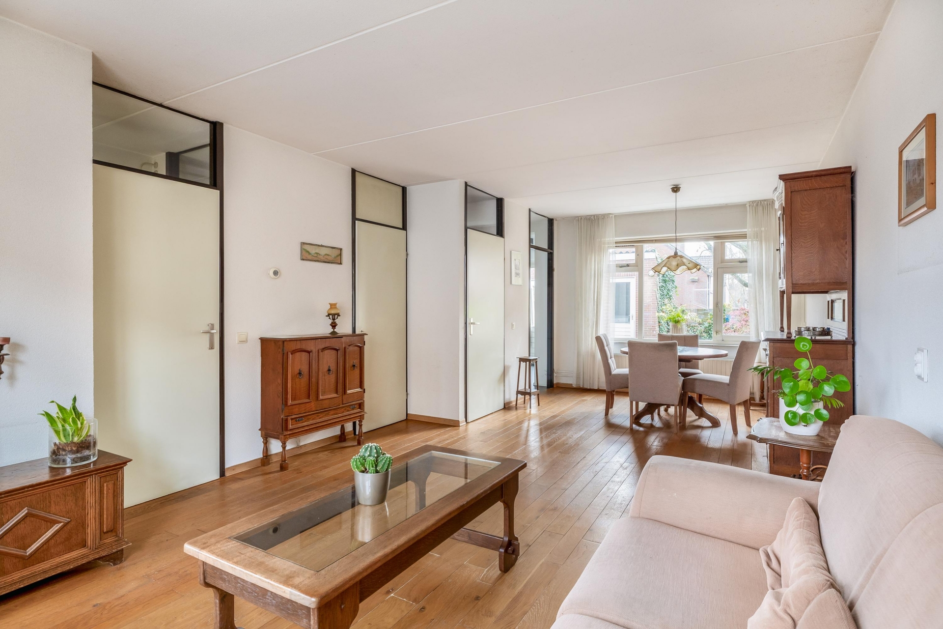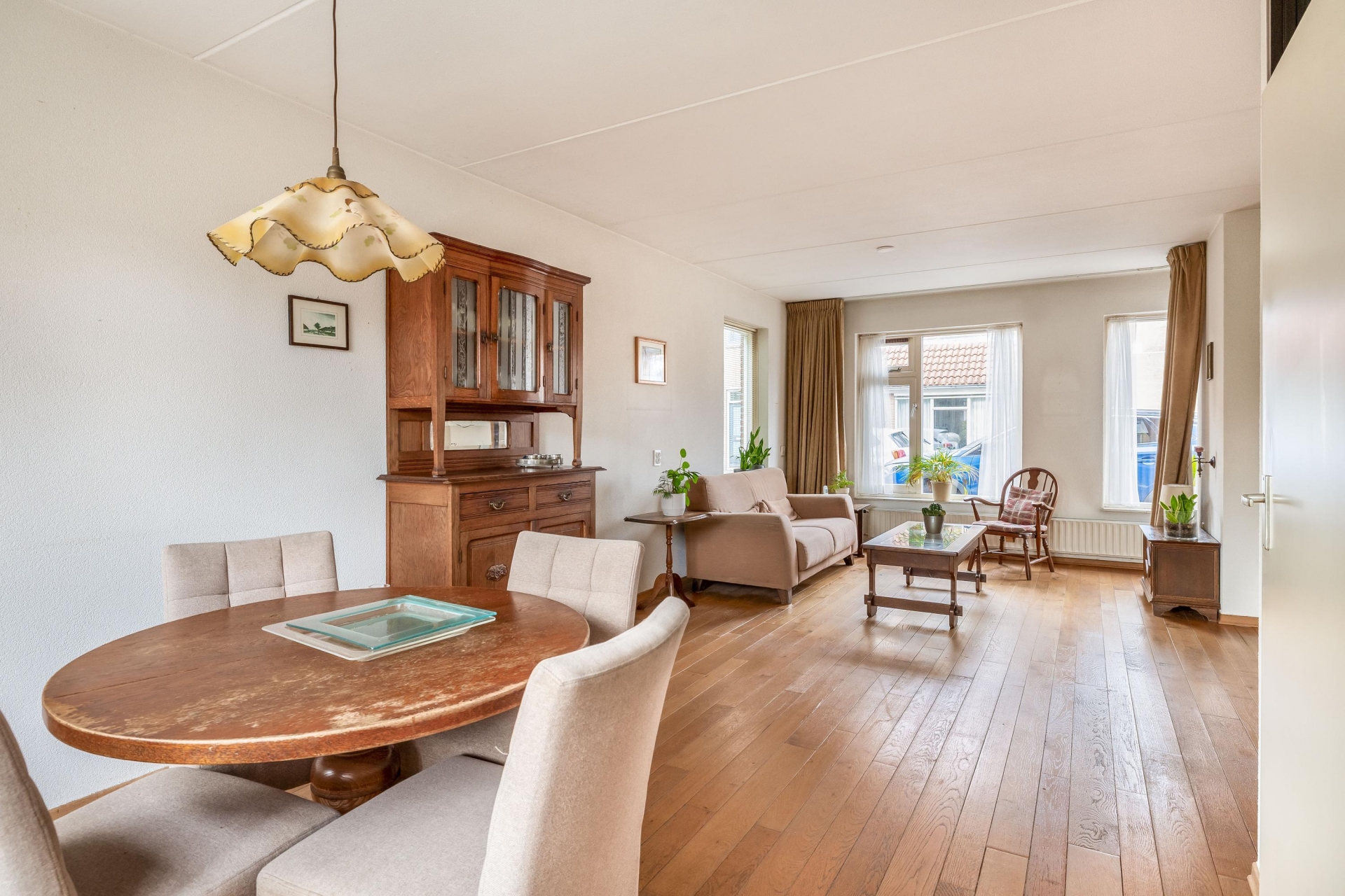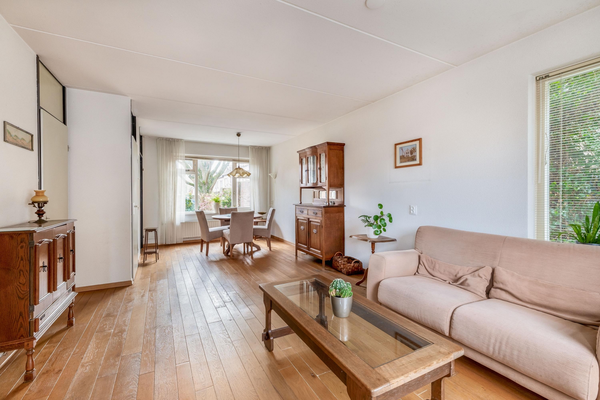 De woonkamer is licht en strak ingedeeld, met grote raampartijen aan de voorzijde en een warme houten vloer die direct sfeer brengt. De zithoek aan de straatzijde is ruim opgezet en biedt volop mogelijkheden om jouw eigen stijl neer te zetten. Richting de tuin vind je de eethoek, met directe verbinding naar de keuken.