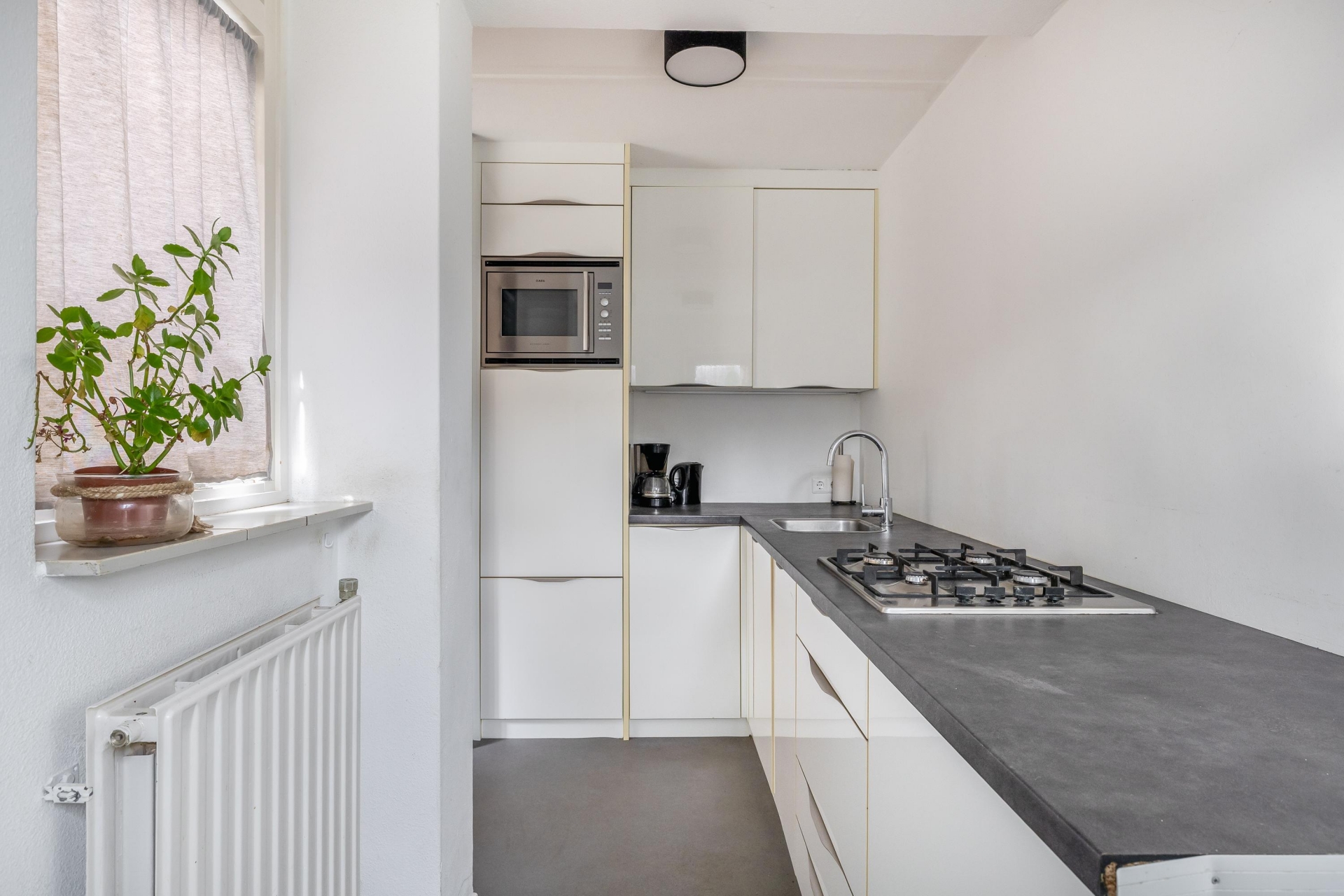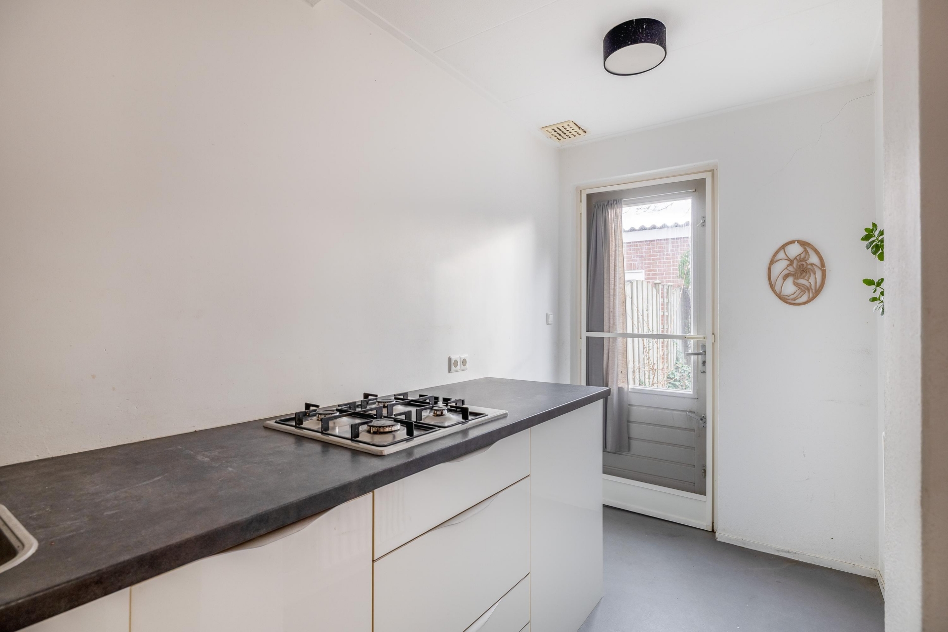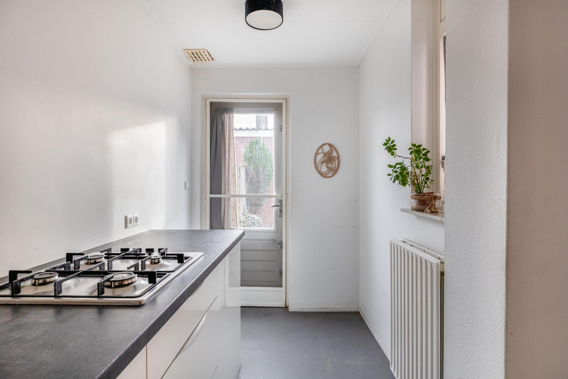 De keuken is compact maar functioneel ingedeeld en beschikt over een gaskookplaat, combimagnetron en veel bergruimte. Alles wat je nodig hebt om dagelijks comfortabel te koken, staat hier klaar. Vanuit de keuken heb je direct toegang tot de tuin – ideaal als je ’s zomers buiten wilt eten of even snel de barbecue aansteekt.