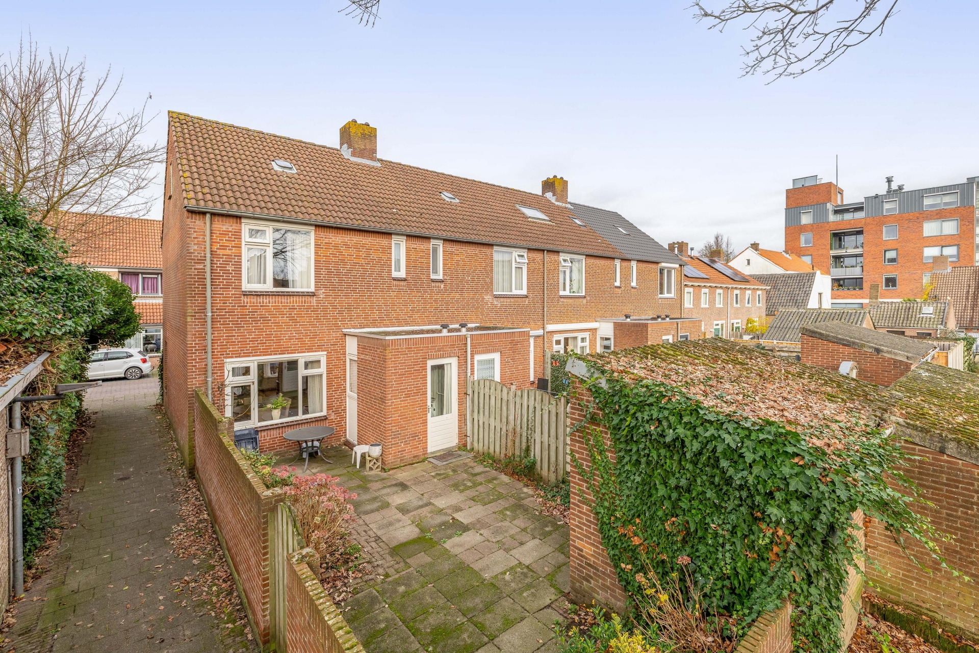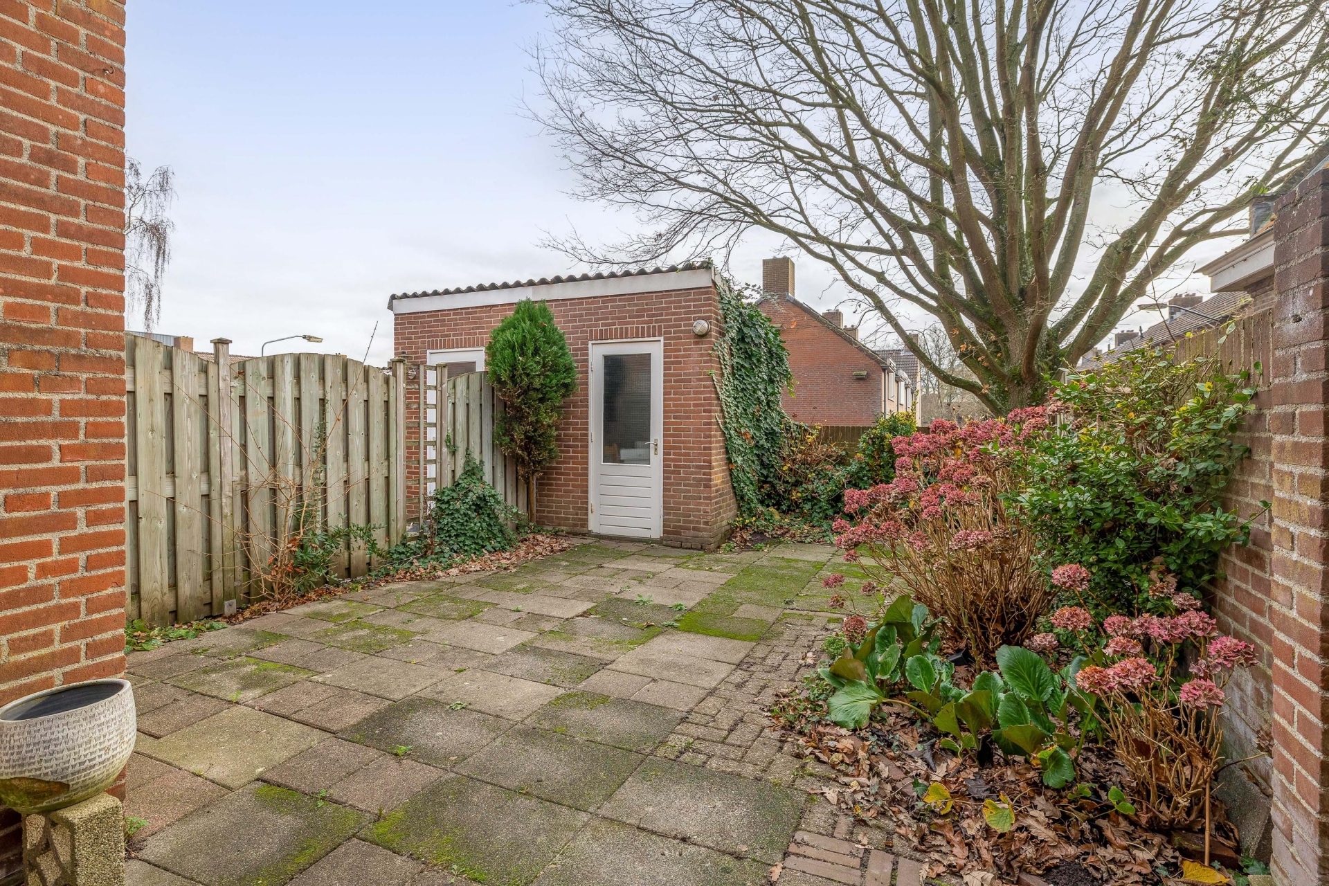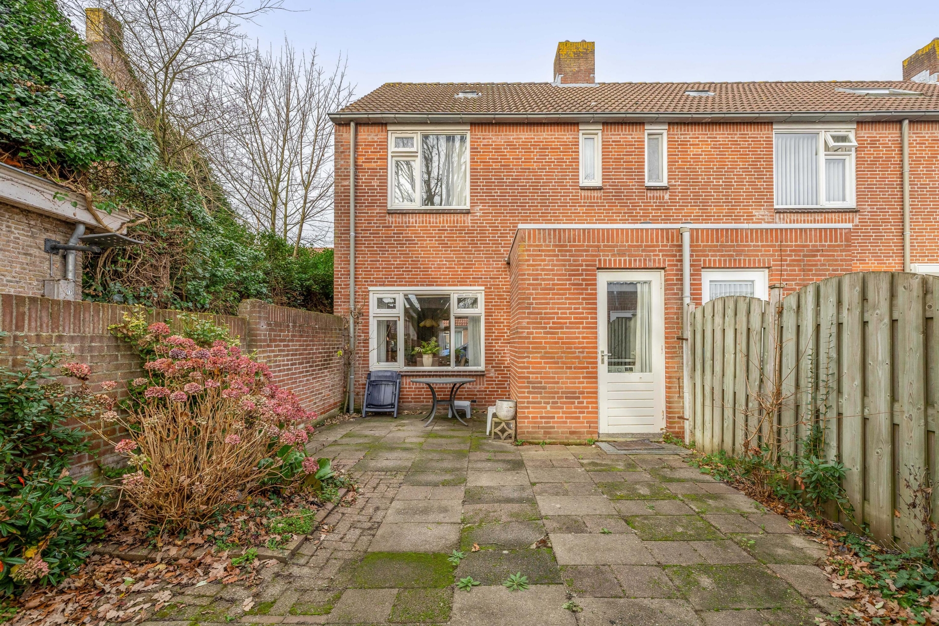 Aan de achterzijde ligt een besloten tuin op het zuidoosten. Hier geniet je ’s ochtends en begin van de middag van de zon. De tuin is grotendeels betegeld en daardoor onderhoudsarm – dus lekker praktisch. Vanuit de tuin heb je toegang tot het achterpad dat leidt naar de bij te kopen garagebox (€ 35.000 k.k.). De garage van 17 m² is bereikbaar via een doodlopende achterstraat en biedt voldoende ruimte voor een auto of een grote hoeveelheid opslag. Denk aan fietsen, gereedschap, tuinmeubels of zelfs een motor – allemaal veilig en uit het zicht.