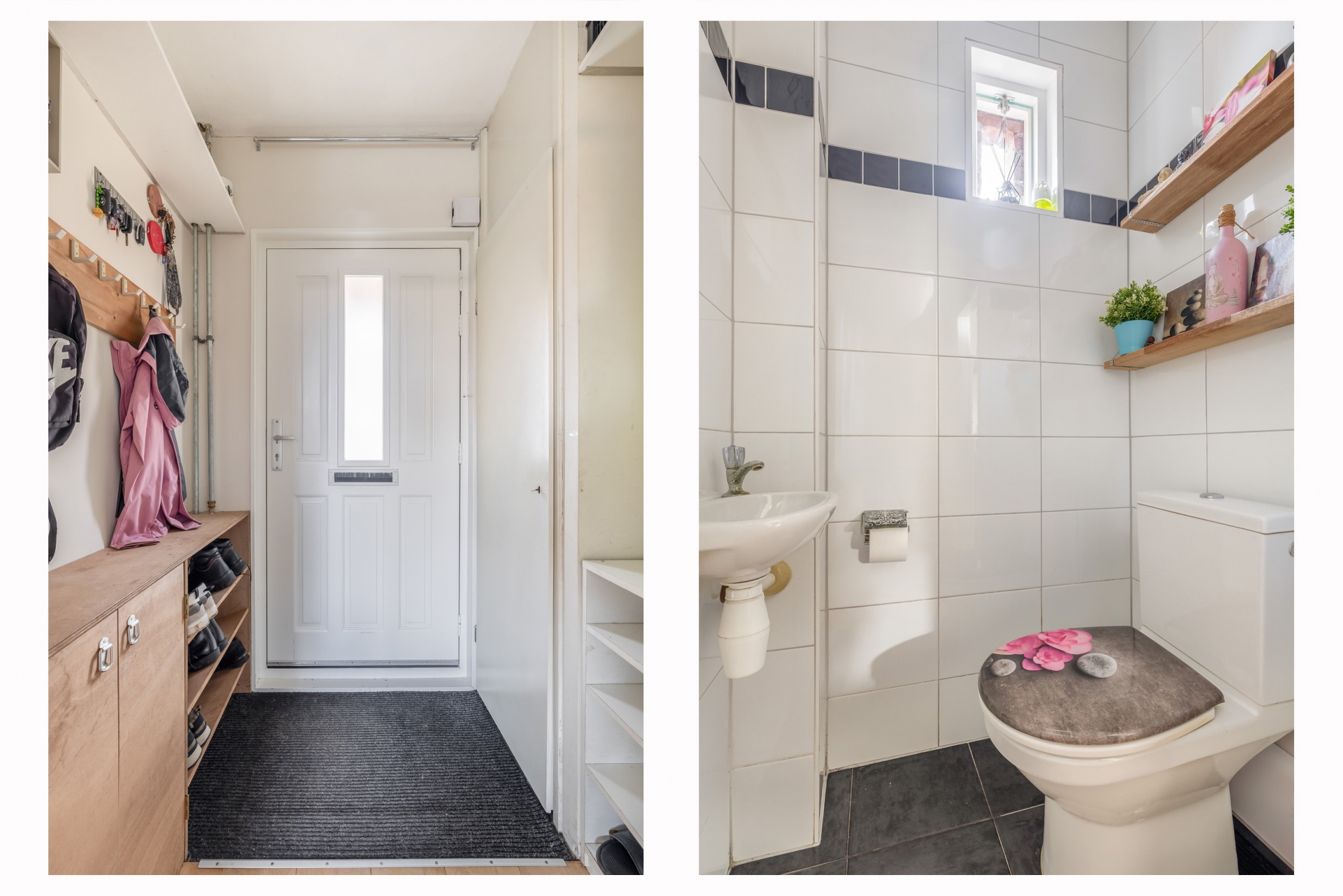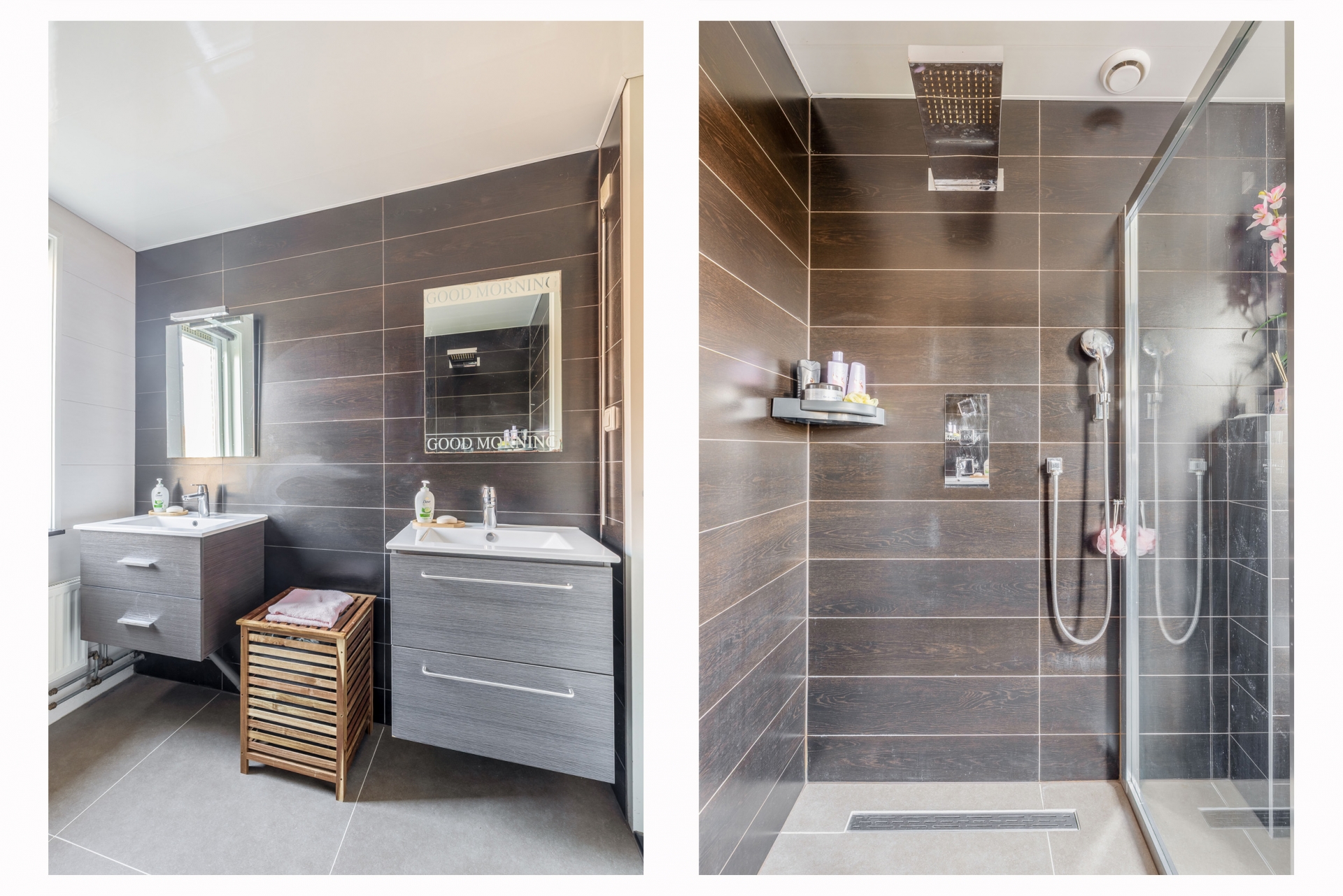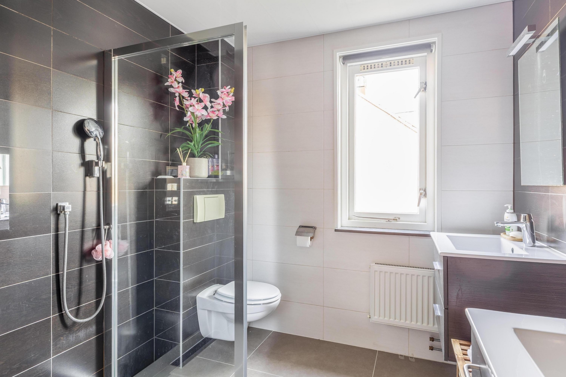 De badkamer is modern uitgevoerd en voorzien van een ruime inloopdouche, toilet en een dubbel wastafelmeubel. Dankzij het raam komt er prettig daglicht binnen en is natuurlijke ventilatie mogelijk.