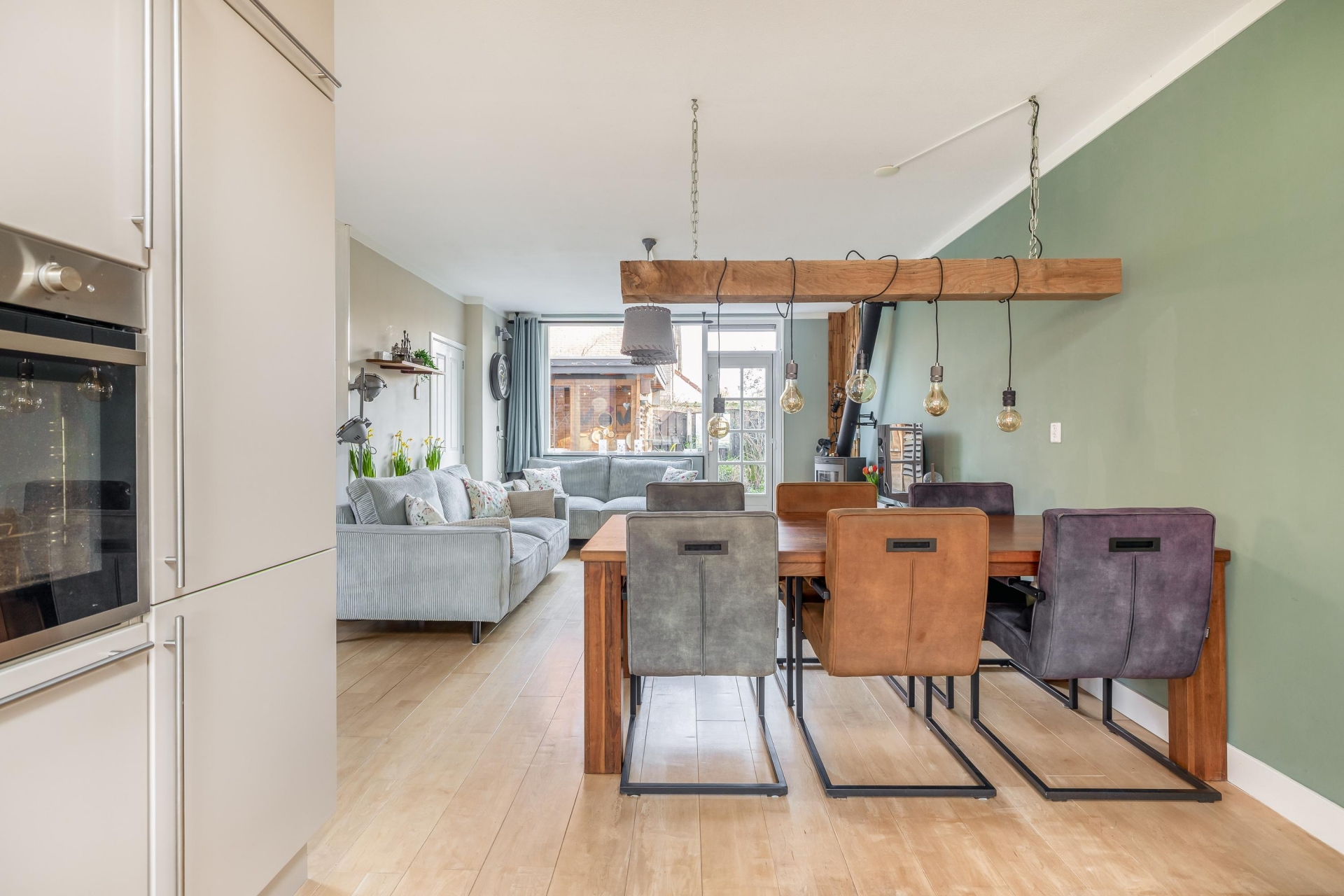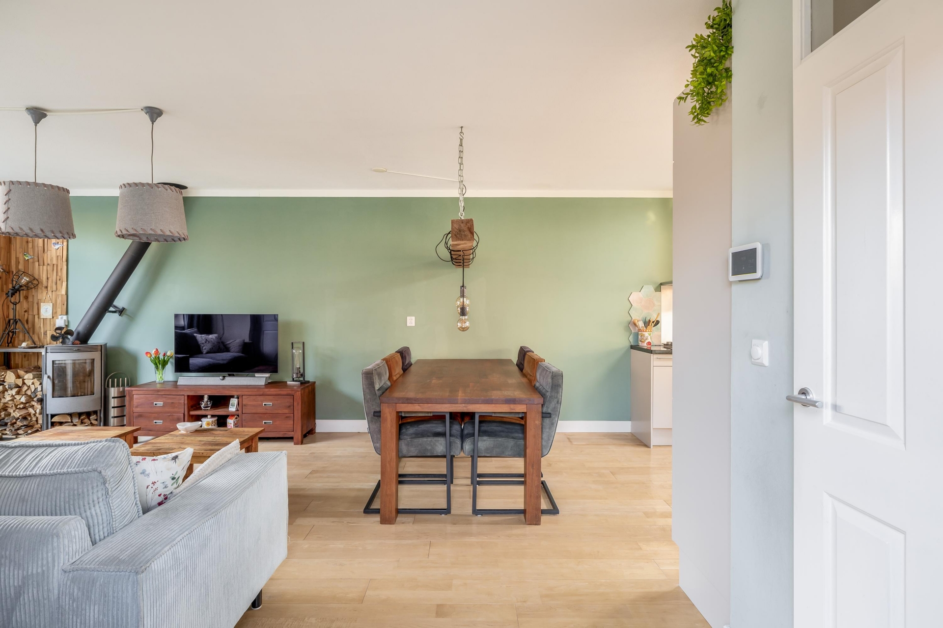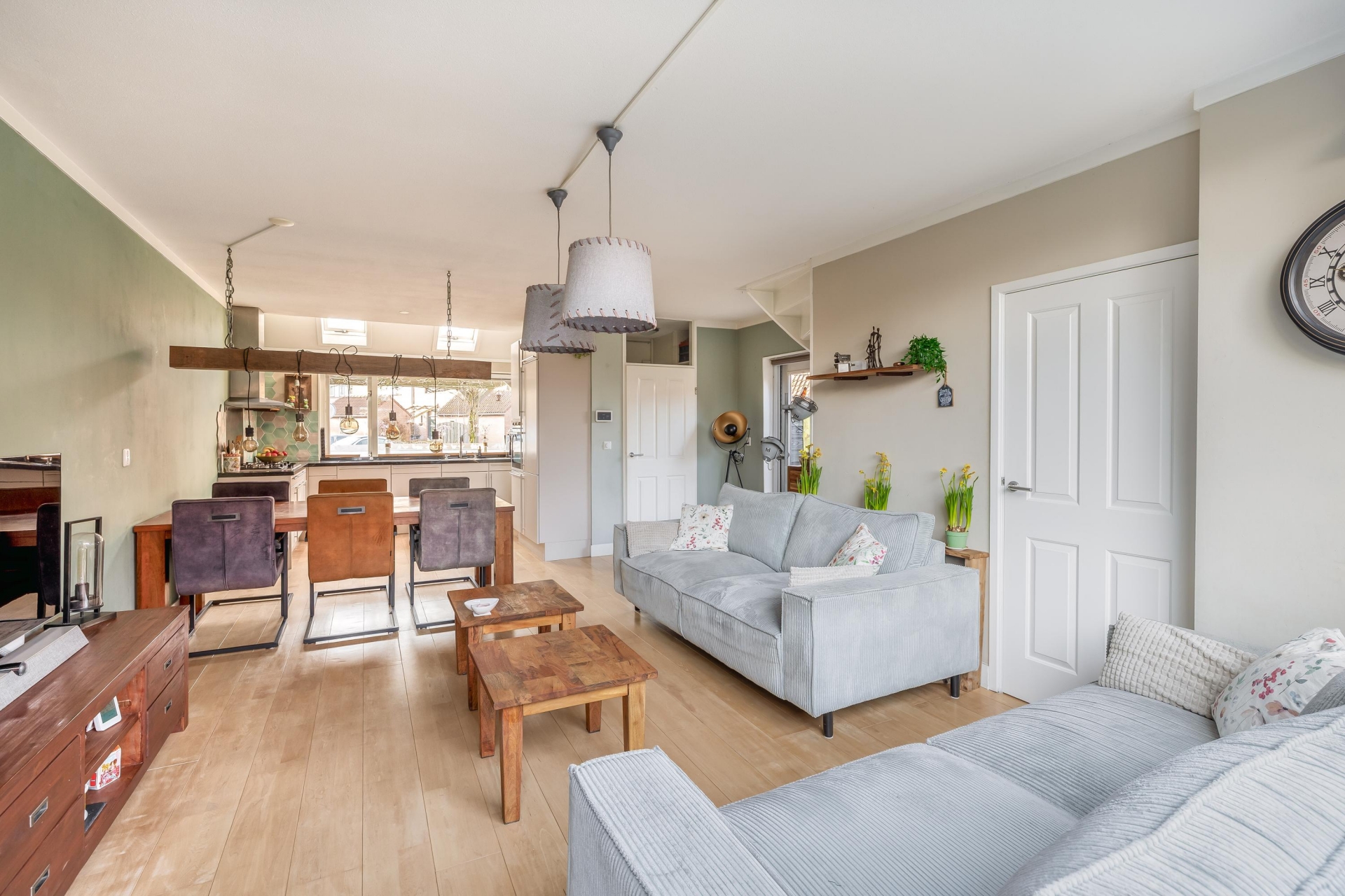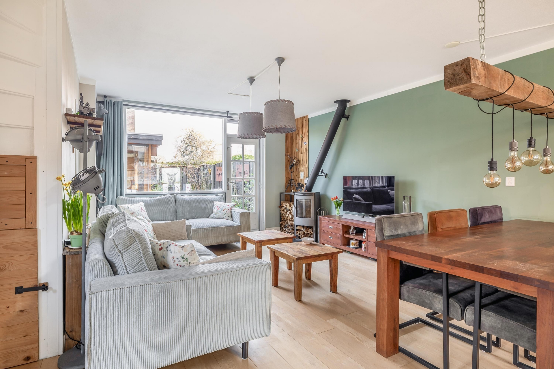 Het huis is door de jaren heen netjes onderhouden en modern afgewerkt. Binnen valt direct de lichte en warme sfeer op. De woonkamer is ruim opgezet en vormt samen met de eetkamer een fijne leefruimte waar je met een gezin comfortabel kunt wonen. De houtkachel zorgt voor extra sfeer tijdens de koudere maanden en maakt het een heerlijke plek om samen te komen.